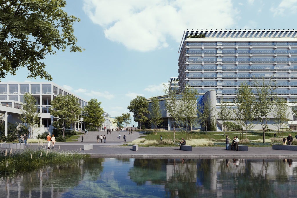 Durch den behutsamen Umgang mit den Bestandsstrukturen und die Anwendung ökologisch verträglicher Konstruktionsweisen gelingt es, den CO2-Fußabdruck gering zu halten. Photovoltaik-Anlagen auf begrünten Dächern sowie Biodiversität fördernde Außenanlagen mit Teichen, die Regenwasser speichern, tragen dazu ebenfalls bei – und schaffen gleichzeitig einen angenehmen und inspirierenden Ort.