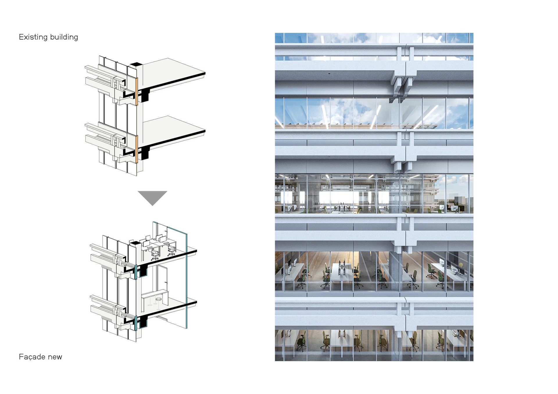 Bei der Sanierung des Hochhauses, das künftig die Fakultät Chemie beherbergt, werden nur wenige Eingriffe in die Struktur vorgenommen, welche durch aktuelle Brandschutzanforderungen notwendig sind. Innerhalb der erhaltenen baulichen Struktur sind die Laboreinheiten im Osten, zum Innenhof hin, angeordnet, während sich ein schmales Band mit Büroräumen im Westteil befindet. An der Gebäudehülle werden lediglich die Brüstungselemente ausgetauscht, um die thermischen Eigenschaften der Fassade zu verbessern. Dieser minimale Eingriff ermöglicht es, das markante Erscheinungsbild zu wahren und die Fassade je nach dahinterliegender Nutzung offener oder geschlossener zu gestalten.
