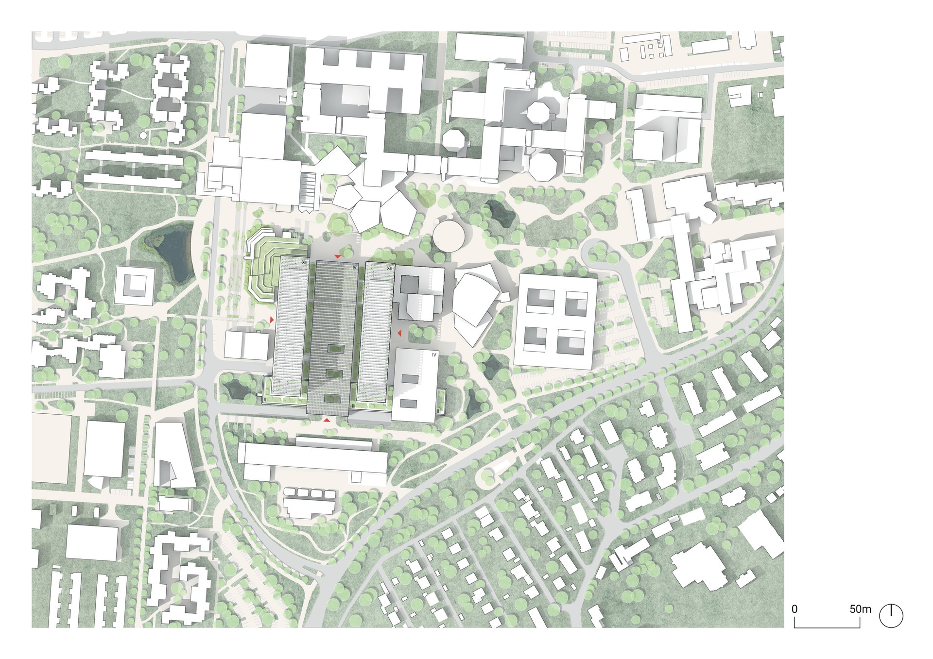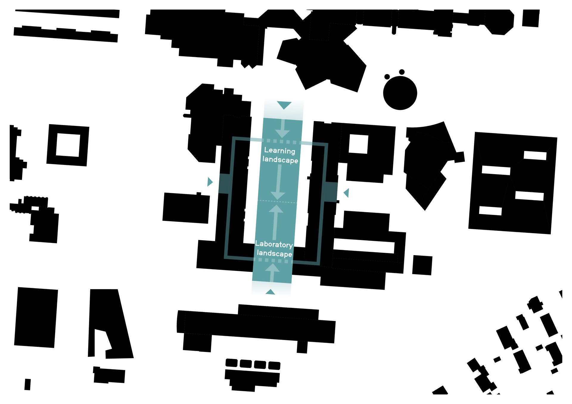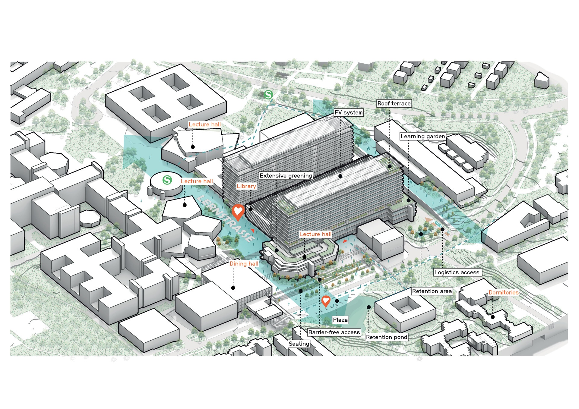 Grundgedanke der geplanten Modernisierung ist es, die bestehenden Strukturen so vollständig wie möglich zu erhalten und ihre architektonischen Qualitäten zu bewahren. Auch die städtebauliche Idee wird wiederbelebt: Die sogenannte Lernstraße aus den 1970er Jahren verläuft von Osten nach Westen durch den Campus und verbindet die universitären Einrichtungen. Sie wird in ihrer ursprünglichen Intention, einen Ort des Austausches und Verweilens zu bieten, gestärkt und weiterentwickelt. Durch den Rückbau von Anbauten wird sie wieder zur zentralen Achse, die den Campus mit zwei von Grün gesäumten Seen und dem westlich anschließenden Campus vernetzt. Terrassierte Sitzstufen und bepflanzte Böschungen schaffen dabei einen anregenden Außenraum für akademischen und sozialen Austausch, an den sich Hörsaalzentren, Mensa und S-Bahn-Station anschließen.