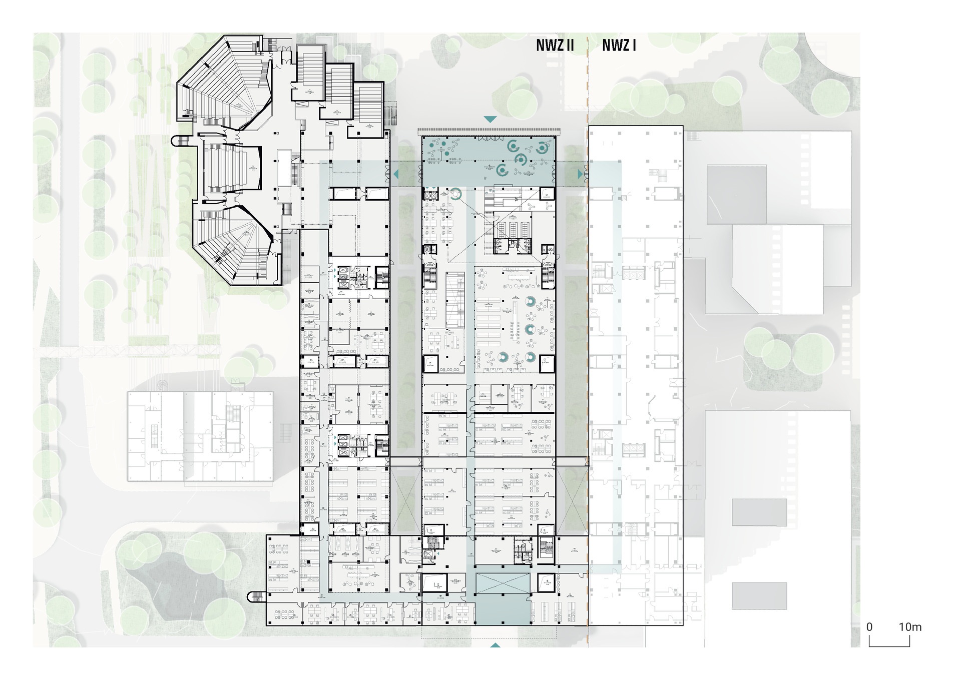 Zwischen den beiden Hochhausbauten entsteht ein flacher Neubau in Holzhybrid-Bauweise, der zukünftig den bestehenden Verbindungsriegel und die Lernstraße vernetzt. In diesem Baukörper wird eine neue, als Lernlandschaft konzipierte Bibliothek mit einer Laborlandschaft, die auch Chemie-Sonderlabore umfasst, und Räumen für Praktika zusammengeführt. Über einen einladenden neuen Haupteingang erreichen Studierende und Lehrende über die Lernstraße das gemeinsame Foyer. Von hier aus führt eine als Sitzlandschaft angelegte Treppe in die ruhigen Arbeitsbereiche der Bibliothek und hinunter in das Foyer des Westeingangs. In Zukunft kann über eine Brücke die bestehende Bibliothek im östlichen Hochhaus angeschlossen werden.