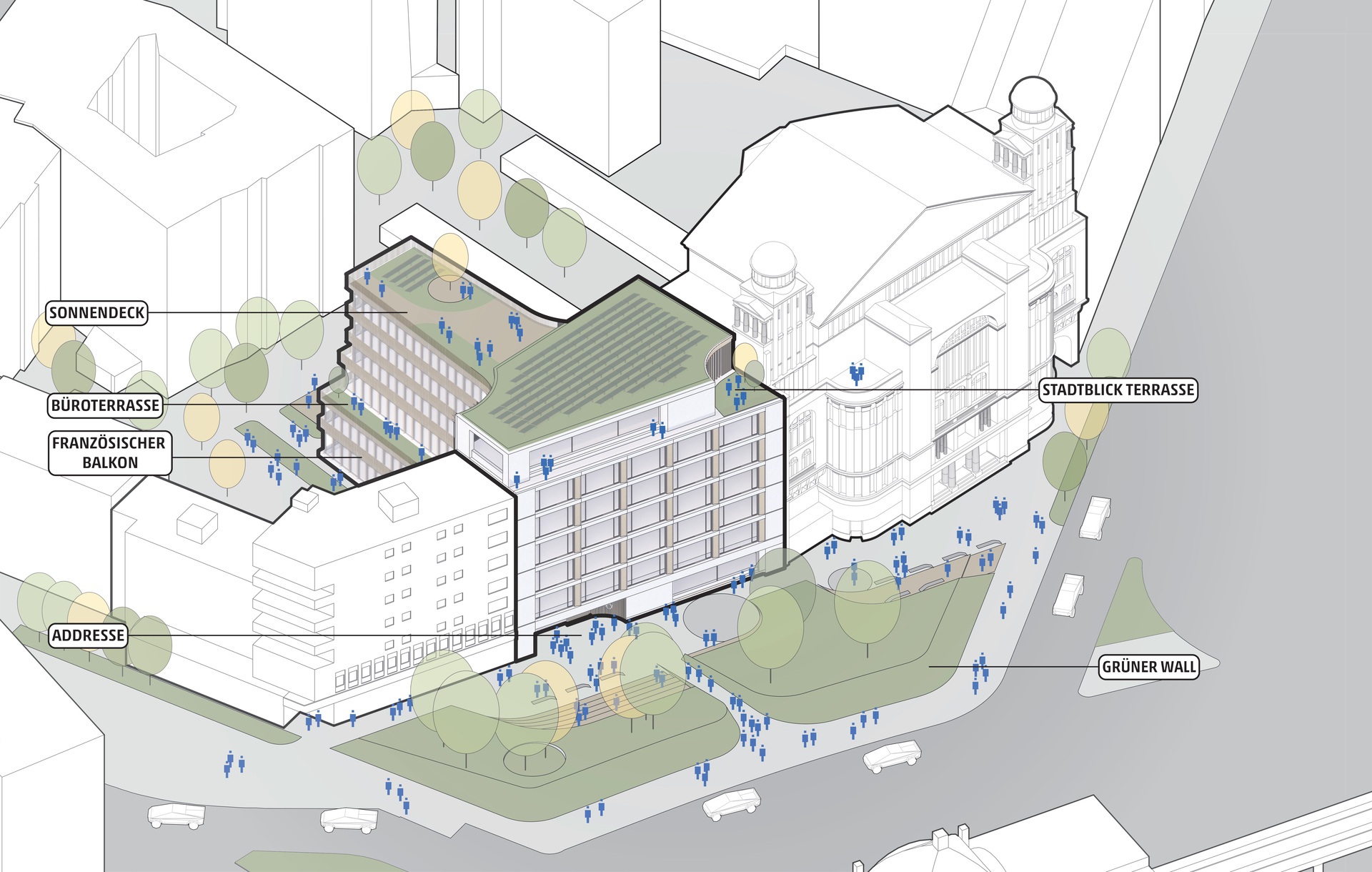 Über sechs Geschosse strecken sich bodentiefe Fenster und erlauben weite Ausblicke über den Platz. Von seinen beiden Nachbargebäuden übernimmt das Gebäude prominente Linienführungen und spiegelt besondere bauliche Elemente, wie zum Beispiel die rundlichen Erkerelemente und Türme des Theaters wider. So sind die Fassadenfenster und metallen gehaltenen Öffnungsflügel konkav gebogen und spiegeln den Himmel. Ebenso biegt das massiv wirkende Erdgeschoss zum Haupteingang nach innen ab und bietet einen geschützten Eingangsbereich. Im oberen Gebäudeteil wird eine Ecke im rückversetzten Dachgeschoss ausgespart: Dies setzt den benachbarten Turm in Szene und bietet den Nutzer*innen einen beliebten Dachgarten.