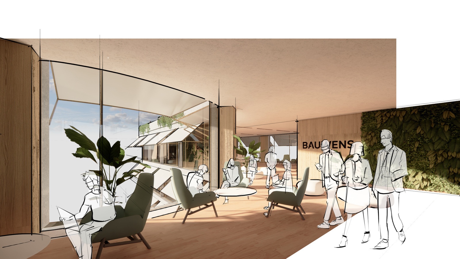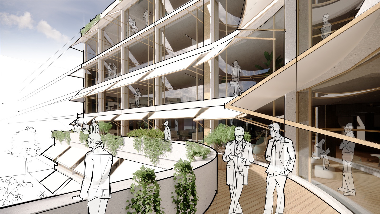 Ein besonderer Fokus liegt entsprechend auf der Nutzung lokaler Materialien. Somit ist eine mineralische Steinfassade aus Granit für das Gebäude vorgesehen. Holzrahmenfenster, mit einer aus recyceltem Kupfer erzeugten Bronzeverkleidung, ergänzen das optische Erscheinungsbild und tragen positiv zur CO2 Bilanzierung des Gebäudes bei. Auch der Innenbereich ist mir einer großflächigen Holzverkleidung ausgebildet.