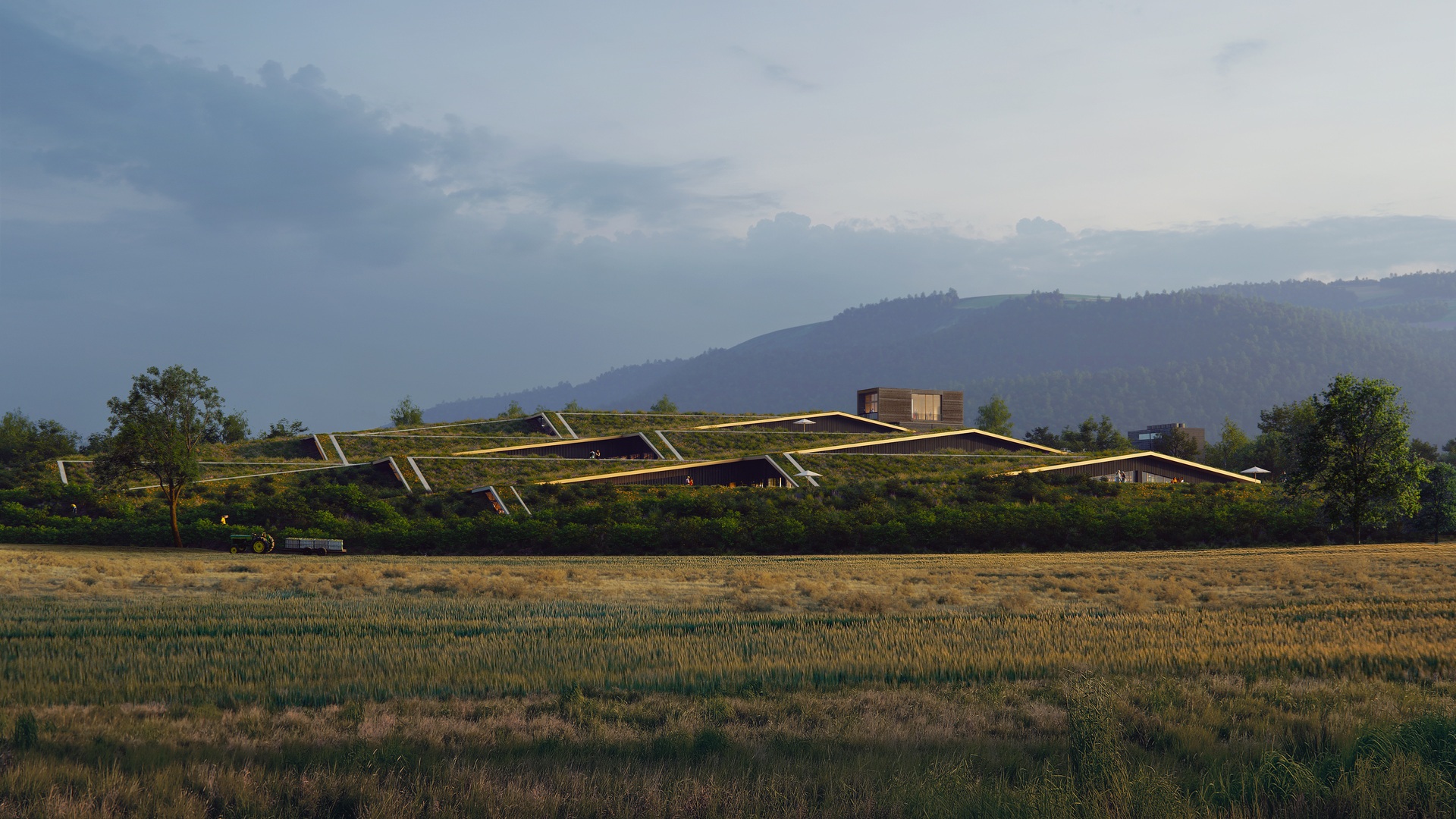 HENNs Vision für das Bauvorhaben teilt sich in zwei Phasen. Für den ersten Bauabschnitt ist die Erweiterung der Produktion und die Errichtung eines Besucherzentrums vorgesehen. Oberhalb eines durchgehenden Sockelgebäudes erheben sich begrünte Dächer terrassenartig bis zum Hochpunkt des Brennereiturmes. Durch die künstliche Topografie wurde eine elegante Lösung gefunden, die Landschaft wertschätzend im Kontext der Architektur widerzuspiegeln und eine Symbiose aus Baukörper und Natur herzustellen. Massive Holzträger stützen die angeschrägten Plateaus. Mithilfe großflächiger gläsernen Fassaden kommen spannende Aus- und Einblicke zustande und die Harmonie zwischen natürlicher Umgebung und dem umbauten Raum wird erneut akzentuiert.