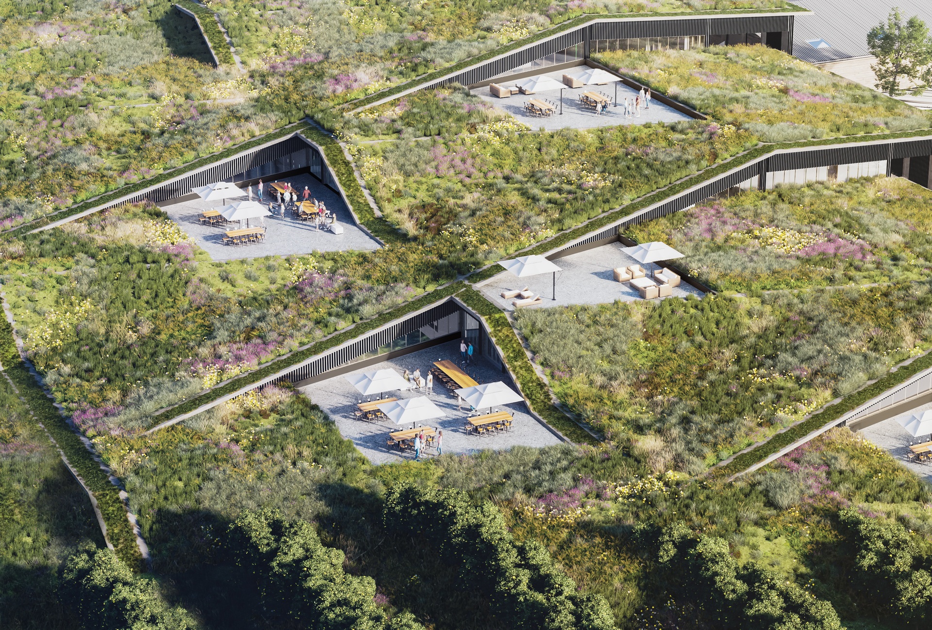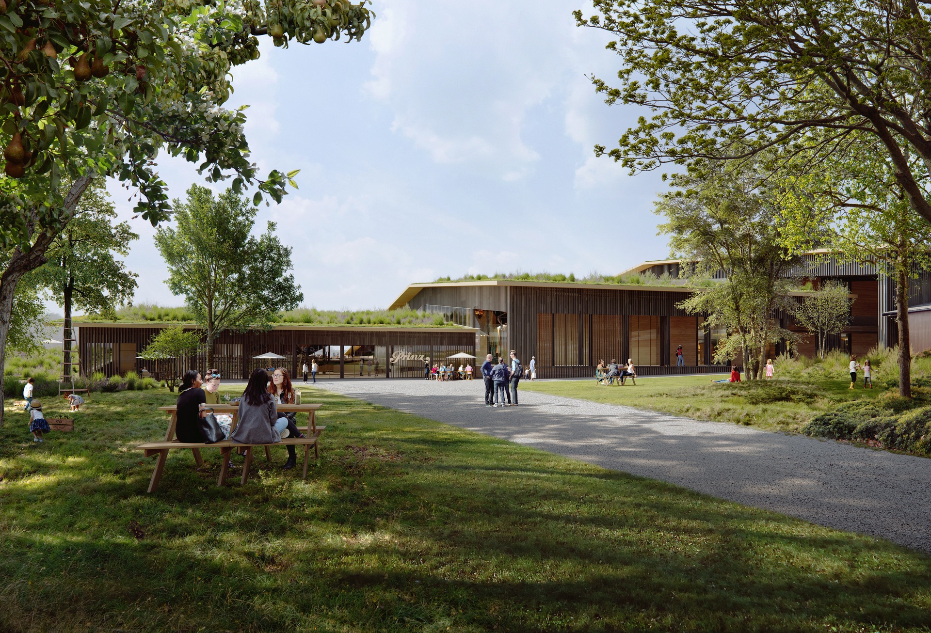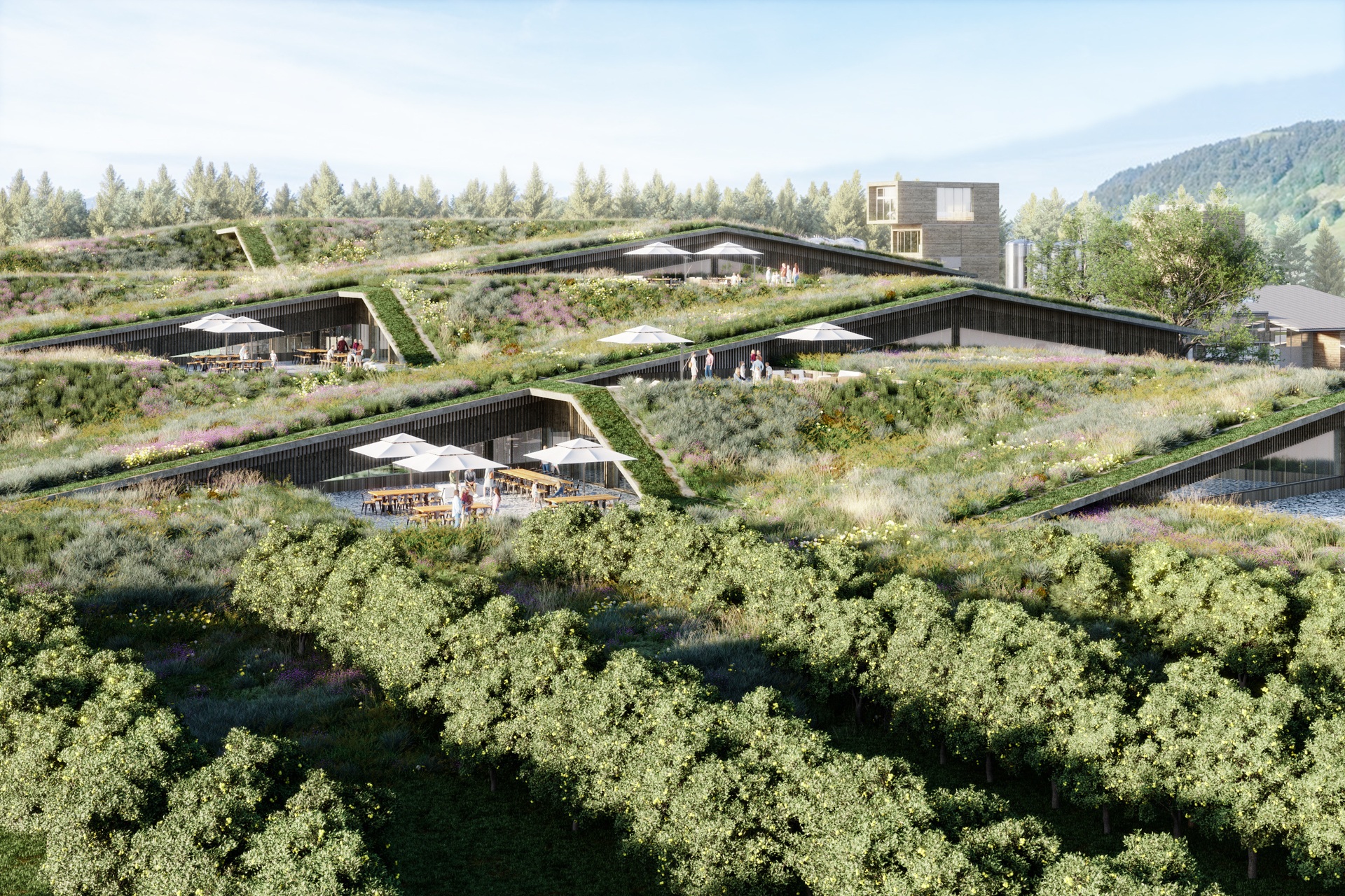 Die modulare Bauweise ermöglicht, dass in der zweiten Phase Produktionshallen und Tanklager nahtlos an das bestehende Objekt angegliedert werden können. Ebenerdig flacht die Erweiterung ab und imitiert einen sanften Hügel. Fließend gehen die Räumlichkeiten ineinander über und ermöglichen, dass Besucher*innen die Produktionsprozesse, vom Pressen der Früchte bis hin zum Abfüllen, hautnah erleben. Die organische Formensprache und die großflächigen Begrünungen assoziieren Natürlichkeit, Nachhaltigkeit und Langlebigkeit.