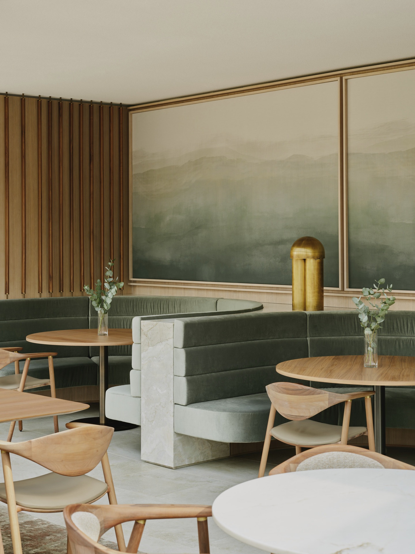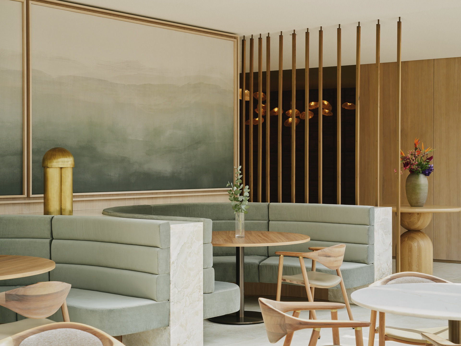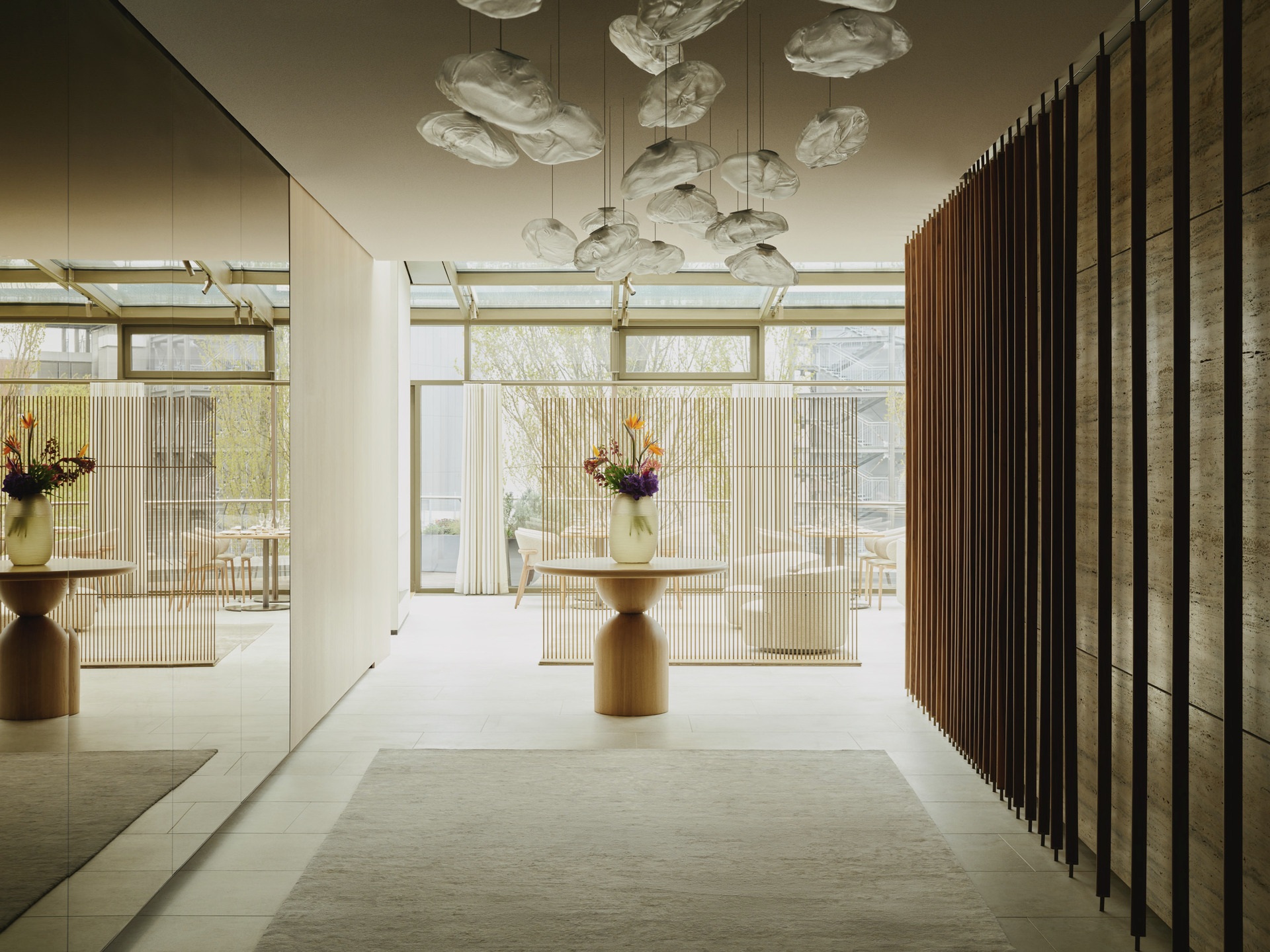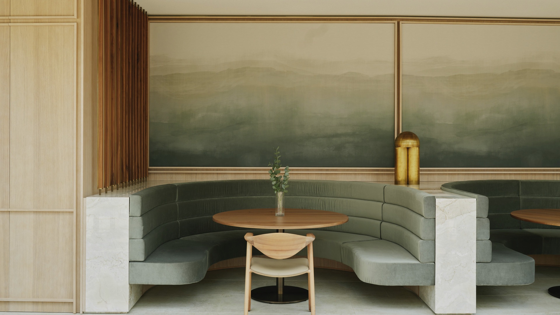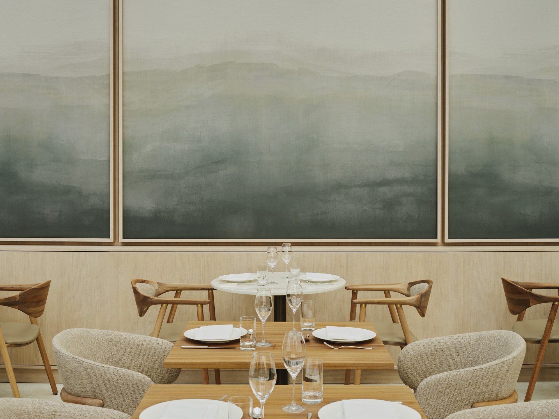 Jeder Bereich ist bis ins Detail mit einem individuellen Farb- und Materialkonzept abgestimmt. Dabei setzt HENN auf handwerkliche Details: Im Eingangsbereich erinnern Travertin-Natursteinplatten an den Wänden an Sanddünen. An der Decke schweben Pendelleuchten aus unregelmäßig mundgeblasenem Glas wie rundgeschliffenes Meerglas und sorgen für eine subtile Asymmetrie mit einem interessanten Schattenspiel. Zwischen den Sitznischen platziert, wirken die Messing-Tischleuchten wie Skulpturen. Die Teppiche im Eingangsbereich und der Lounge sind handgeknüpft, der geschwungene 16 Meter lange Teppich im mittleren Speisesaal wurde speziell für diesen Raum angefertigt. Die Akustik-Wandpaneele sind in individuell bedrucktes Textil gehüllt, die aus Original-Aquarellen von HENN entstanden sind.