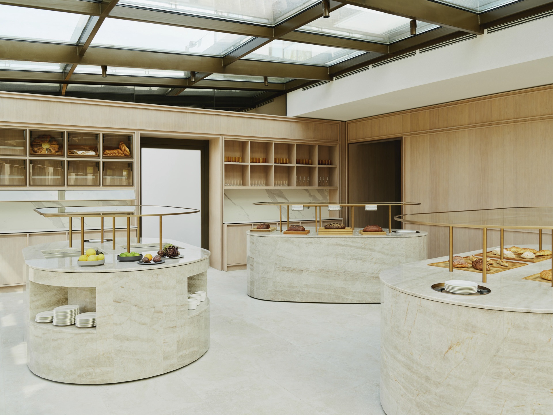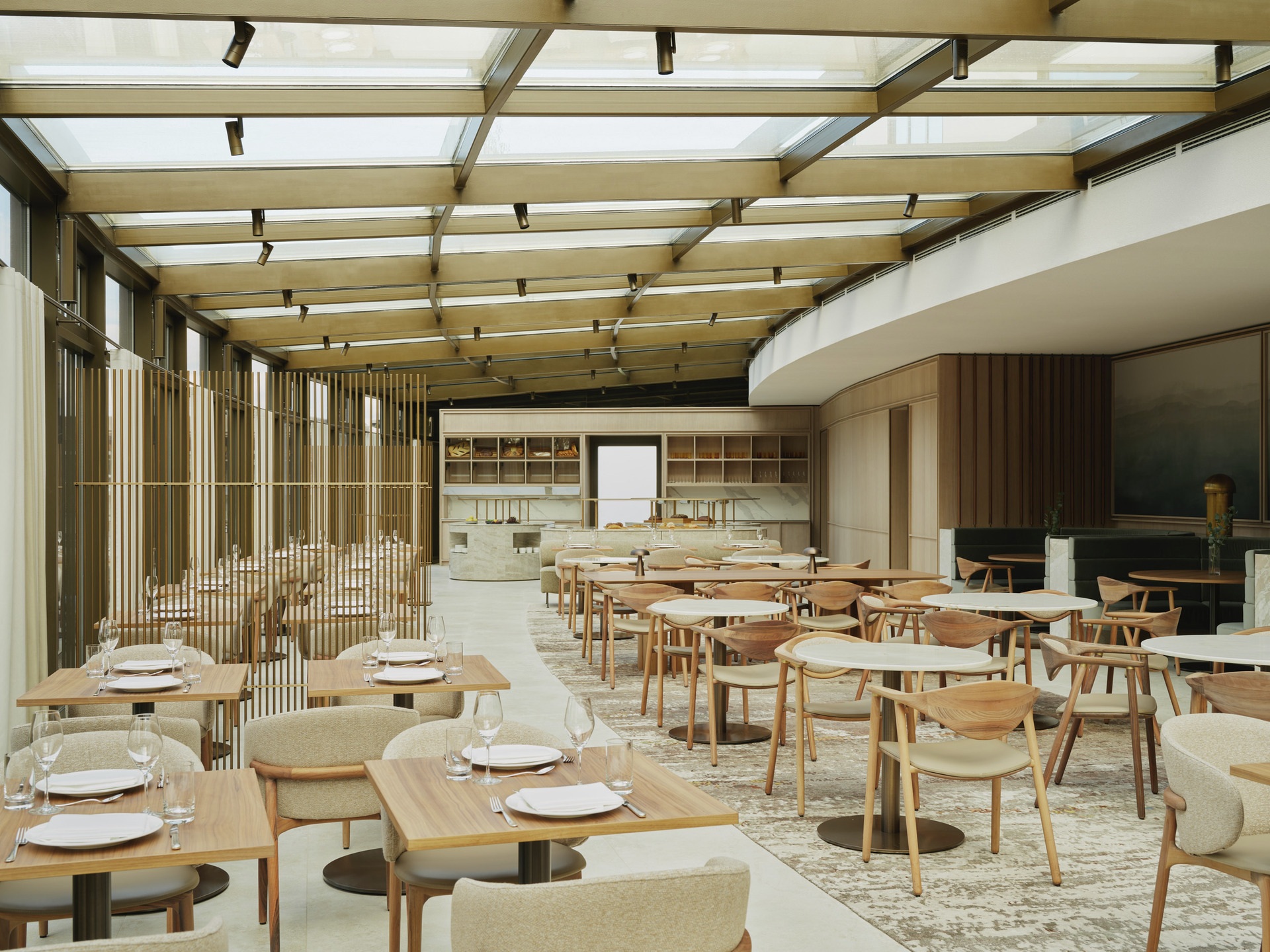 Mit Farben, Formen und Texturen führt der Raum wie durch eine maritime Landschaft von einer Sanddüne zum mit Kieselsteinen bedeckten Meeresufer. Eine ruhige Lounge ist durch einen freistehenden Kamin wie ein Separee abgetrennt. Im zentralen Speisesaal nehmen Gäste an den freistehenden Tischen Platz. Mehr Privatsphäre bieten vier Sitznischen an der Innenwand im rückwärtigen Bereich. Drei mit hellem Naturstein verkleidete Buffetinseln an der Stirnseite des Raums definieren die dritte Zone und erinnern in ihrer ovalen, organischen Form an Steine, die von den Wellen glatt geschliffen wurden.