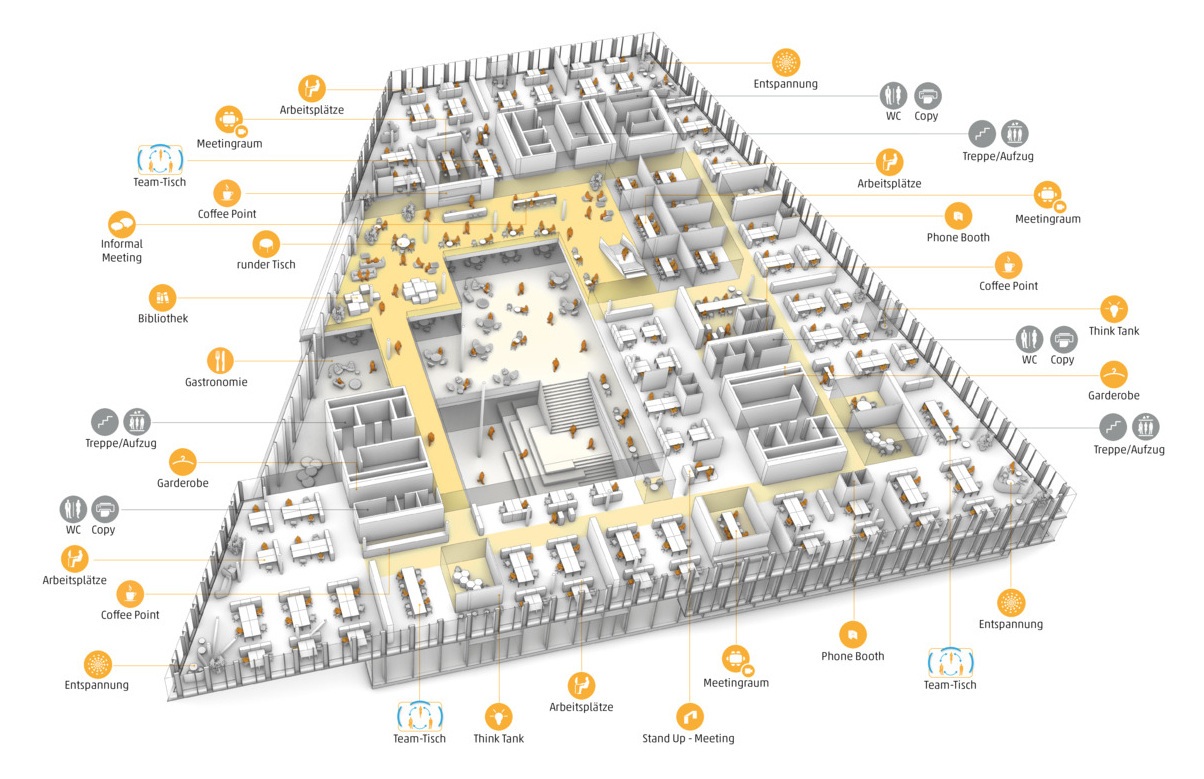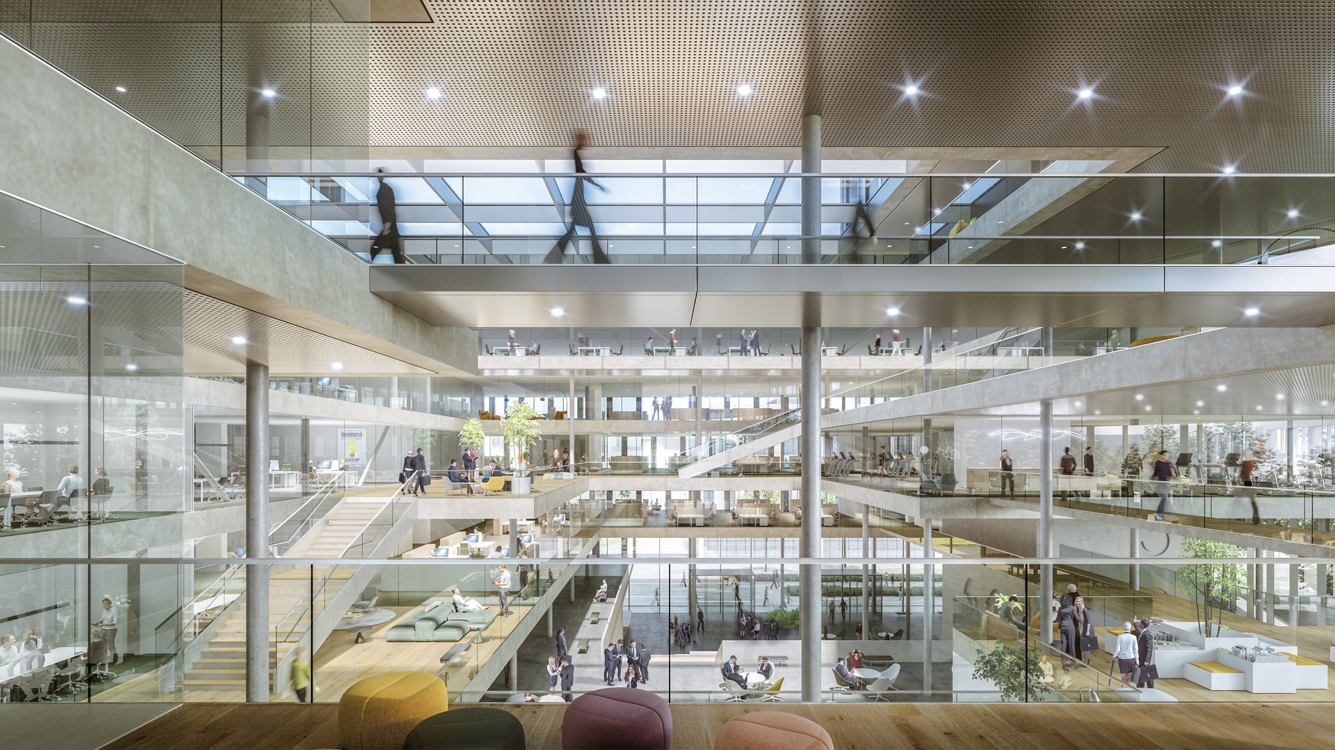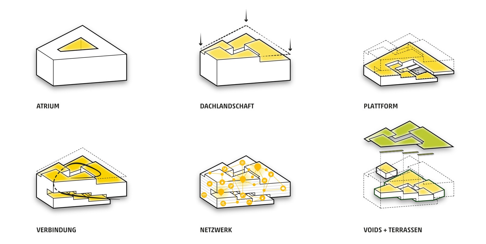 Ein fließender Übergang aus dem städtischen Raum in das Atrium des Campus, welcher sich als Raumkontinuum bis zum individuellen Arbeitsplatz und auf die Dachterrassen hin ausdehnt, ist identitätsstiftendes Element des Innenraums und der Aussengestalt. Es entsteht eine dreidimensionale Plaza welche mehrere Geschosse durch diesen Luftraum zoniert, Büroflächen rhythmisiert und in Nachbarschaften gliedert. Die unteren Geschosse verschmelzen zu großzügigen, flexibel gestaltbaren Nutzungsbereichen und wandeln sich in den oberen Geschoßen zu modernen Bürowelten.