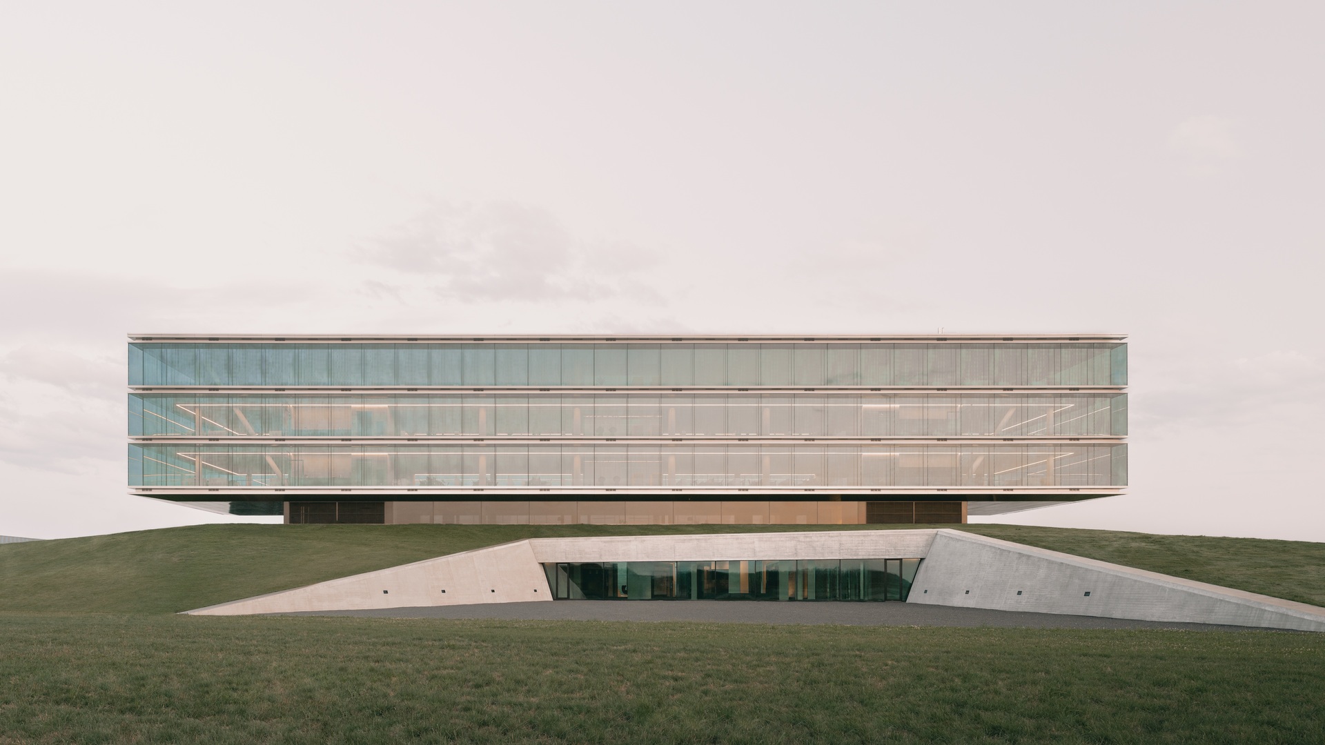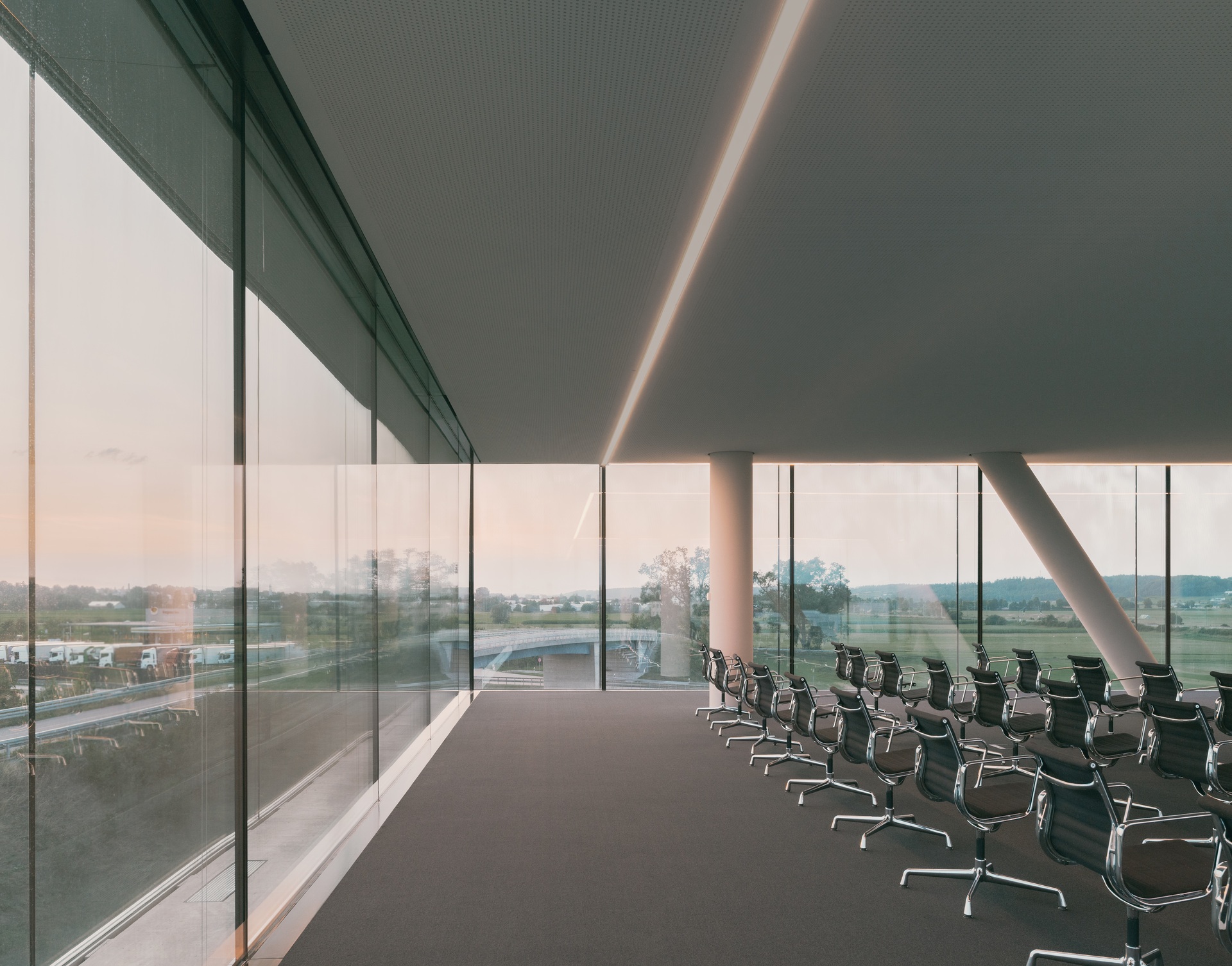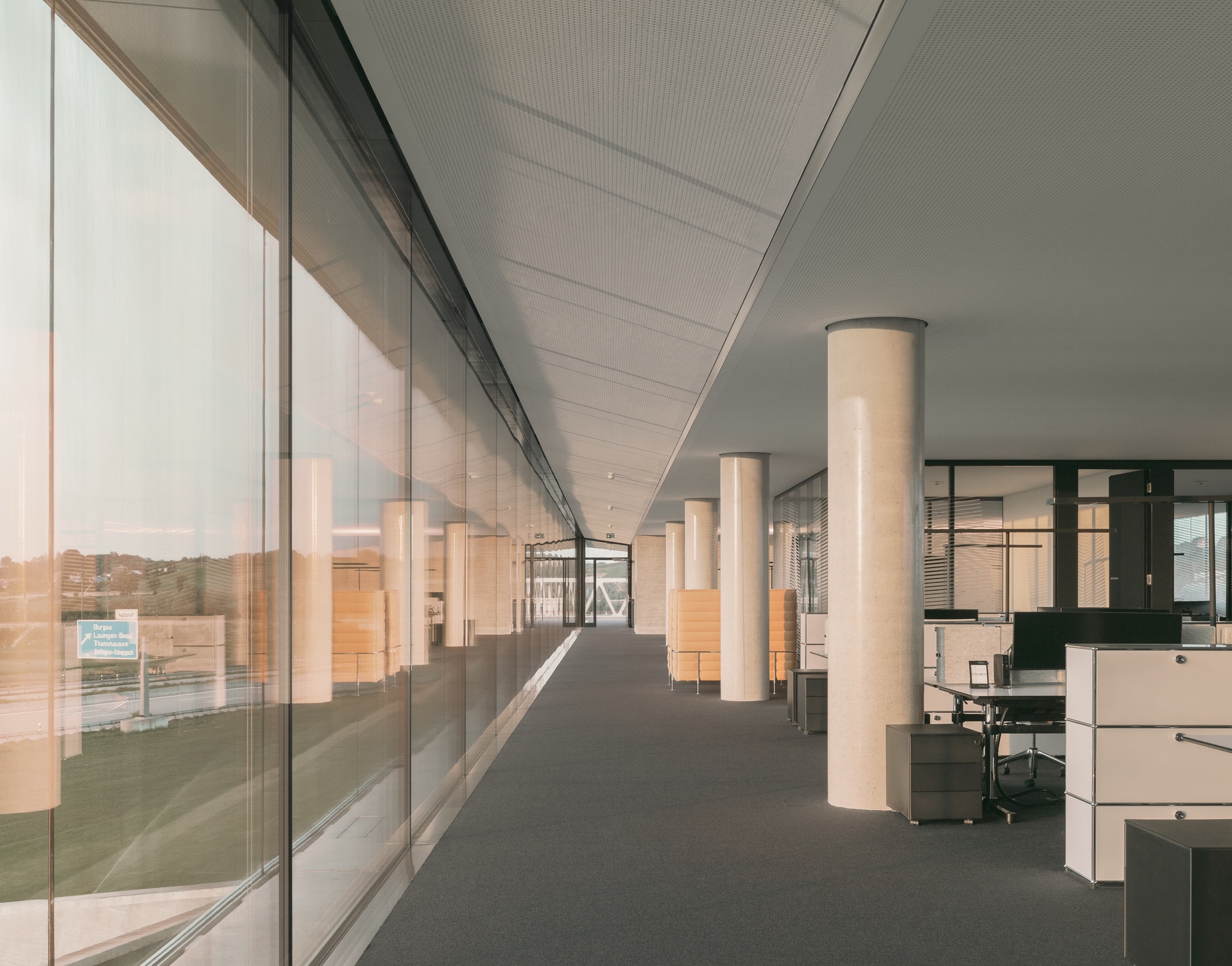 Die Lage des Baugrundstücks an der A8 und die Wahrnehmung des Gebäudes vom Auto aus sind besonders relevant für den Entwurf. Das Erdgeschoss ist in die begrünte Schallschutz-Böschung eingelassen, die das Unternehmensareal zur Autobahn hin begrenzt. Ein Geländeeinschnitt führt zum Empfang, von dort erreicht man eine Ausstellungsfläche sowie Showrooms, Technikräume und das Mitarbeiterrestaurant. Geneigte Wände und gefaltete Stahldecken prägen hier das Erscheinungsbild. Die Konferenzebene darüber ist deutlich zurückgesetzt, so dass der 100 Meter lange, dreigeschossige Büroriegel weit auskragt und zu schweben scheint. Sichtbeton und präzise Stahlbänder mit Schattenfugen umlaufen die Geschossebenen und verleihen den vollverglasten Fassaden einen eleganten Ausdruck. Diagonale, geschossübergreifende Druckstäbe an den beiden Kernen nehmen die Lasten der Auskragungen auf. Die offenen, stützenfreien Büroetagen erhalten von mehreren Seiten Tageslicht. Durch die Doppelfassaden reicht der Blick bis zur Schwäbischen Alb.
