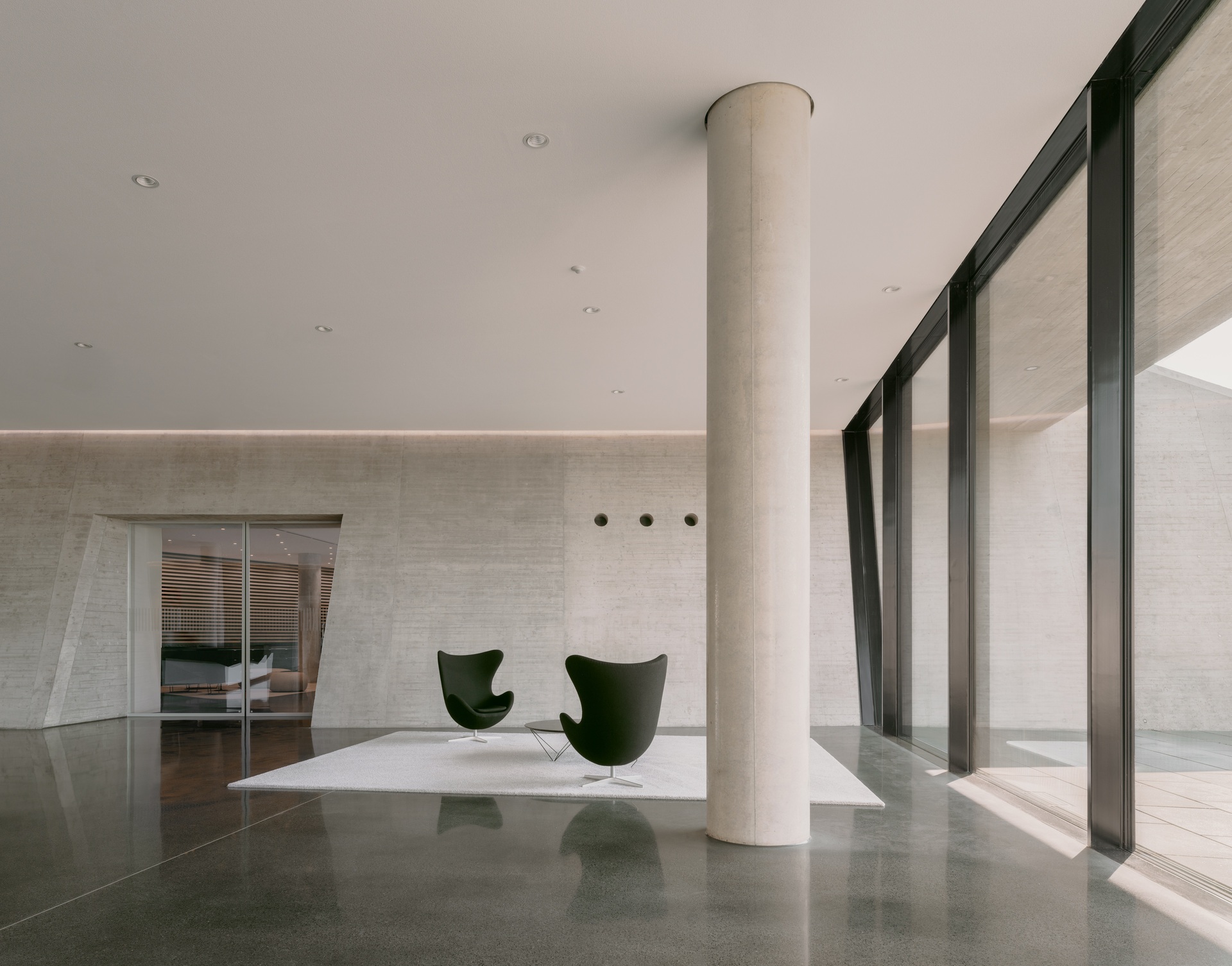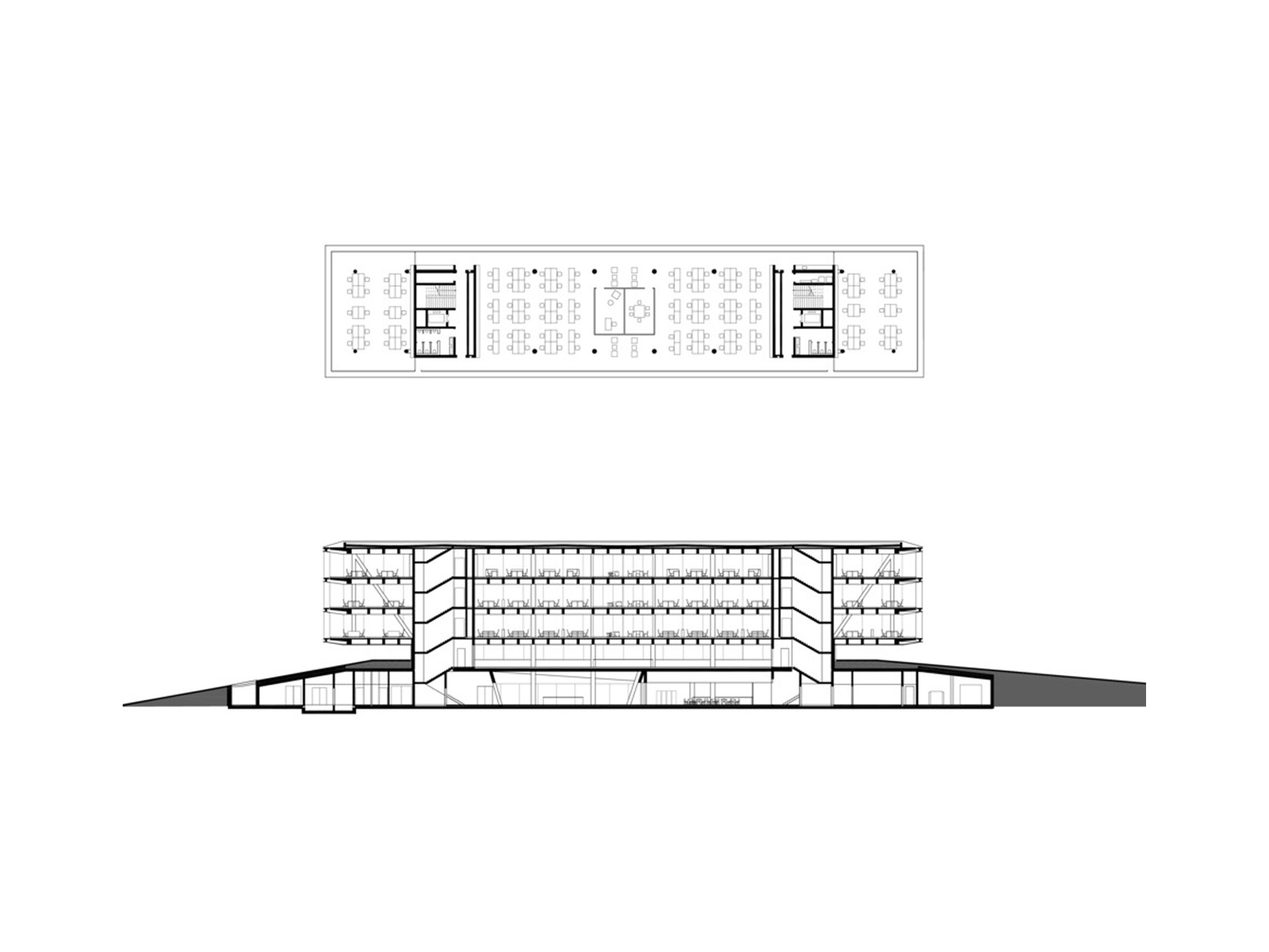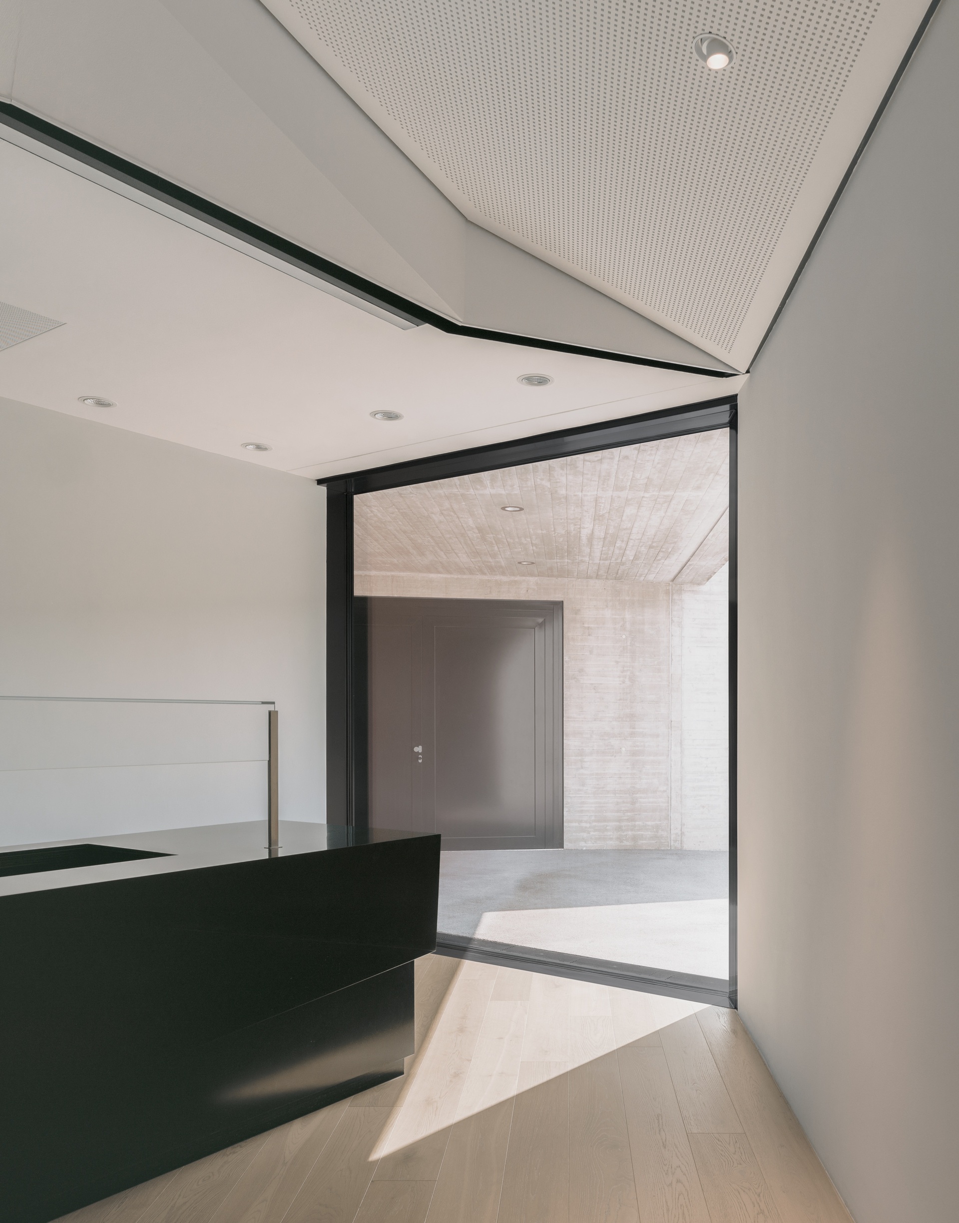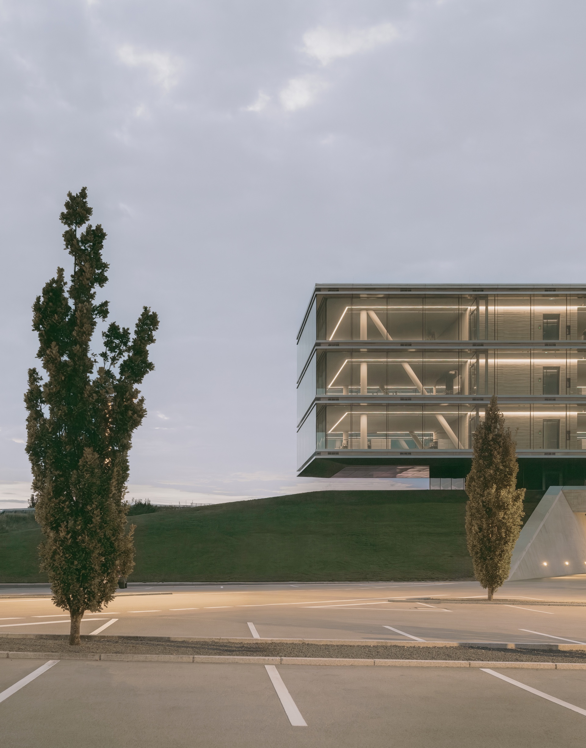 Die Lage des Baugrundstücks an der A8 und die Wahrnehmung des Gebäudes vom Auto aus sind besonders relevant für den Entwurf. Das Erdgeschoss ist in die begrünte Schallschutz-Böschung eingelassen, die das Unternehmensareal zur Autobahn hin begrenzt. Ein Geländeeinschnitt führt zum Empfang, von dort erreicht man eine Ausstellungsfläche sowie Showrooms, Technikräume und das Mitarbeiterrestaurant. Geneigte Wände und gefaltete Stahldecken prägen hier das Erscheinungsbild. Die Konferenzebene darüber ist deutlich zurückgesetzt, so dass der 100 Meter lange, dreigeschossige Büroriegel weit auskragt und zu schweben scheint. Sichtbeton und präzise Stahlbänder mit Schattenfugen umlaufen die Geschossebenen und verleihen den vollverglasten Fassaden einen eleganten Ausdruck. Diagonale, geschossübergreifende Druckstäbe an den beiden Kernen nehmen die Lasten der Auskragungen auf. Die offenen, stützenfreien Büroetagen erhalten von mehreren Seiten Tageslicht. Durch die Doppelfassaden reicht der Blick bis zur Schwäbischen Alb.