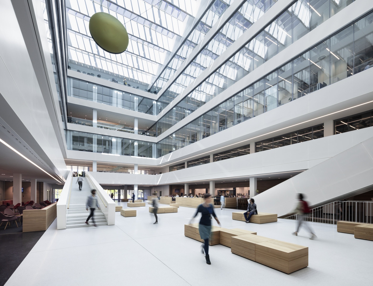 Die sechs Geschosse des Gebäudes mit insgesamt 37.900 m² Fläche gruppieren sich um ein zentrales Atrium, das die einzelnen Etagen und Divisionen durch Sichtachsen miteinander verbindet und zum pulsierenden Mittelpunkt des Gebäudes wird. Der helle, überdachte Raum streckt sich bis unters Dach und lenkt Tageslicht in die Innenräume.