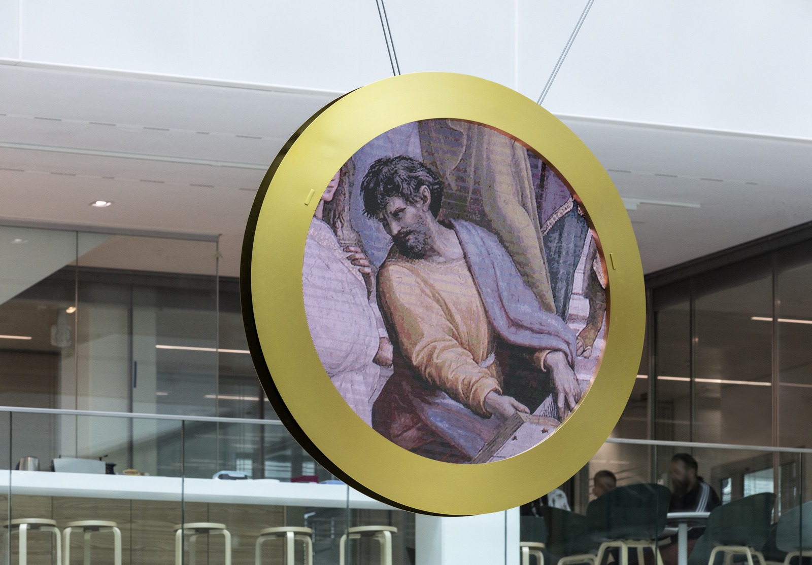 Gegenüber des zentralen Eingangs hängt inmitten des Atriums ein vergoldeter Ring, der mit einem Bildschirm ausgefüllt ist und sich als kinetisches Pendel durch den Raum bewegt. Dabei fährt das Kunstwerk von ART+COM das unsichtbar im Raum hängende Gemälde "Die Schule in Athen" ab und enthüllt es nach und nach.