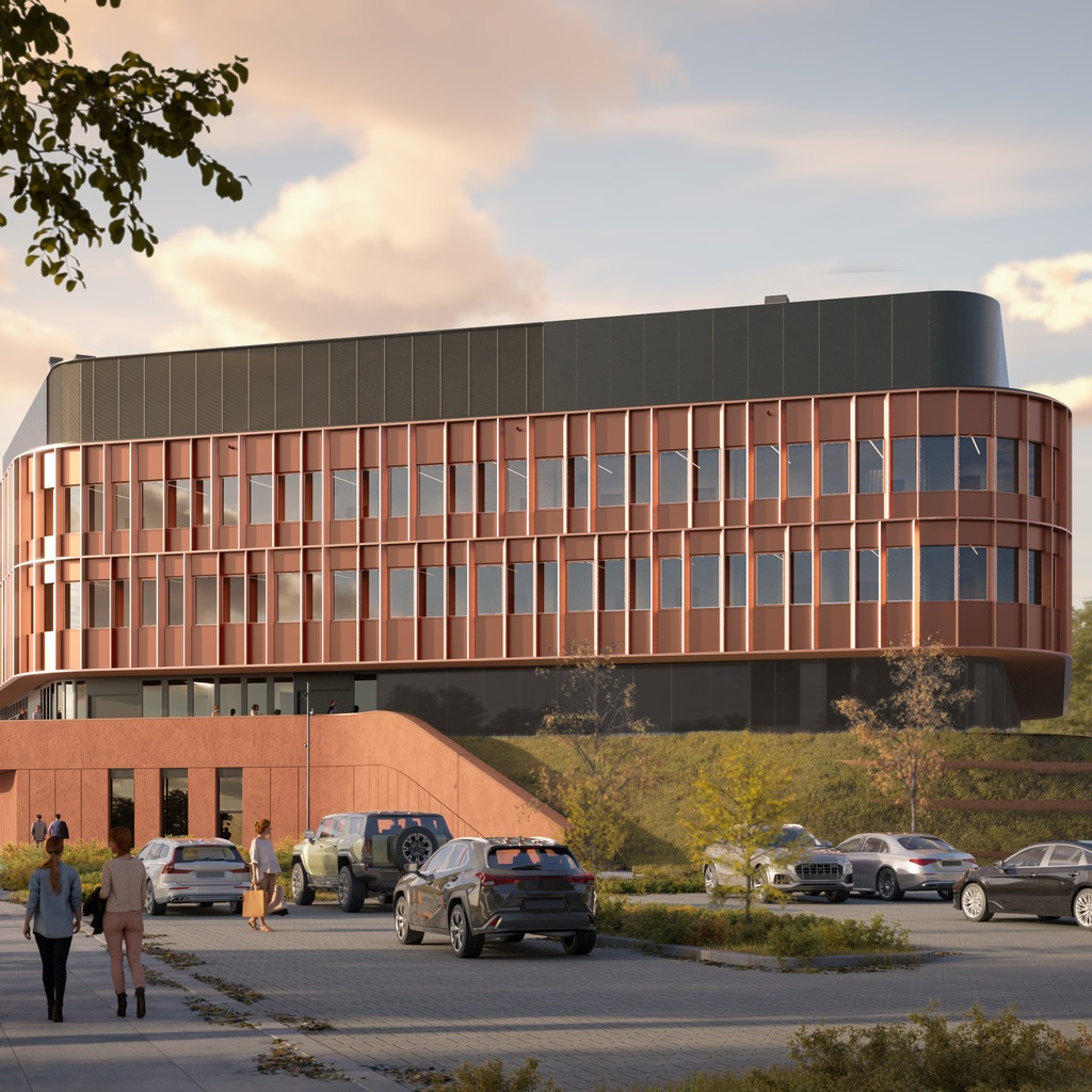 Die zukunftsorientierte Ausrichtung der Leibniz Universität Hannover übersetzte HENN visuell mithilfe der technisch-modern anmutenden Fassadenstruktur. Der Skelettbau erhält eine einheitliche Hülle aus geschosshohen Blechelementen mit hochwetterfester Beschichtung in metallischer Optik. Abwechselnde Kant-Geometrien und horizontal durchlaufende Profile strukturieren die Fassade.