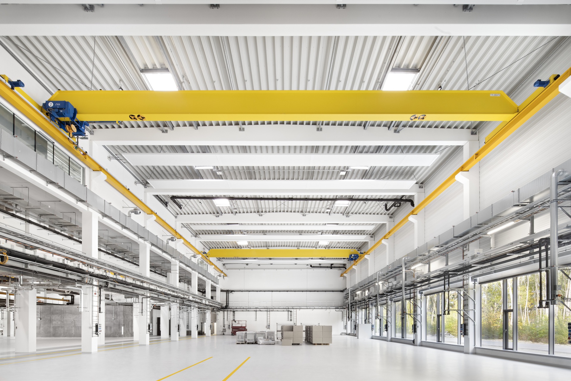 Im zweiten Obergeschoss wird die Halle von einem eingeschobenen Galeriegeschoss geteilt, das als gemeinschaftliche Bürofläche dient. Verglaste Einschnitte ermöglichen den Mitarbeitenden Einblicke in die Produktionshallen und auf die beiden eingesetzten Dachterrassen.