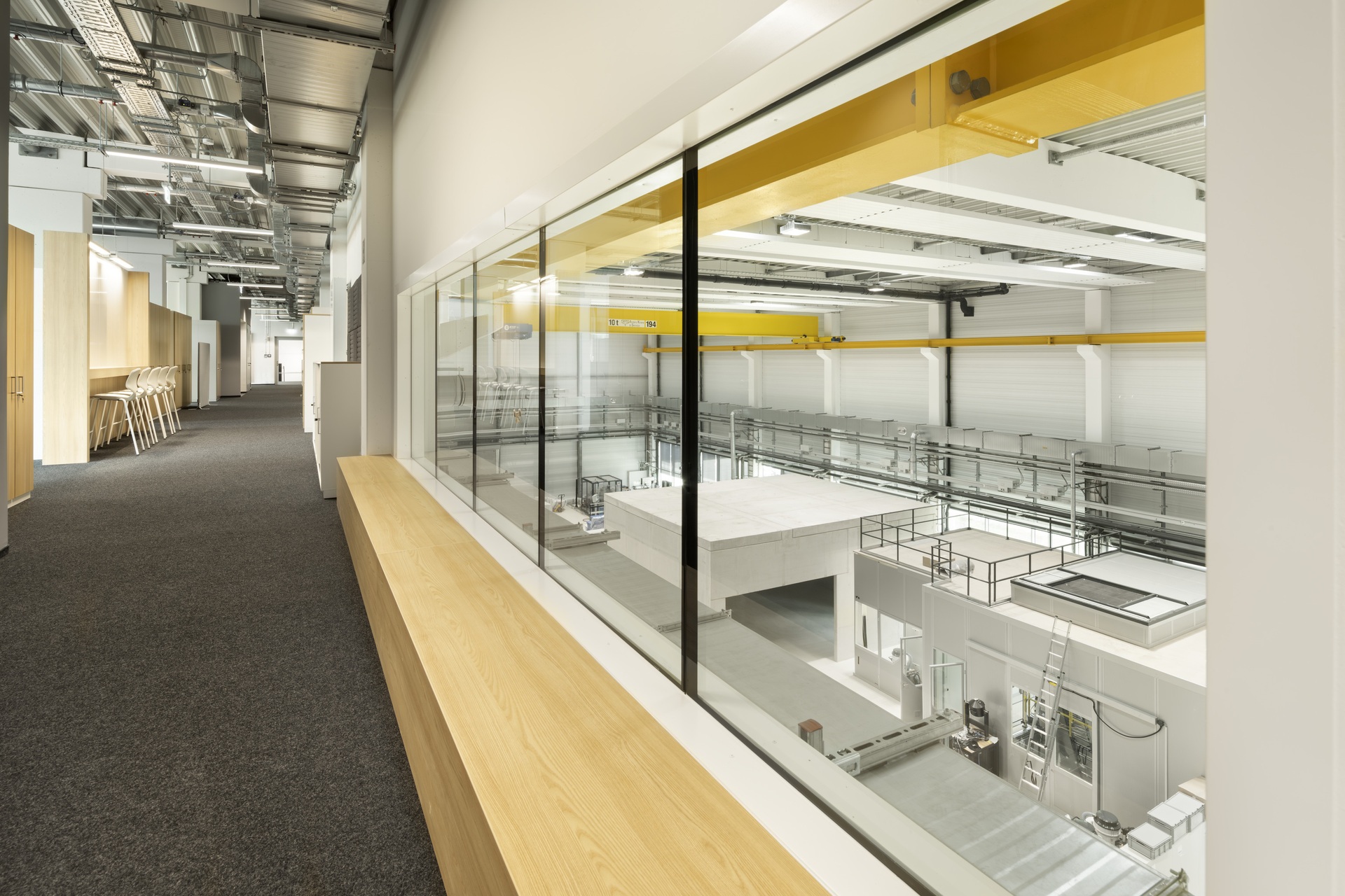 Das Projekt umfasst Testflächen sowie Labore und Büroflächen für rund 160 Forschende, Techniker*innen und Studierende. Im Erdgeschoss des Skelettbaus befindet sich eine große Versuchshalle, die aus drei Hallenschiffen besteht. Die beiden äußeren Hallenschiffe haben eine lichte Höhe unter Kranhaken von zehn Metern, die Höhe des mittleren Hallenbereichs beträgt fünf Meter. Die Halle bietet zentrale Versuchsflächen, die auf die Bedürfnisse der gemeinschaftlichen Forschungsprojekte der Institute zugeschnitten sind. Entlang der Fassade am Haupteingang erstrecken sich über alle drei Geschosse Büros und Konferenzräume.