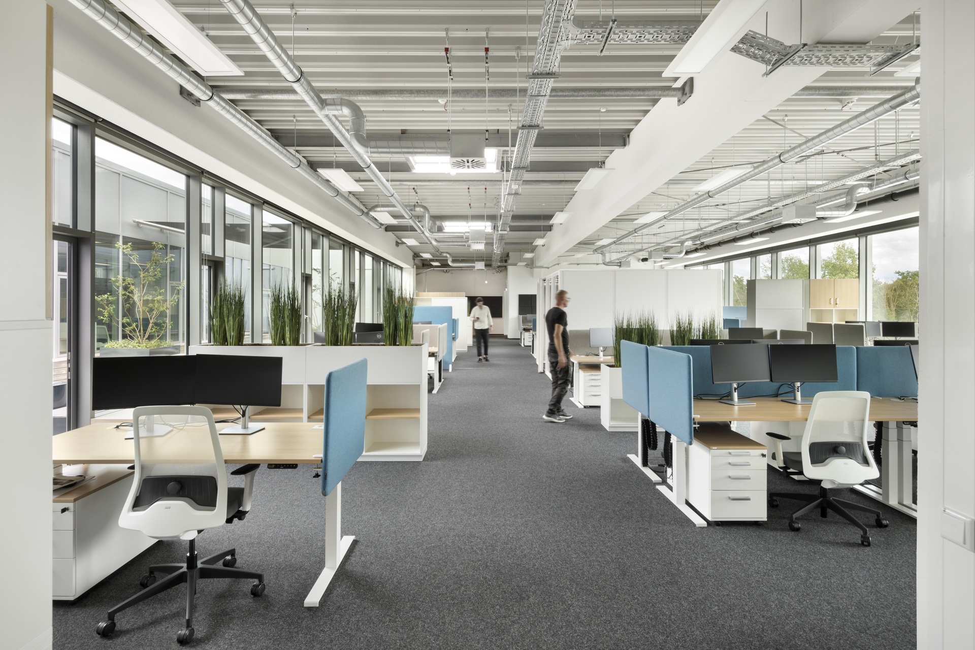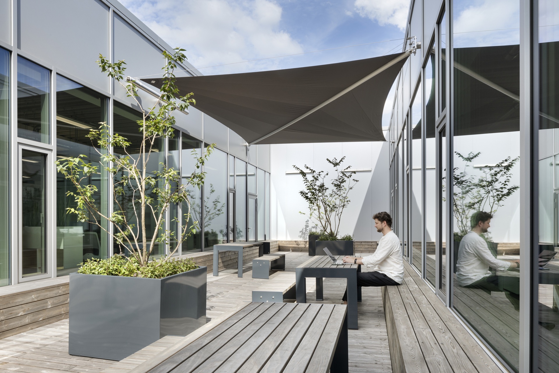 Die atriumähnlichen Einschnitte gliedern den offenen Raum und bieten die angenehme Option, den Arbeitsplatz nach draußen zu verlagern, was die Konzentration und das Wohlbefinden der Belegschaft steigert.