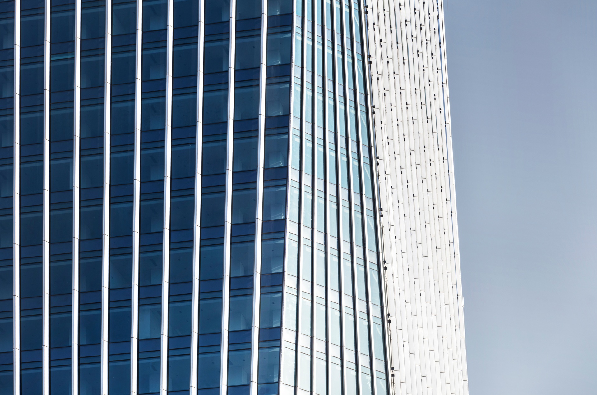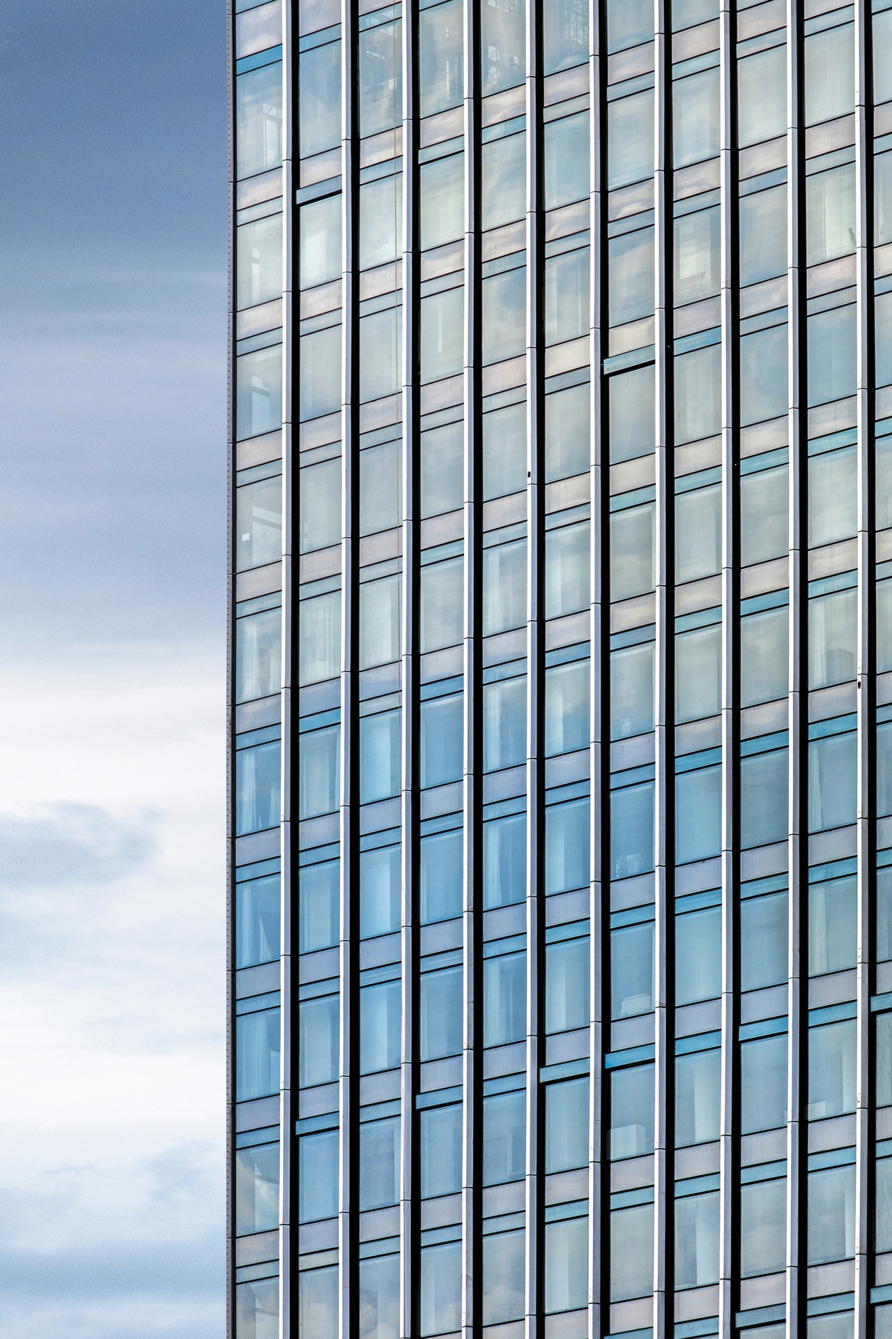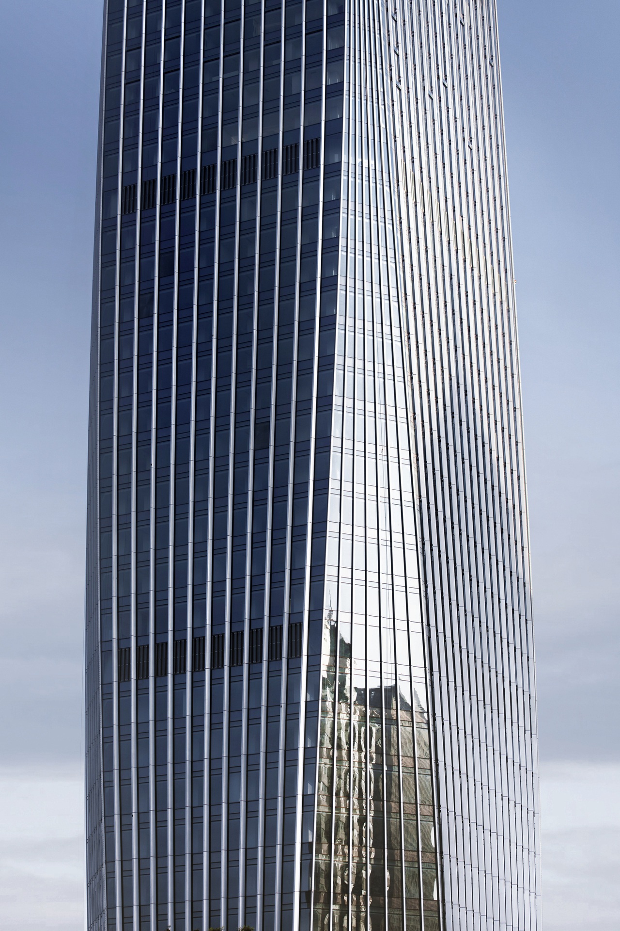 Die Glasfassade des Hochhauses ist durch ein einheitliches Gestaltungsprinzip rhythmisiert. Schmale Lisenen gliedern die Fassadenflächen und strecken sich als durchgängige Bänder bis zur Turmspitze. Die Metallelemente strukturieren die Teilfassaden in einer vertikalen Gegenbewegung aus sich verjüngenden und breiter werdenden Intervallen. Ihr wechselnder Rhythmus sorgt für ein spannungsreiches Erscheinungsbild, das die Kubatur des Hochhauses betont.