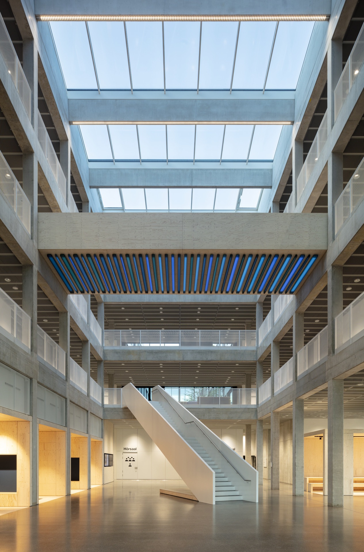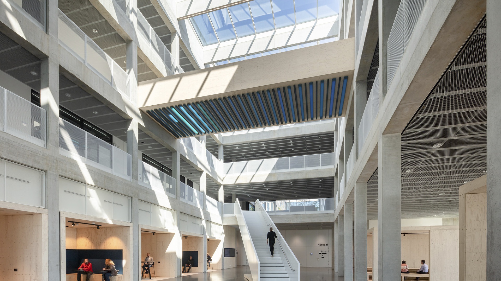 Herzstück des Neubaus ist ein zentrales, öffentliches Forum, um das sich die vier Fakultätsgebäude gruppieren. Das Forum besteht aus einer gläsernen Halle, die die einzelnen Gebäude verbindet. Alle Gebäude werden über das Forum betreten, das aus allen Richtungen zugänglich ist. Es funktioniert wie ein öffentlicher Platz, auf dem sich die Studierenden und Lehrenden ungezwungen treffen und aufhalten können. Dieser Ort wird von allen gemeinsam genutzt und regt bei den alltäglichen Wegen und Begegnungen zwanglosen informellen Austausch an und fördert damit interdisziplinäre Zusammenarbeit. Bei großen Veranstaltungen, wie Ausstellungen und Festen, wird hier die Identität der Fakultät für die Öffentlichkeit sichtbar. Die Möglichkeiten der Begegnung setzen sich im Weiteren wie eine räumliche Sequenz in den Gebäuden fort. Informelle Orte wie Atrien und Innenhöfe, die das Gebäudeinnere gliedern, ermöglichen eine interdisziplinäre und zufällige Kommunikation. Verschiedene zusätzliche Raumelemente wie Stege oder Nischen bieten größeren Gruppen bis hin zu kleinen Lerngemeinschaften Aufenthaltsmöglichkeiten um sich auszutauschen.