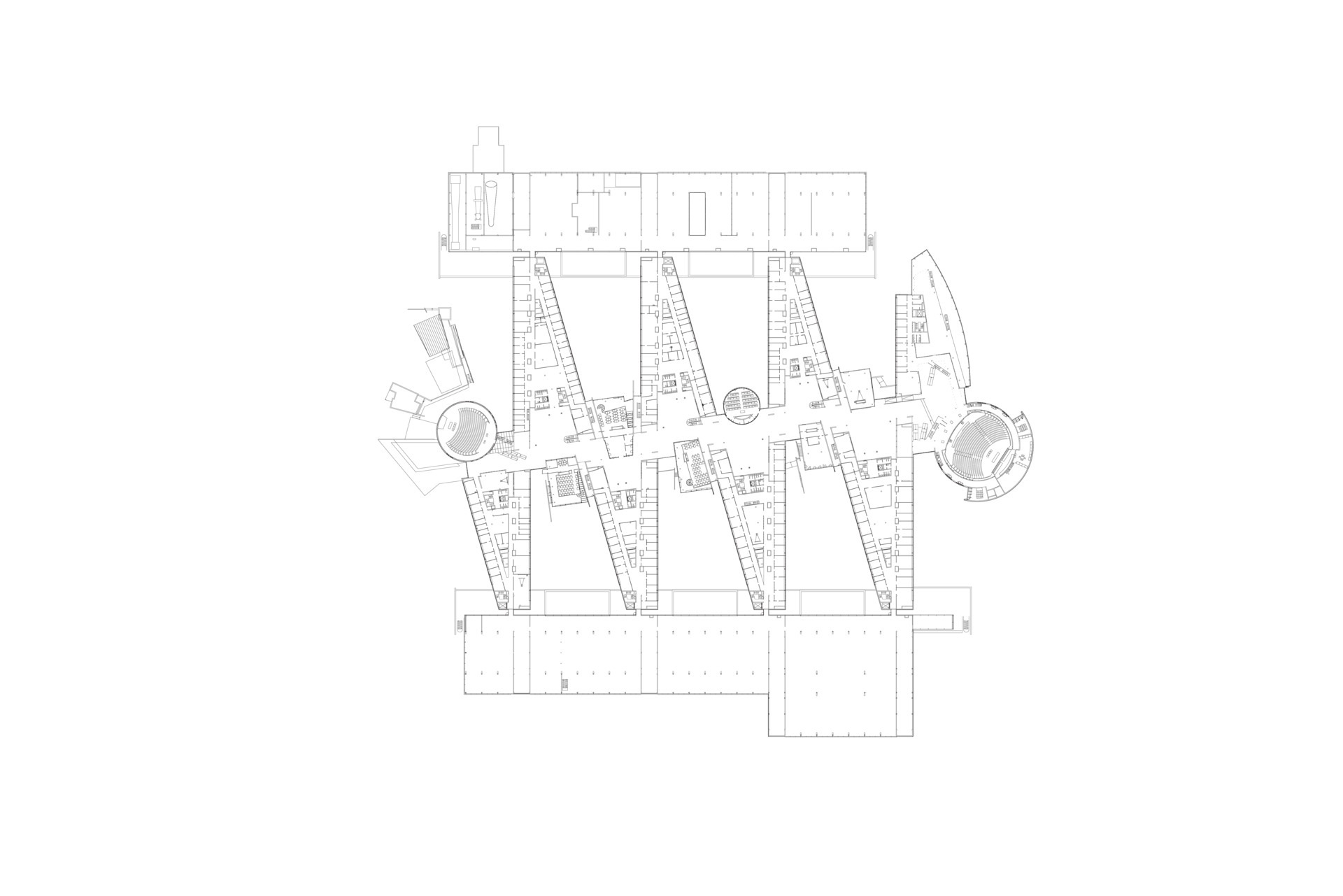 Eine 220 Meter lange Fakultätsstraße, die alle sieben Institute miteinander vernetzt, definiert das räumliche und kommunikative Rückgrat des architektonischen Gesamtkonzepts. Wie bei einem belebten Straßenraum vollziehen sich auf dieser Magistrale Transport, Verkehr und vielfältige Begegnungen. Sämtliche zentrale Einrichtungen, wie die Bibliothek, drei Hörsäle, sechs Seminargebäude, Läden, Cafeteria und ein Kindergarten sind diesem Spine angegliedert. Die viergeschossigen Institute öffnen sich zweiflügelig zur zentralen Straßenachse hin. Zwischen den jeweiligen Institutsspangen sind unterschiedlich gestaltete Zeichen-, Hörsäle und Seminarräume eingestellt. Diese Kuben nehmen das Thema „Straße und Haus“ in immer wieder neuen Weg- und Blickbeziehungen auf. Brücken als Verknüpfungslinien, Galerien, Fenster und die Transparenz der verschiedenen Ebenen fördern die visuelle Vernetzung.