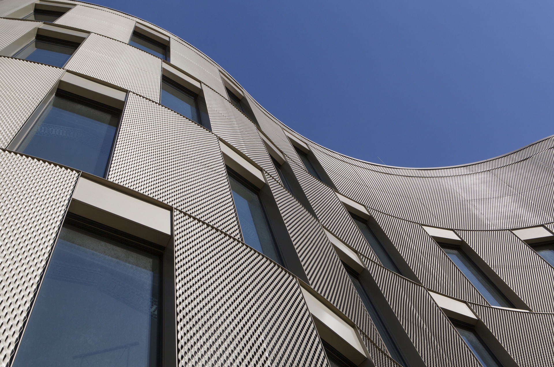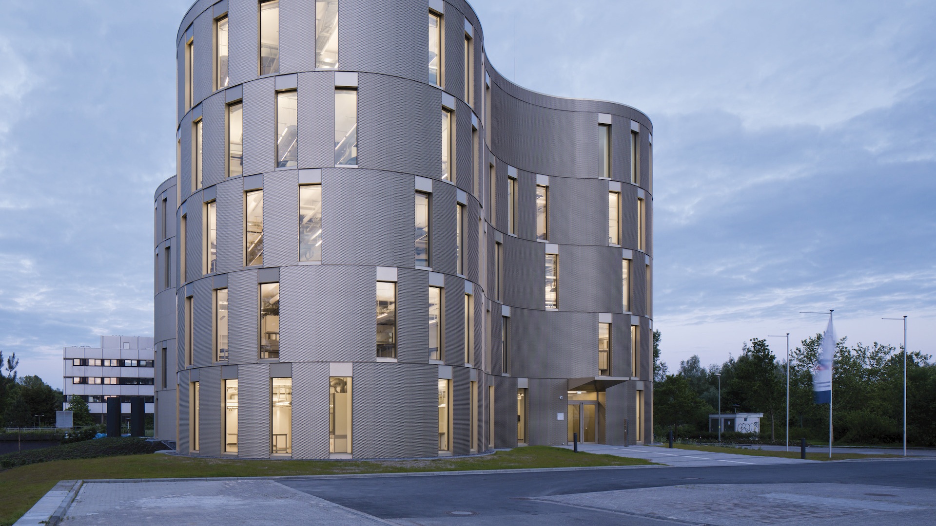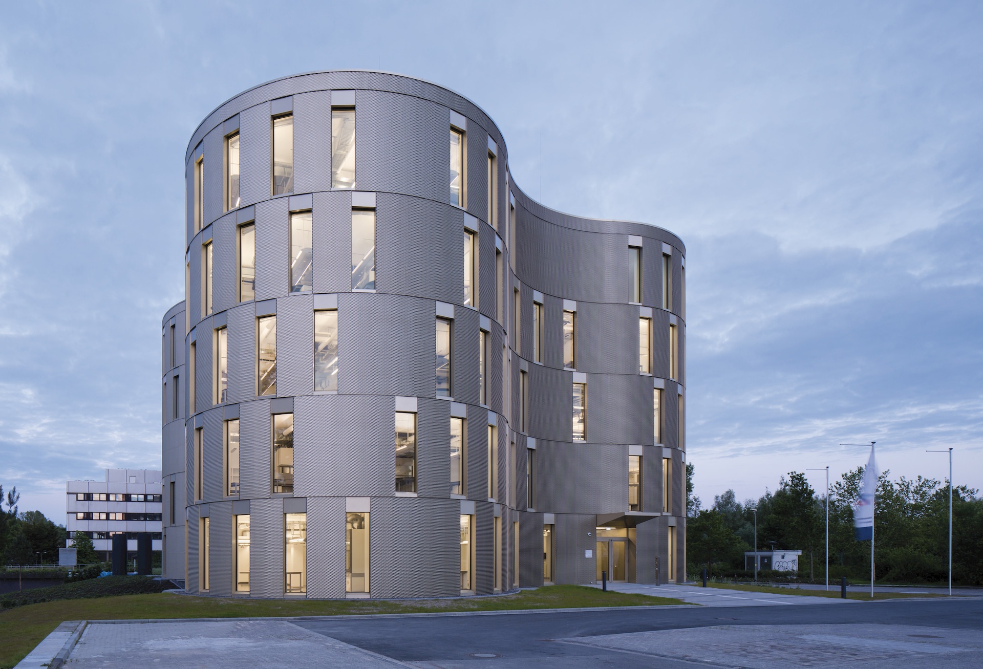 Der Grundriss setzt sich aus sechs unterschiedlich großen Kreisen zusammen. Die daraus hervorgehende konkav-konvexe Fassade ist mit goldfarbenem Streckmetall bekleidet und wird durch versetzte, geschosshohe Fensterelemente gegliedert. Ein Oberlicht versorgt die zentrale Treppe mit Tageslicht. Entlang des orthogonalen Kerns gliedern sich auf jeder Etage zwei Flure und eine Folge von Räumen, die durch die freie Form der Fassade begrenzt werden. Die Arbeitsplätze der Forscher werden über deckenseitige Medienflügel mit Gasen, Daten und Strom versorgt, was eine flexible Labormöblierung ermöglicht, die sich stets an neue Forschungsaufgaben anpassen lässt. Durch raumhohe Fenster dringt Tageslicht bis in die Tiefe der großen Räume. Ein Vortragssaal im obersten Geschoss dient dem Dialog der Forscher mit Wirtschaft und Öffentlichkeit.