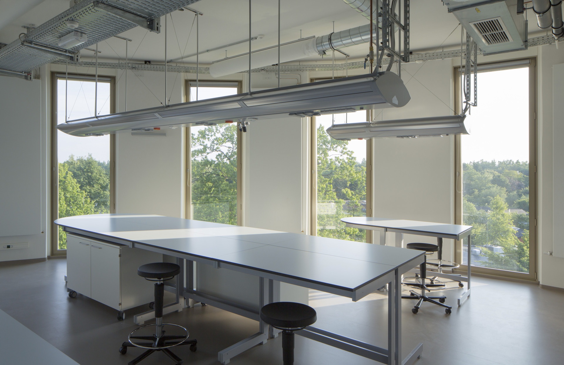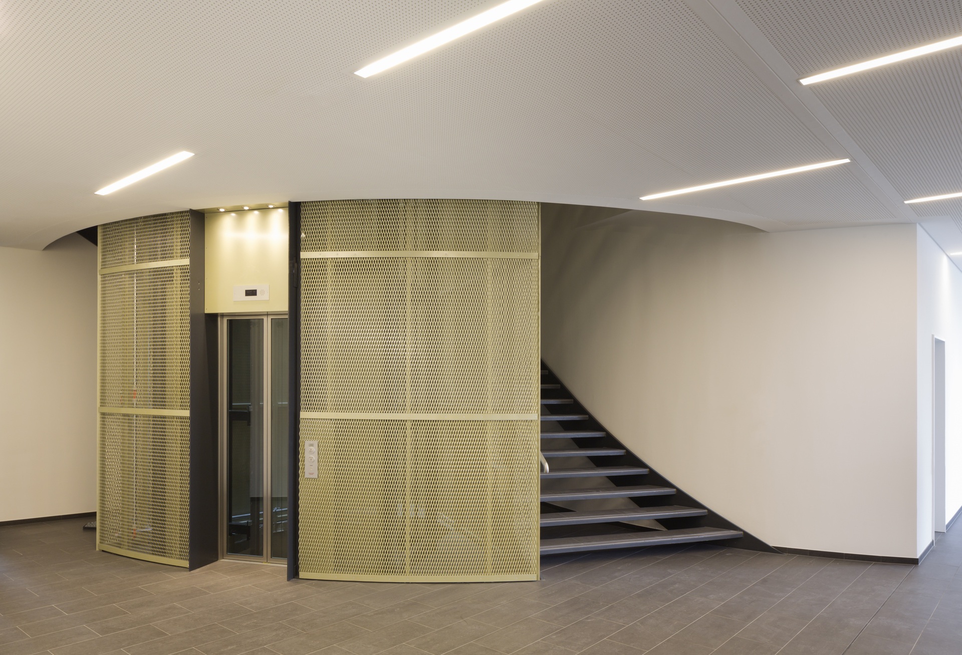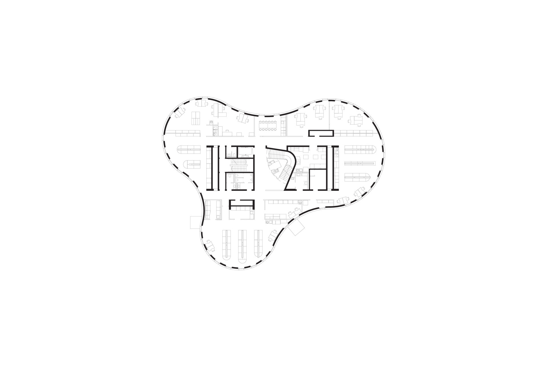 Der Grundriss setzt sich aus sechs unterschiedlich großen Kreisen zusammen. Die daraus hervorgehende konkav-konvexe Fassade ist mit goldfarbenem Streckmetall bekleidet und wird durch versetzte, geschosshohe Fensterelemente gegliedert. Ein Oberlicht versorgt die zentrale Treppe mit Tageslicht. Entlang des orthogonalen Kerns gliedern sich auf jeder Etage zwei Flure und eine Folge von Räumen, die durch die freie Form der Fassade begrenzt werden. Die Arbeitsplätze der Forscher werden über deckenseitige Medienflügel mit Gasen, Daten und Strom versorgt, was eine flexible Labormöblierung ermöglicht, die sich stets an neue Forschungsaufgaben anpassen lässt. Durch raumhohe Fenster dringt Tageslicht bis in die Tiefe der großen Räume. Ein Vortragssaal im obersten Geschoss dient dem Dialog der Forscher mit Wirtschaft und Öffentlichkeit.