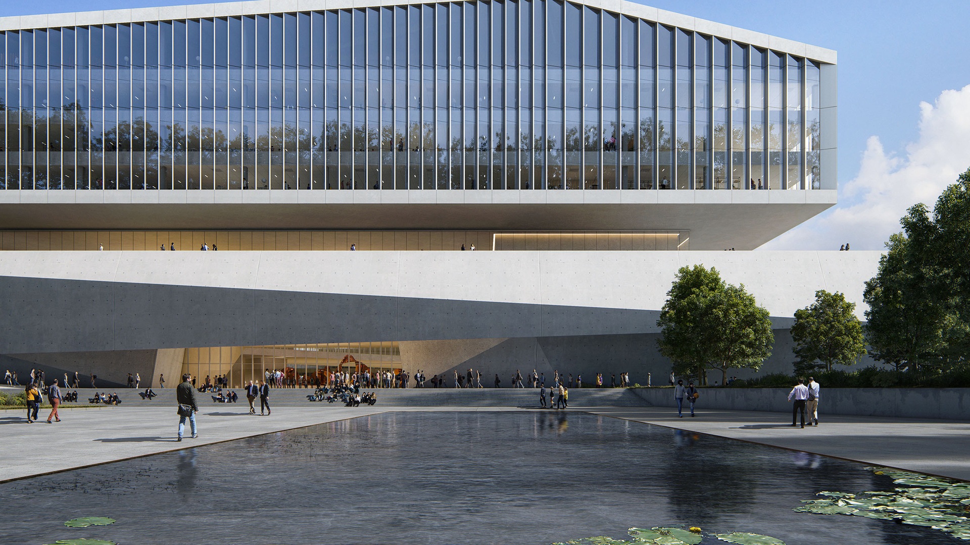 Global Design News: "The new building will be made of white concrete, while a classic architectural plinth will act as 'a faceted landscape of walkable green slopes and staircases.'"