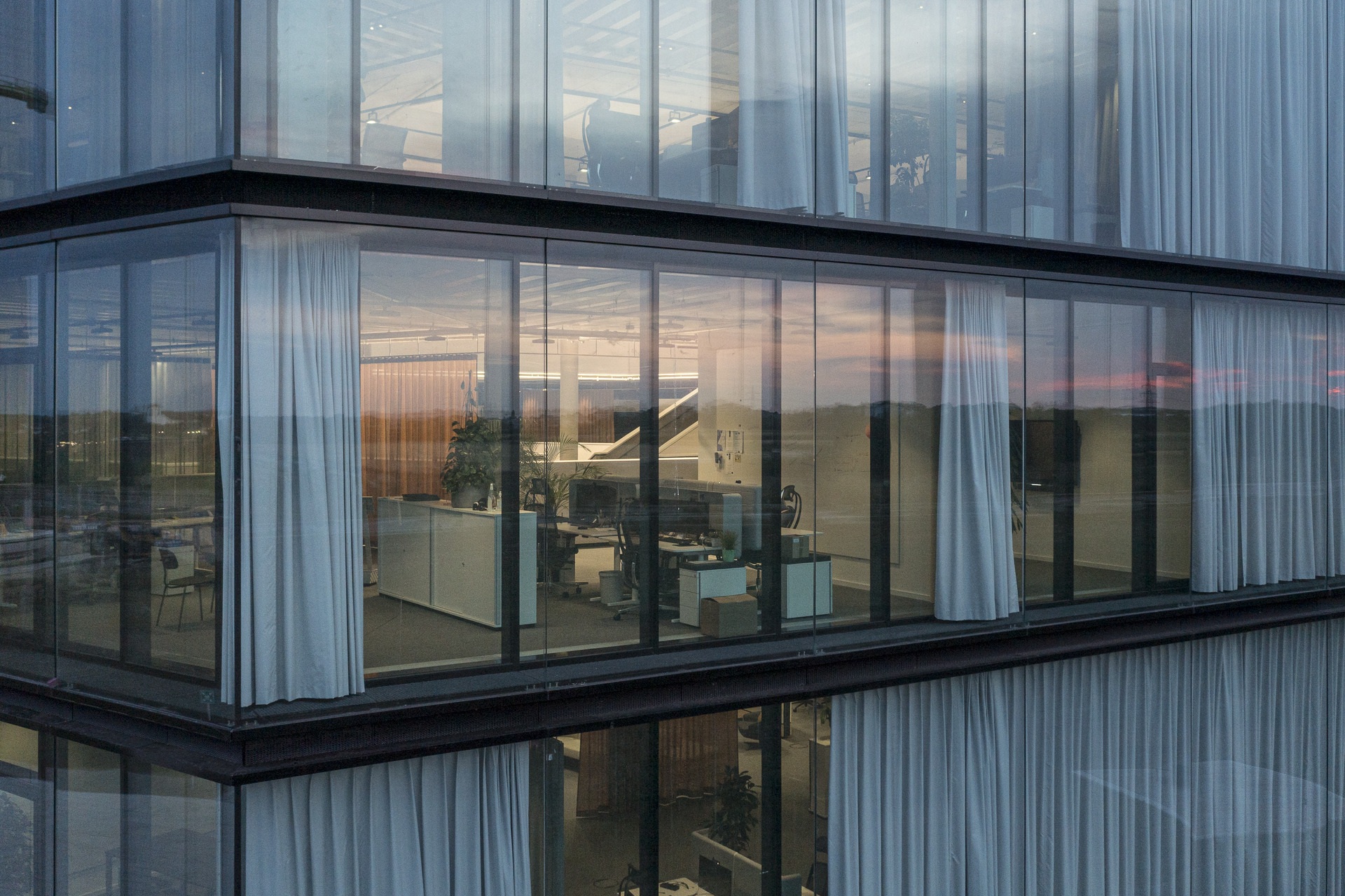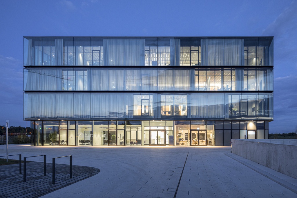 baramundi HQ is an agile work environment whose flexibility is expressed in the always-changing character of its facade. The minimal glass volume is articulated with precision strip steel and elegant reveals, while the semi-automated curtain system offers a playful, yet highly-functional sun-shading system. The system combines low-tech curtains with a high-tech, automated track system. The curtains follow the sun’s path and provide variable degrees of shading for workspaces and lounges.