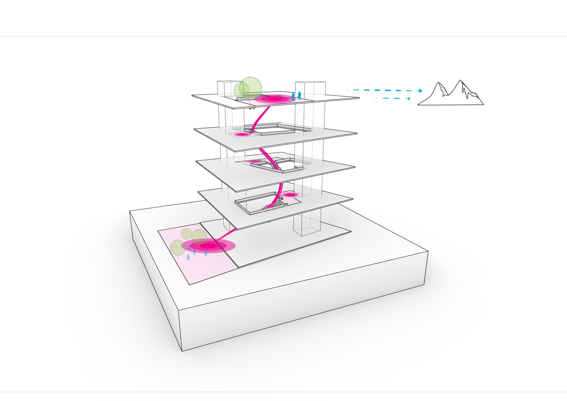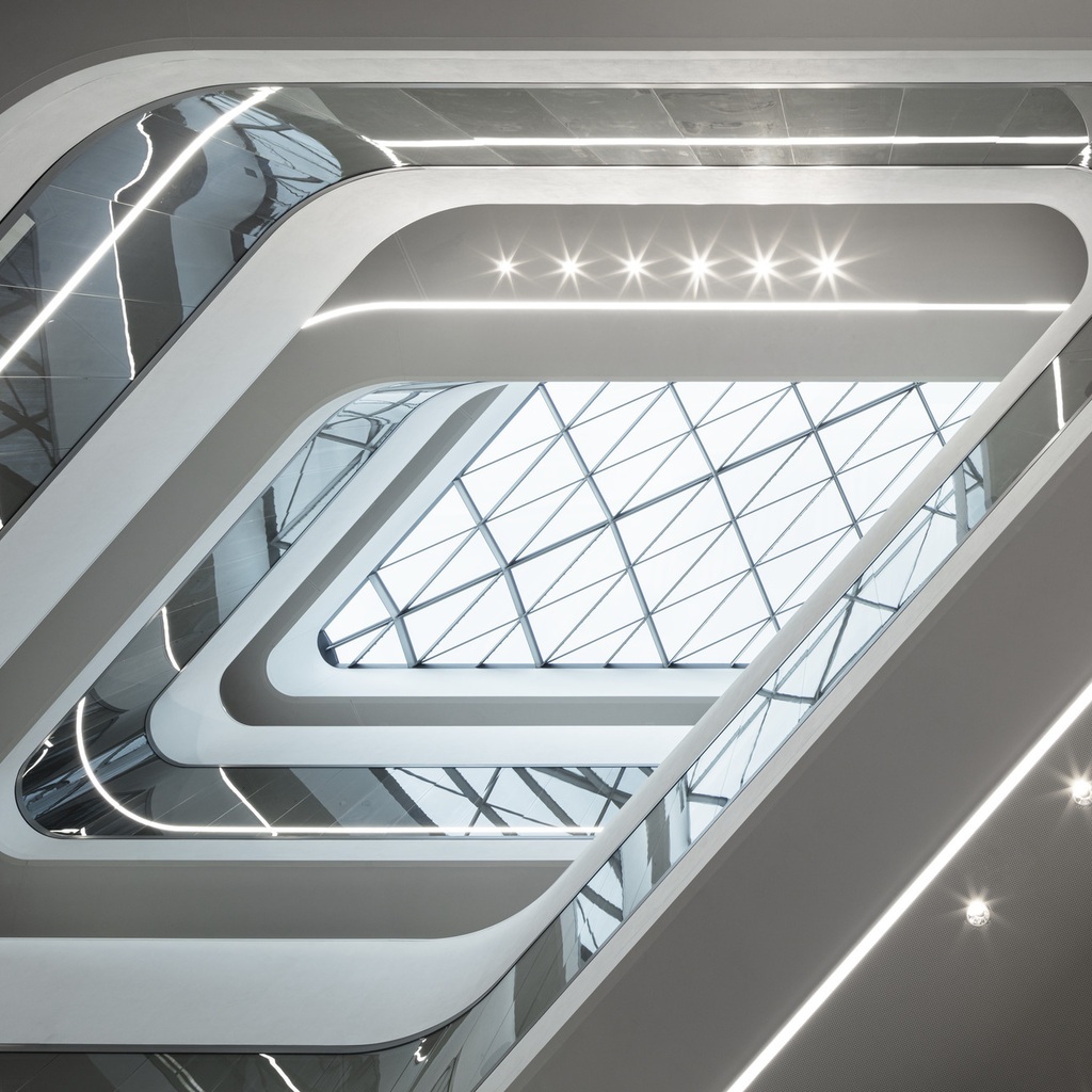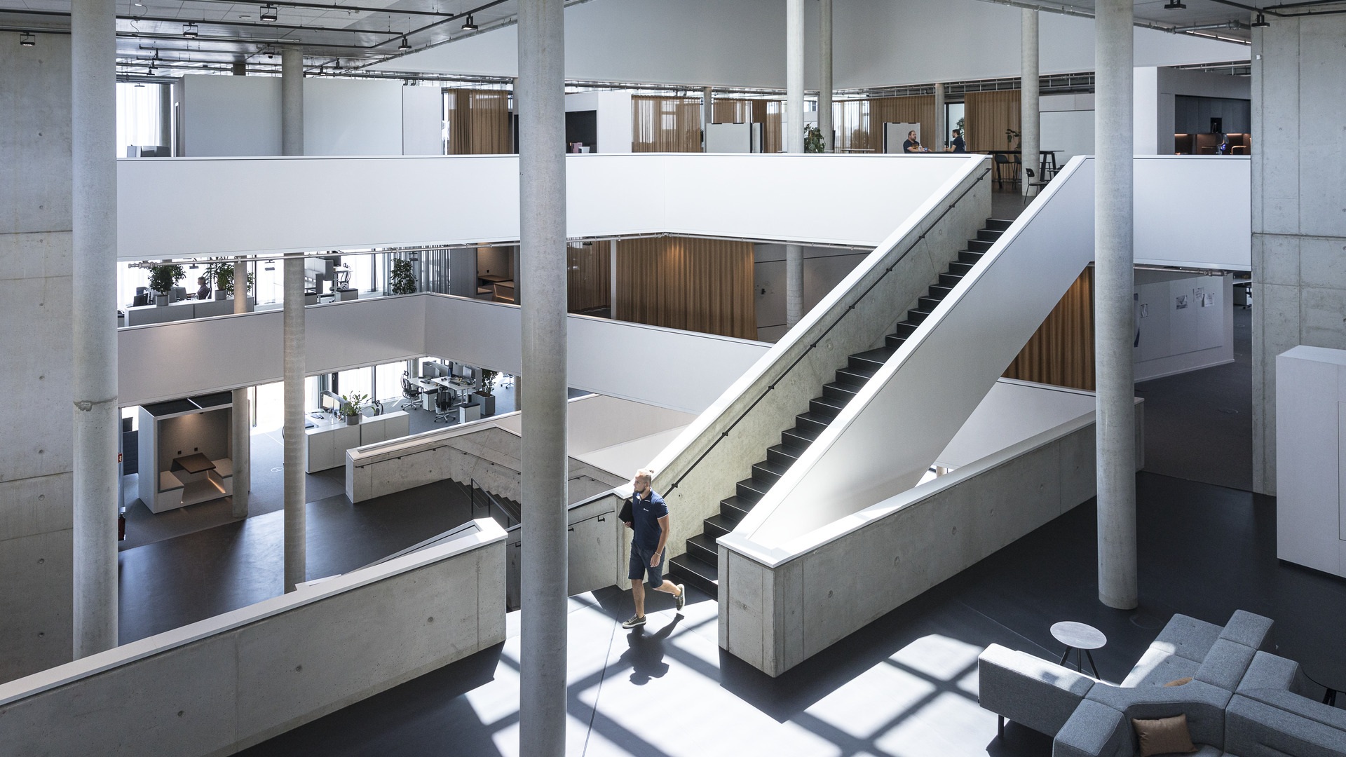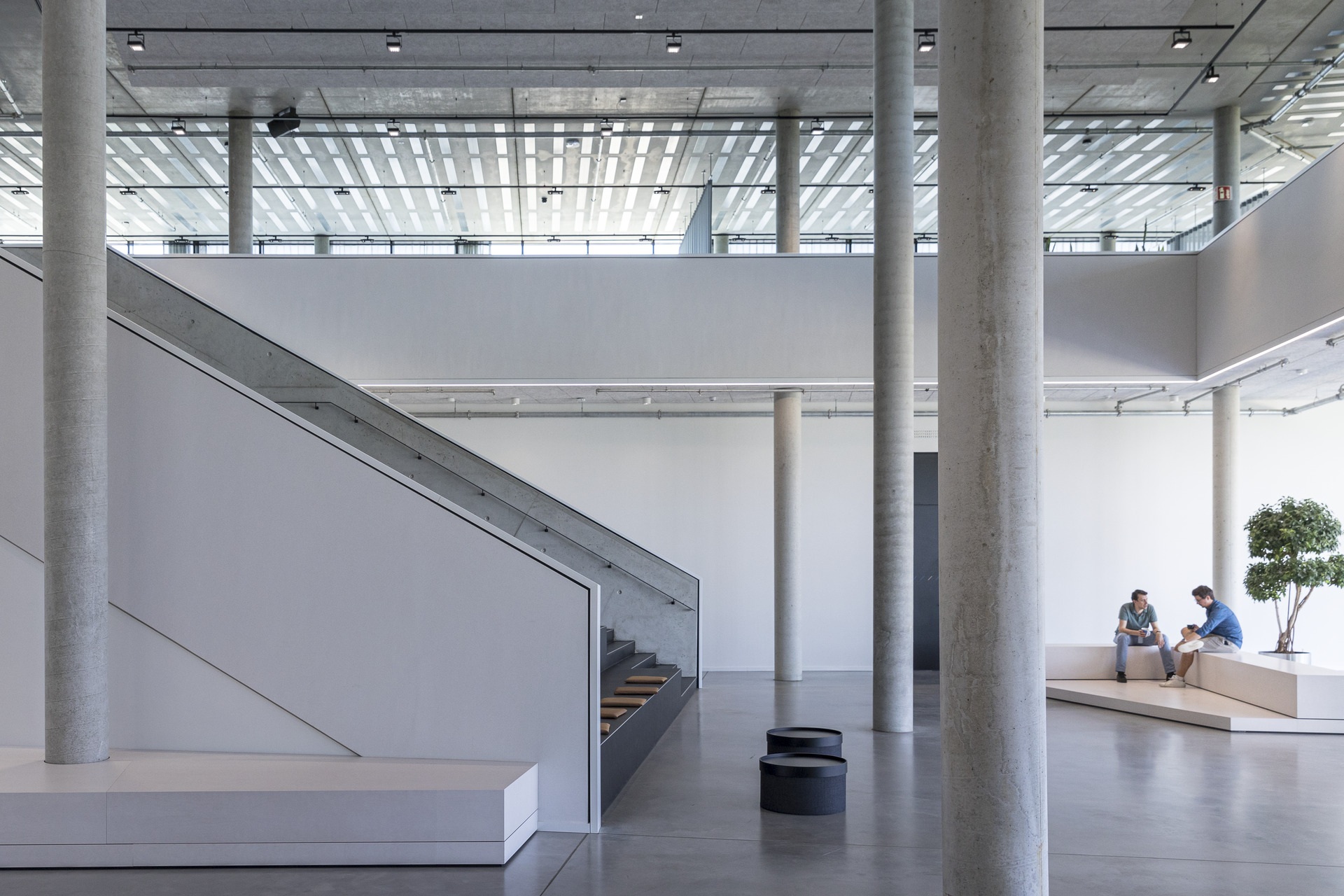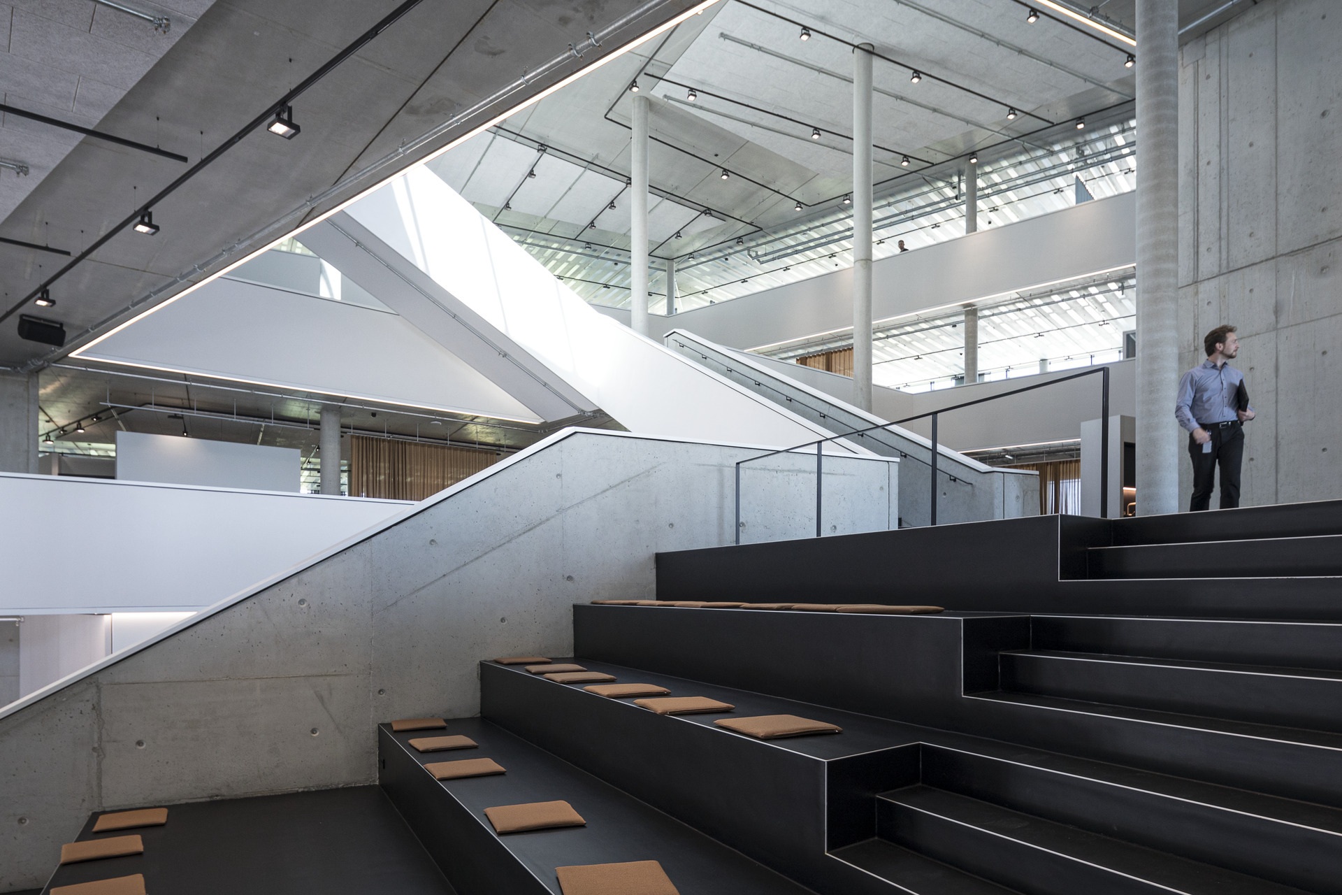 The new Headquarters is a platform for connection and collaborative work. The 13,250 square-meter building contains a public canteen, flexible collaboration spaces, dedicated work areas, a gym, and rooftop terrace with views of the Alps. The spaces are organized around a dynamic interior atrium whose rotating and overlapping cut-outs create a mix of single, double, and full-height spaces. The atrium creates an energetic social core for the building, and its cascading staircase functions as an informal communication space.