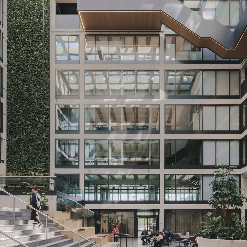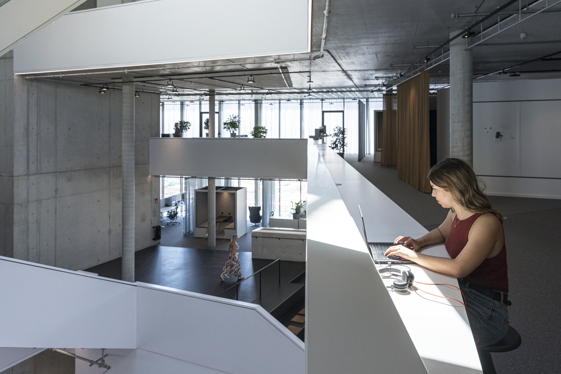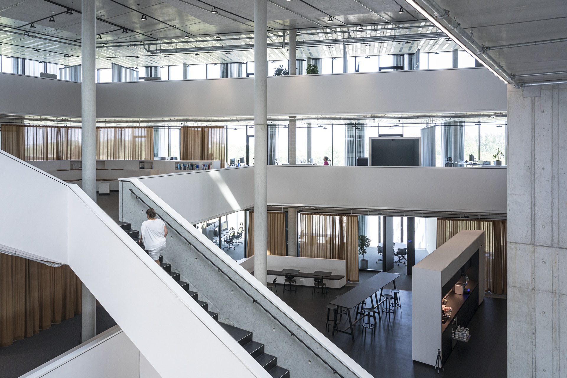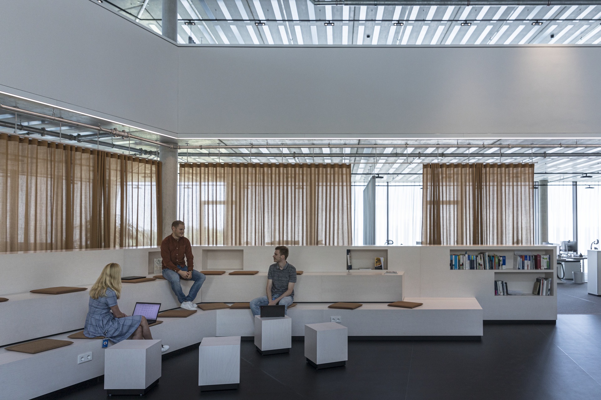 In contrast to the sleek, minimal facade the interior is made of raw, exposed, and natural materials. Exposed concrete, unfinished anodized surface, and visible metal sheets. Workspaces utilize natural colors and materials such as wood and fabric. All the surfaces facing towards the atrium are clad in white acoustic coating that dampens sound and amplifies natural, diffused light. Bronze-colored curtains serve as flexible interior partitions to create easily adaptable spaces.