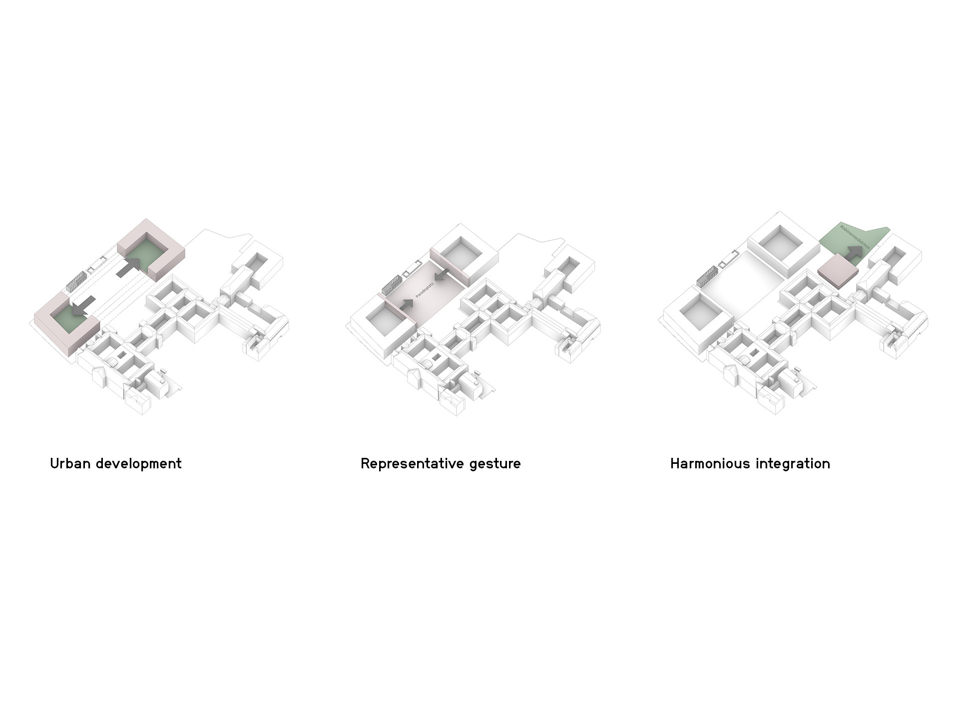 The new buildings’ thoughtfully inserted geometries and their sandstone façades allow for a harmonious integration of old and new. Their base is closed towards the outside to elevate them above street level to ensure the required degree of security and discretion.