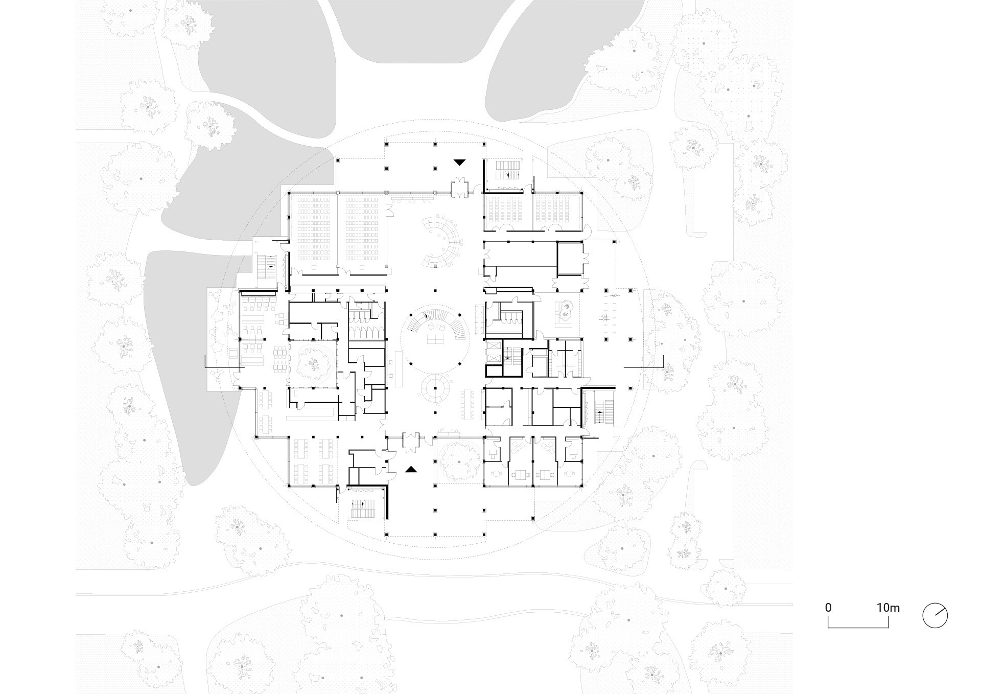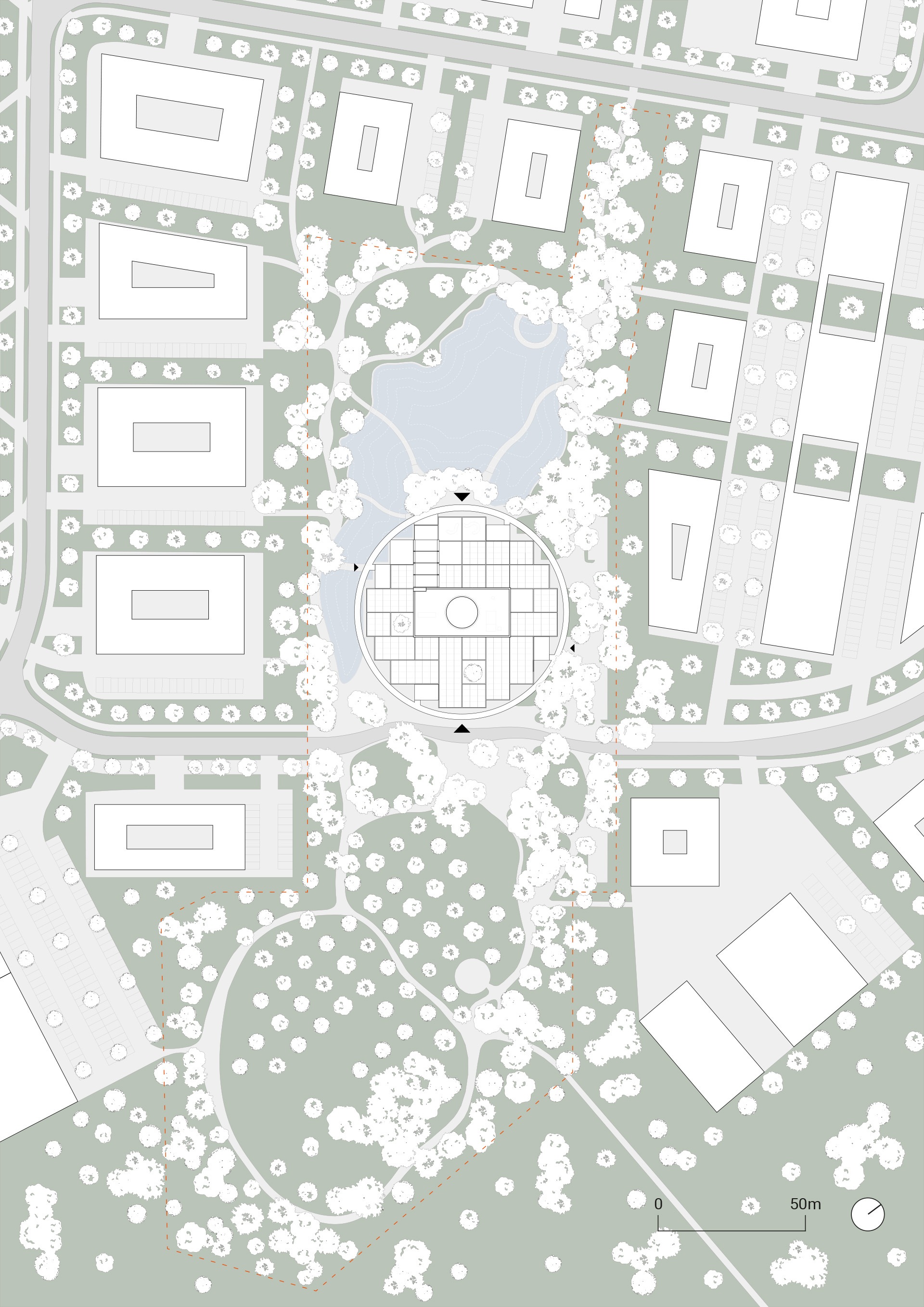 Set within a vibrant park, the Hub is embedded in a diverse natural biotope that helps moderate the urban microclimate and mitigate the heat island effects of the surrounding buildings. A newly created lake serves as a retention basin for stormwater runoff from the broader site.