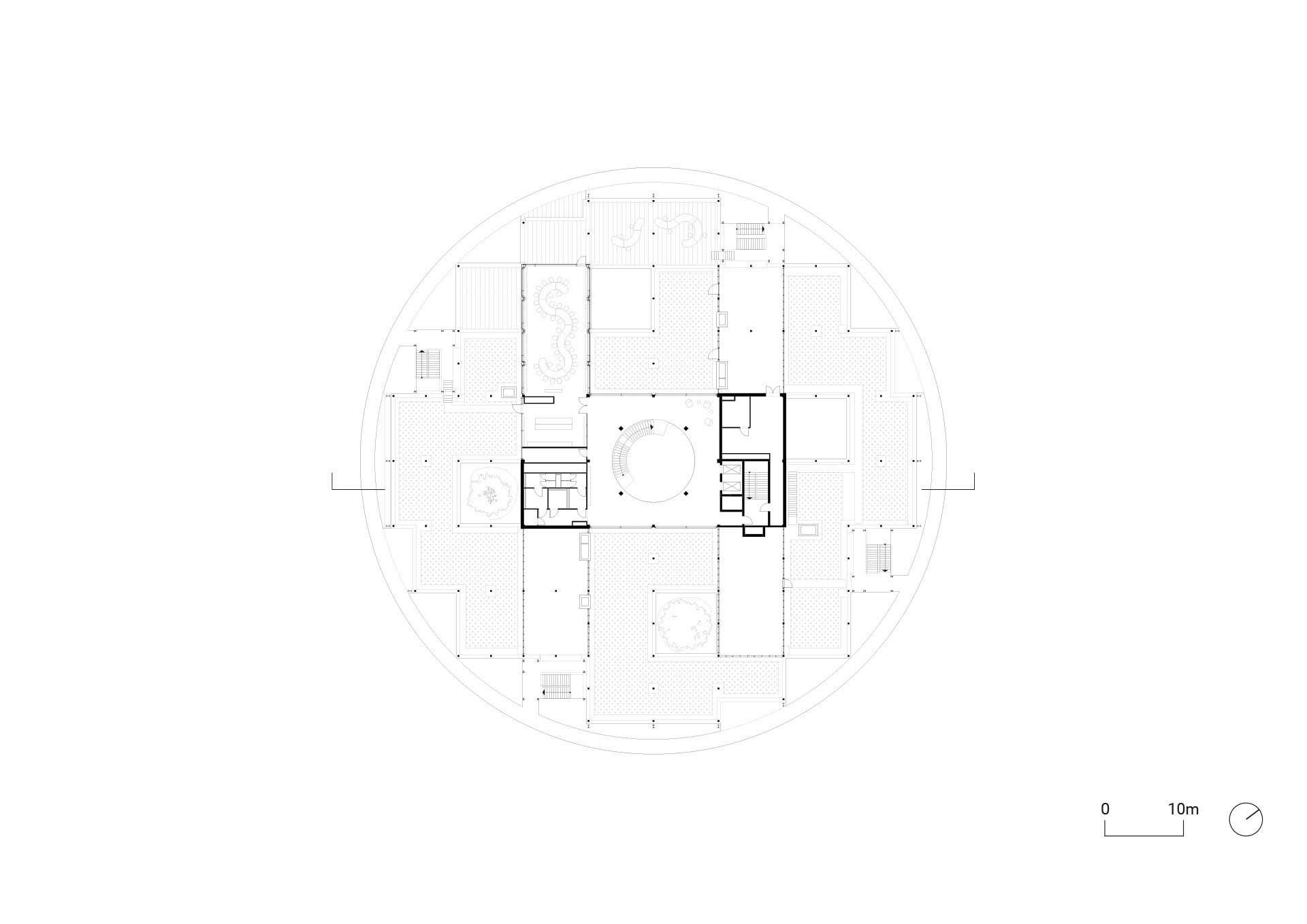 The modular system includes spaces for several smaller companies whose employees can gather in communal areas located around the central atrium for co-working and informal interaction. A generous spiral staircase guides visitors through this communication space, while additional external staircases serve as shortcuts for employees and allow the office units to be accessed independently from the balcony rings. The top floor features rentable event spaces with a rooftop terrace. The Hub’s recessed ground floor establishes a striking north-south axis on the site that links to the lake in the north and to an orchard in the south.