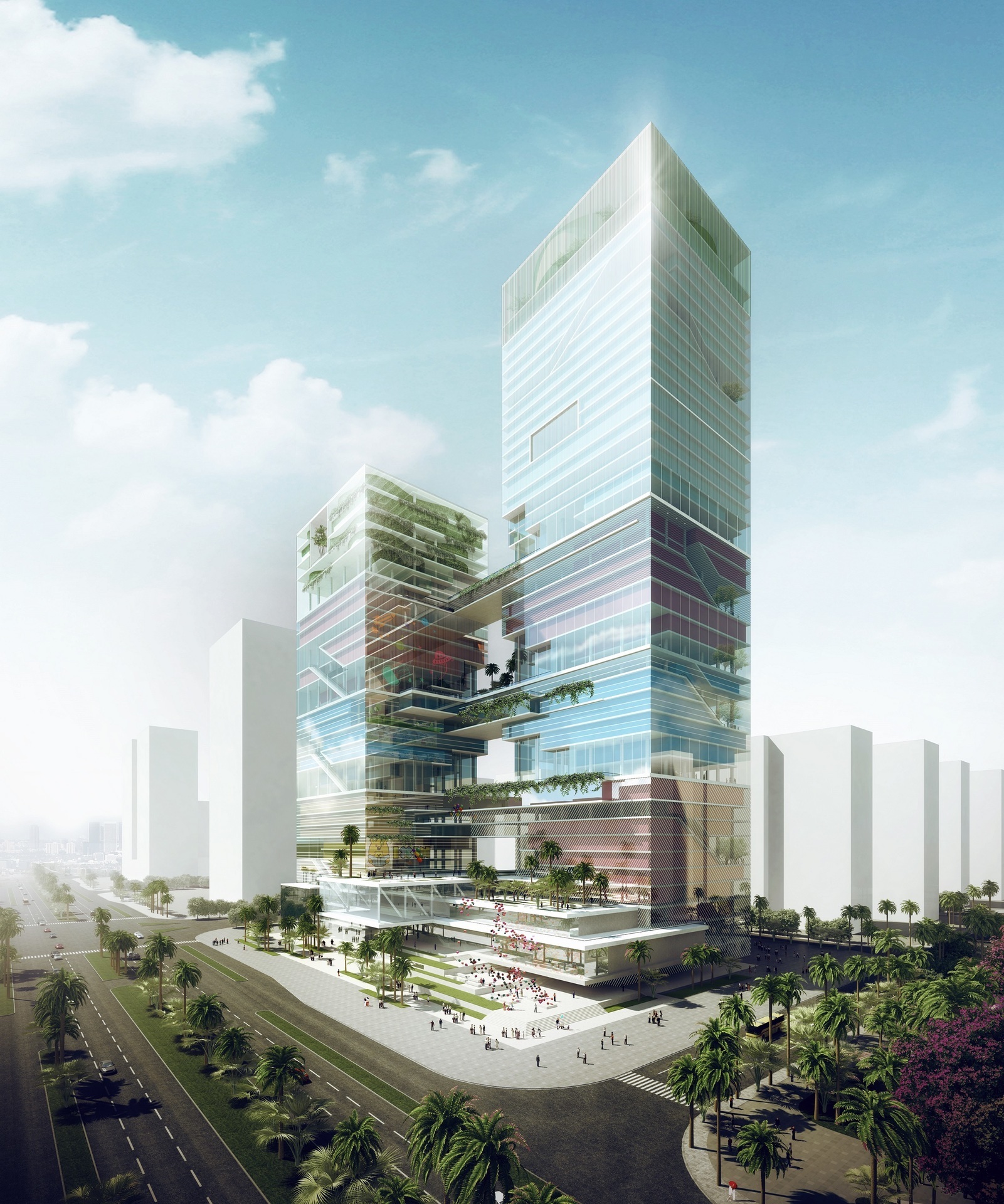 The complex consists of a 160-meter tower and another 220-meter tower that are connected by spacious bridges on certain levels. The bridges bind the towers at the lobby levels