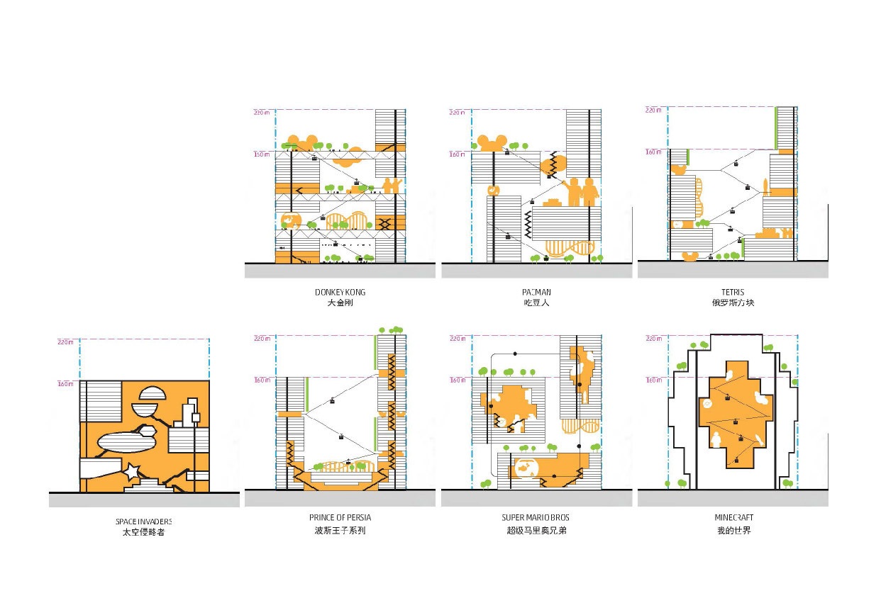 Located next to the IFC A Tower, the Dream Plaza occupies a prominent location within the new CBD in Haikou. The challenge was to create the first double highrise commercial project in the world, that provides entertainment and education for children and services for parents. Due to the challenging functional programme, the resulting building is incredibly complex. The goal was to combine play-oriented learning and education in a user-centered structure that would work as a highrise building. Additionally, the principle is that all programmes should be seen through a child’s eye. The method used to arrive at an architectural typology was to create a parallel with popular video games, which are both engaging and challenging for children and adults. Terms such as “multiple ground planes,” “sky plaza” and “epicenter” are further explored and implemented into the design of the new building.