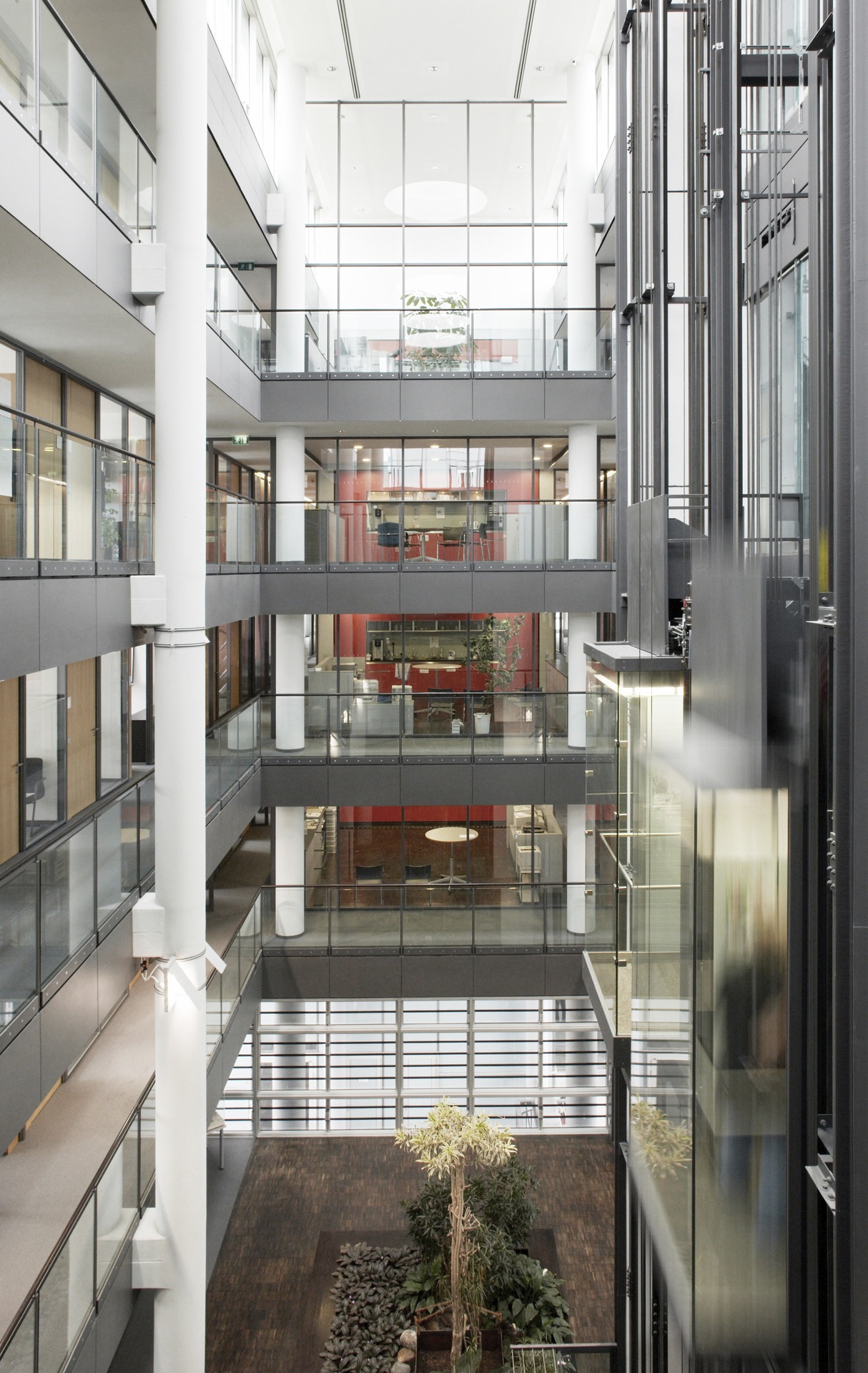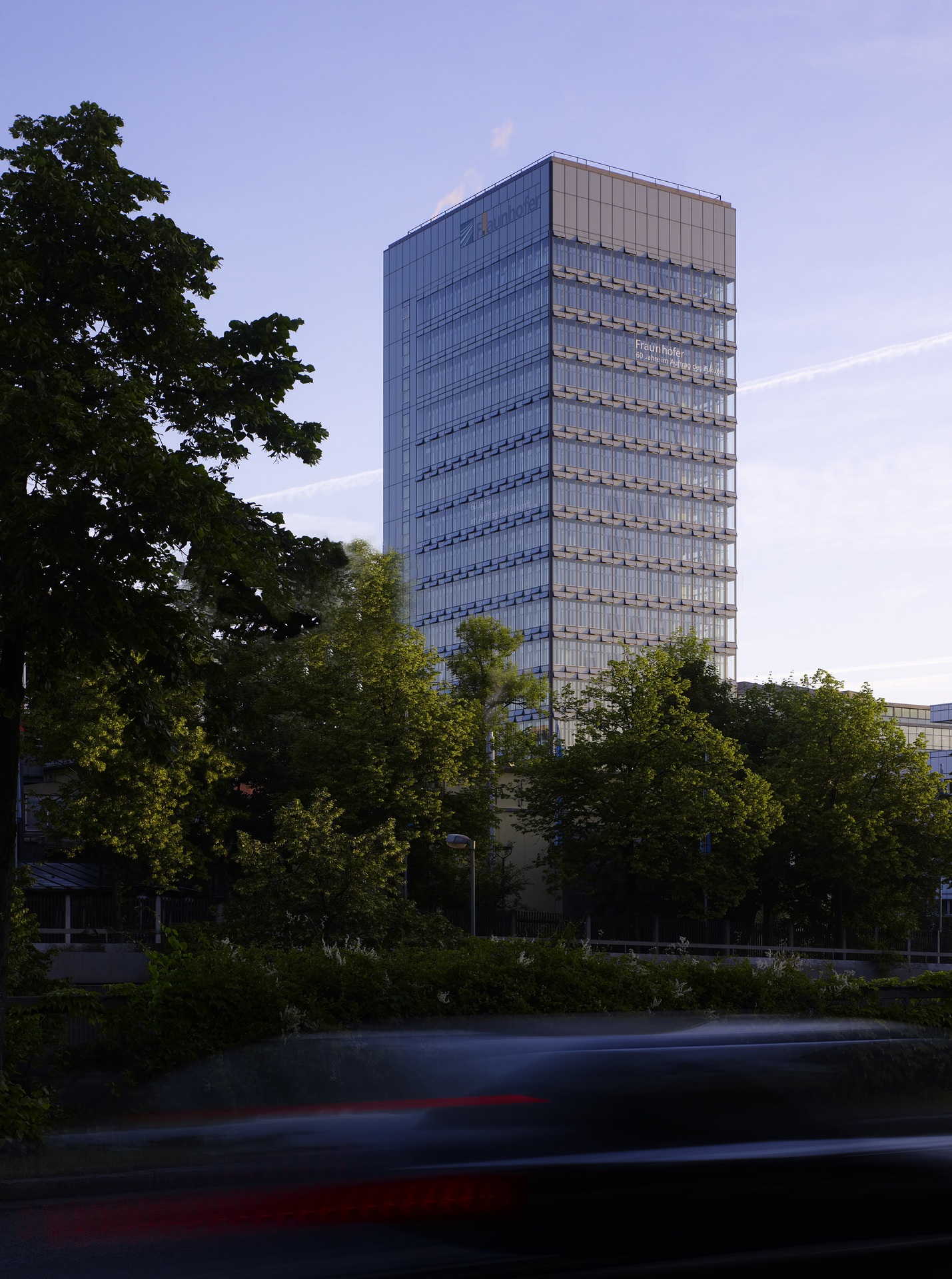 Innovation in application-oriented research is the fundamental principle of the Fraunhofer Society based in Munich. The 17-storey new building demonstrates transparency and communication in function and form – with glass and bright, naturally ventilated office rooms which enable the direct visual horizontal and vertical rapport with one another. Transparently-designed air spaces serve to condense place and space into a meeting point for communication and balance. The sound stress caused by the surrounding traffic meant that the requested noise protection in the Fraunhofer-Haus had to be carried out with a double-façade.