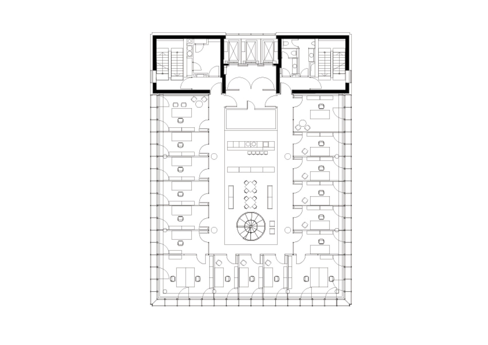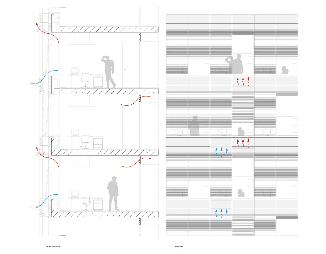 The primary facades are designed as a column and beam construction, the secondary facades as an elemented curtain wall. The space between the upper and lower story is closed so that there is an independent air belt around every floor. An active concrete core conditioning levels off the building’s inner stress. At night, the concrete core conditioning of the ceiling cools down the inside, a re-cooling system has been installed for this on the roof. Water acts as a heat carrier. The nocturnal air withdraws the heat from the water with ventilators and cooling lamellas. A sprinkler reservoir is used as a cold storage buffer: This allows the ceilings to be cooled most of the day exclusively with natural ambience cold. The Fraunhofer-Haus provides for high thermal comfort without active air conditioning.