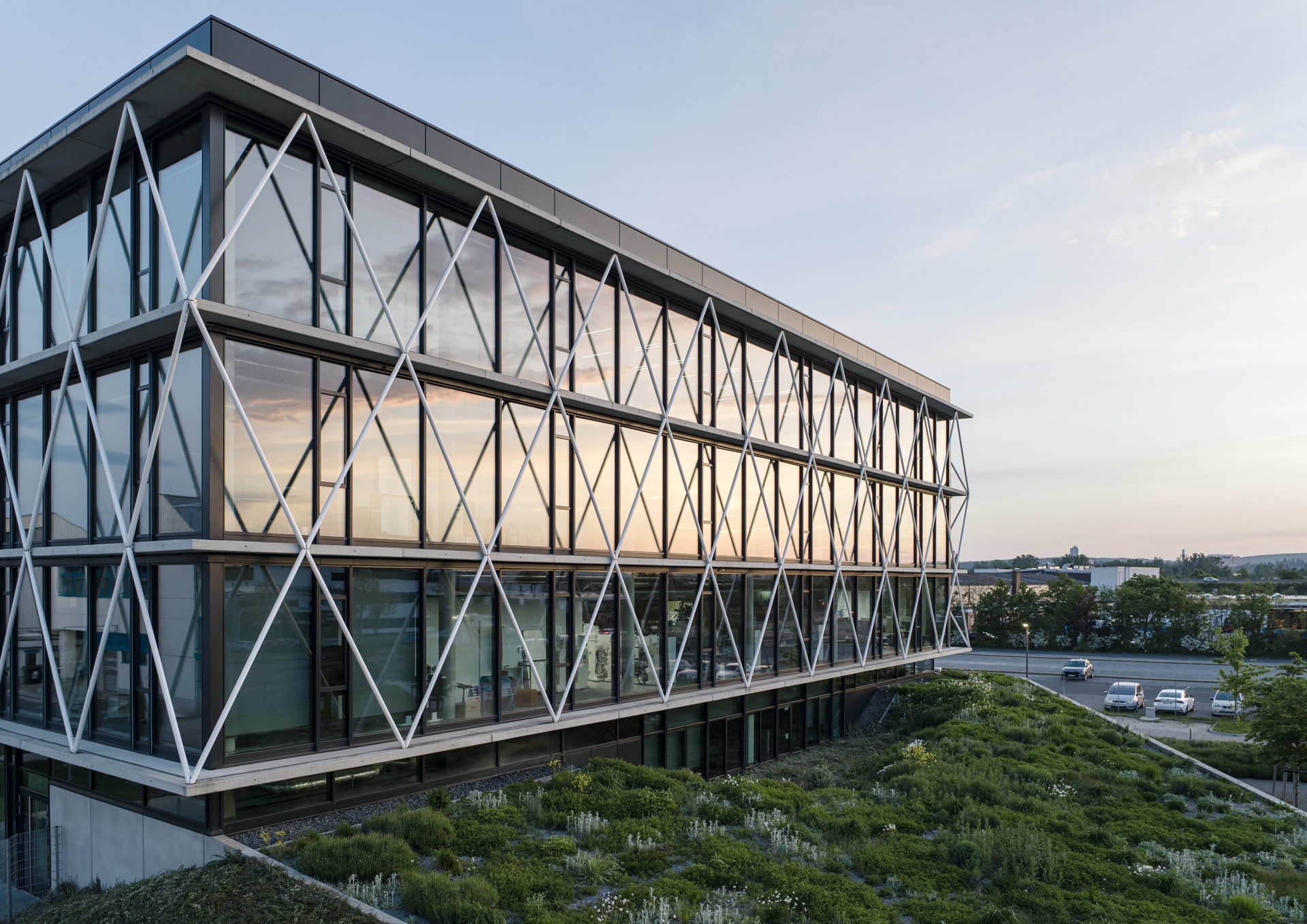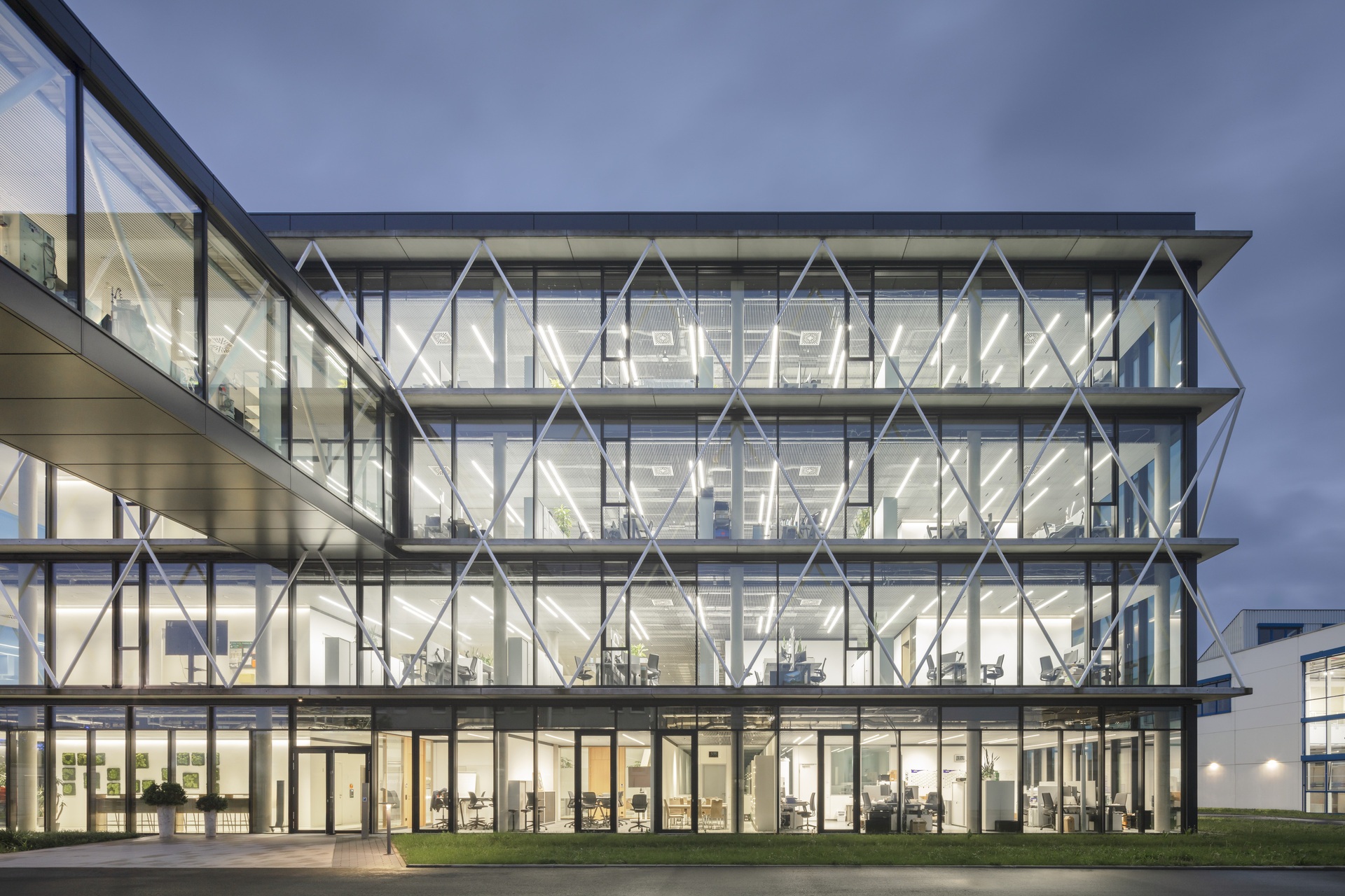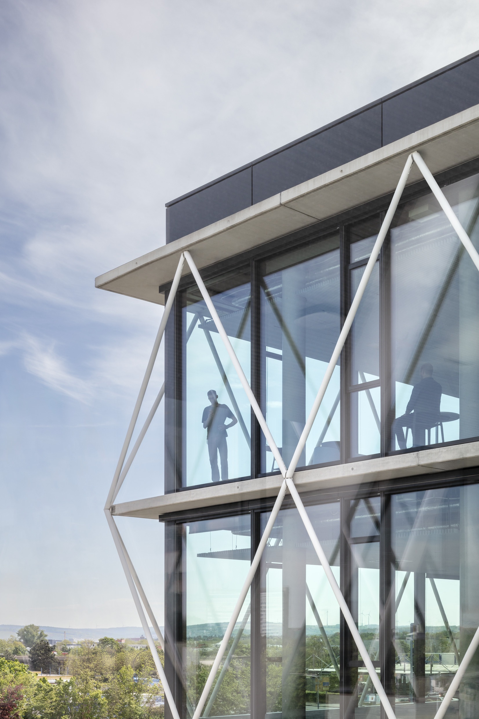 The idea of multi-layered networking also inspired the façade design, which includes various levels: Slender white aluminum tubes form a striking diamond-shaped grid that evenly envelops the building. These tubes are attached to cantilevered floor slabs, between which a glass façade extends.