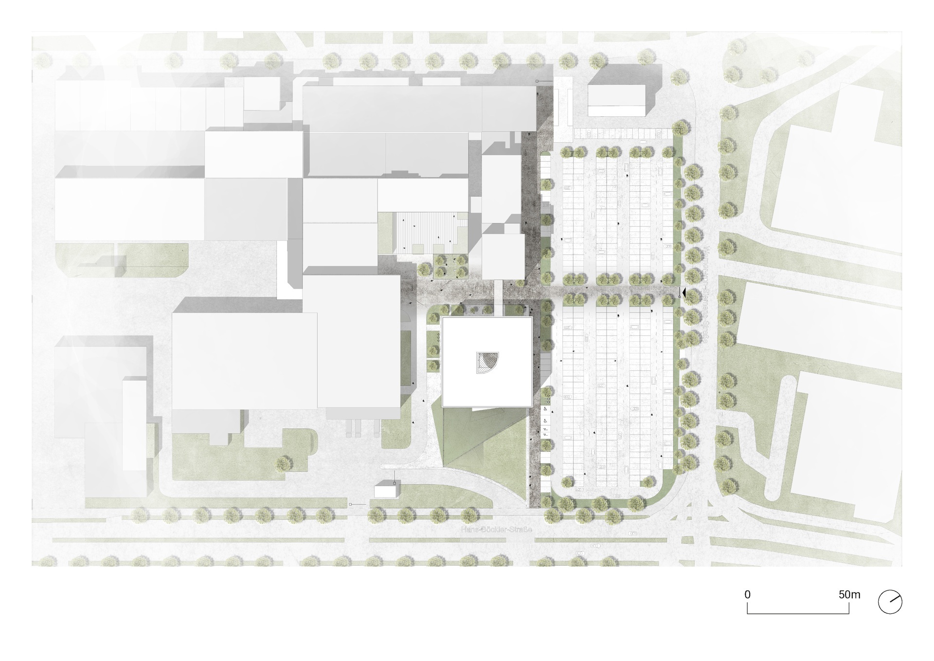 Situated at the point of access to the site, the four-story new build marks the new entrance to the premises. The transparent cube featuring a distinct, filigree diamond pattern rises above a green hill and welcomes employees and visitors alike. They pass through the main entrance on the northeastern side of the building to access the interiors.