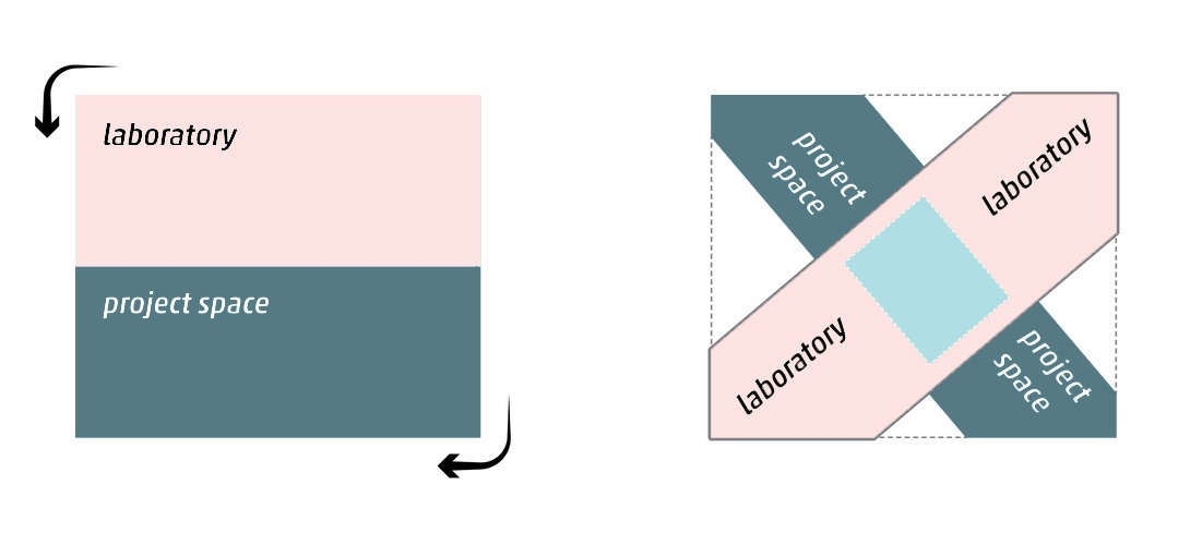 The design weaves these programs together in an X-shaped floor plan which makes optimal use of the square plot: each bar of the “X” is devoted to either laboratory or workspaces, while the intersections function as communal spaces. The column grid is denser in lab areas, and more open in the wings dedicated to office spaces.