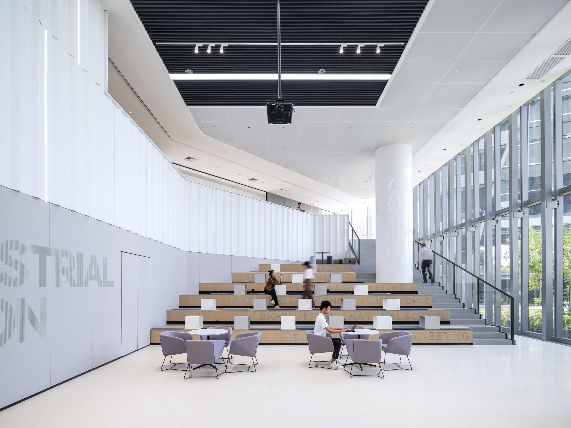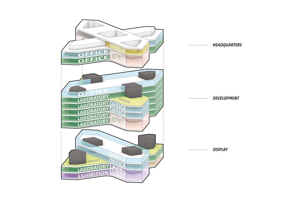The lower volume hosts public functions, including a lobby, exhibition hall, a show lab and café; the middle volume above houses laboratories, meeting rooms, multipurpose rooms, and the top floor contains offices.