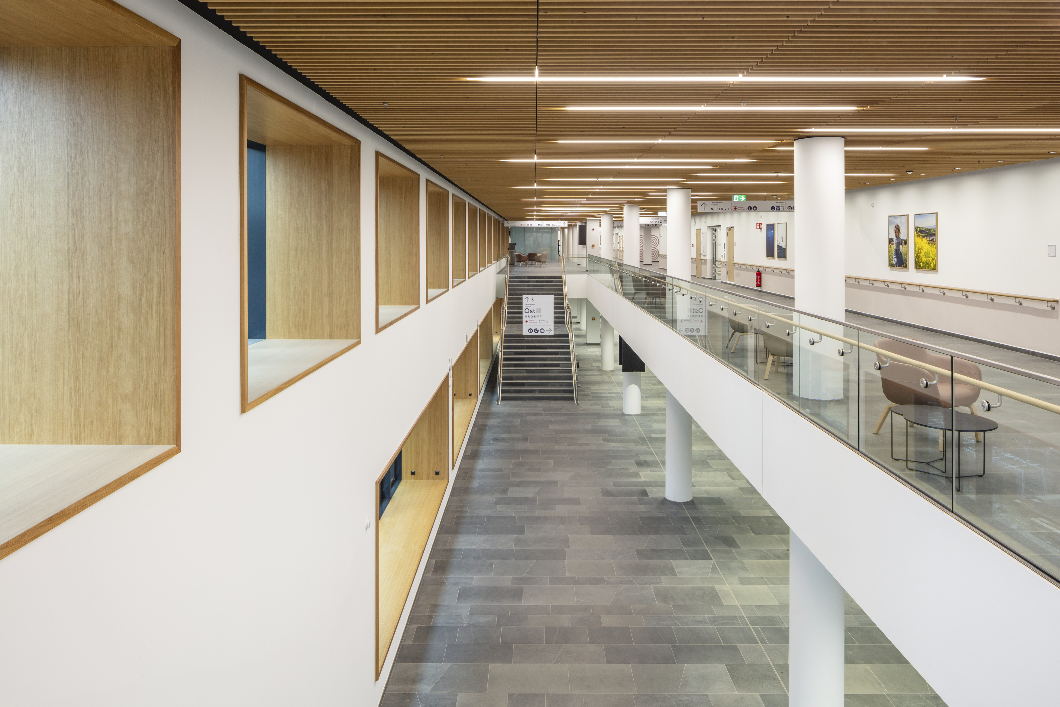 Visitors enter the central clinic through the two-story entrance hall, which features generously designed glazed areas that create a covered space between the buildings, thus leading visitors from the outside to the inside, from the public to a more private sphere.