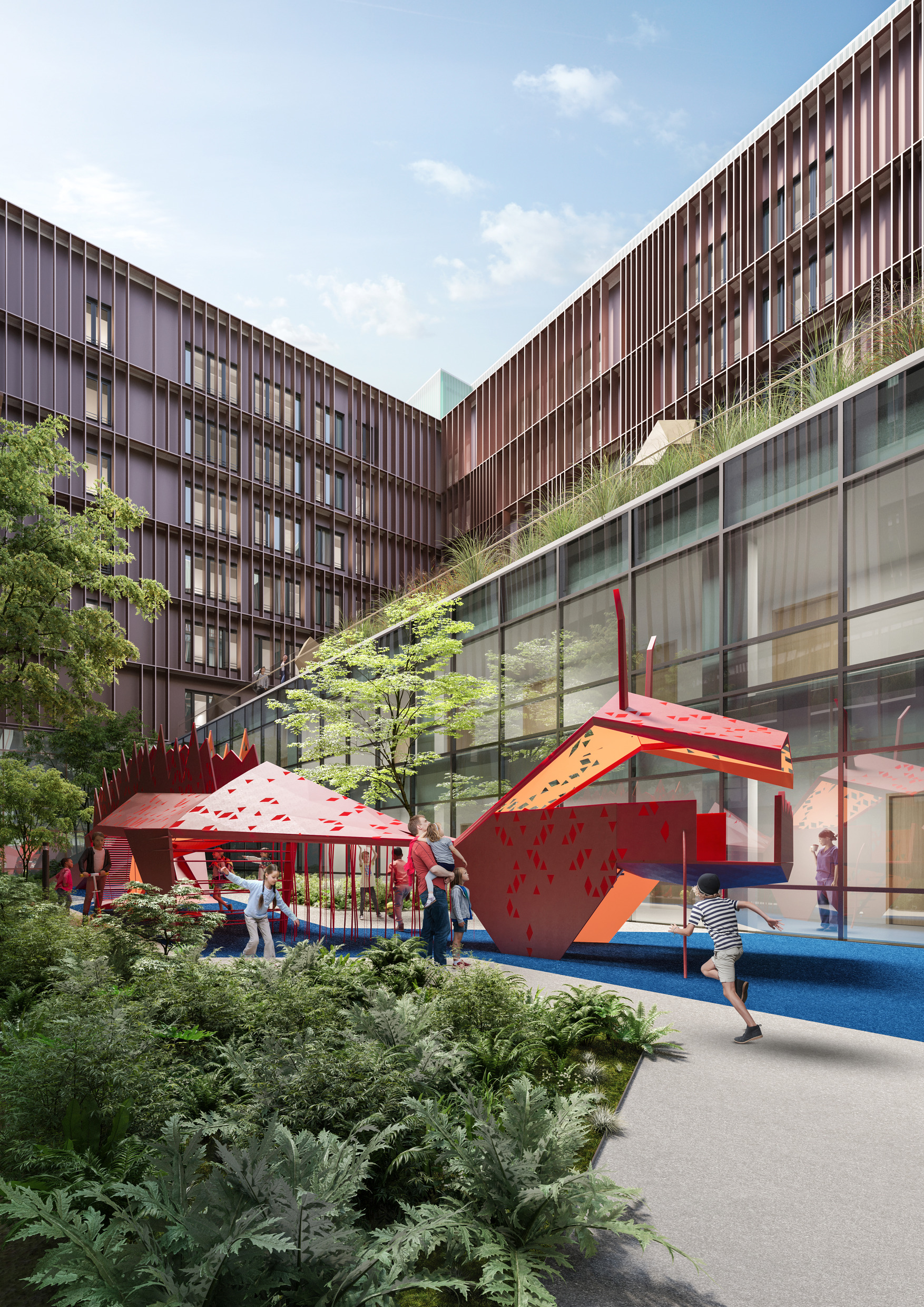 SINAI landscape architects designed all outdoor spaces as lush themed gardens, including an herb garden, a cherry orchard, and a playground for the pediatric hospital.
