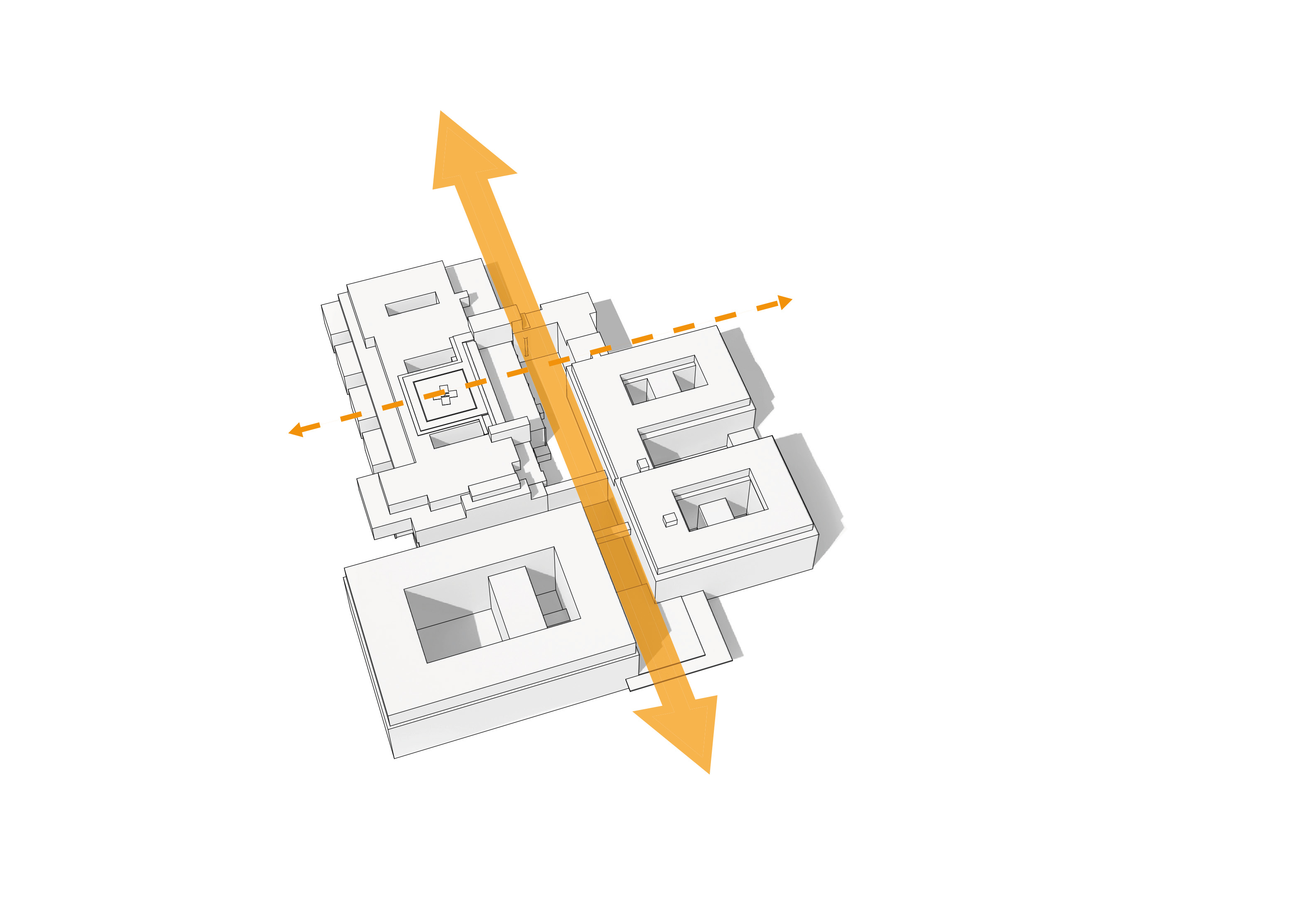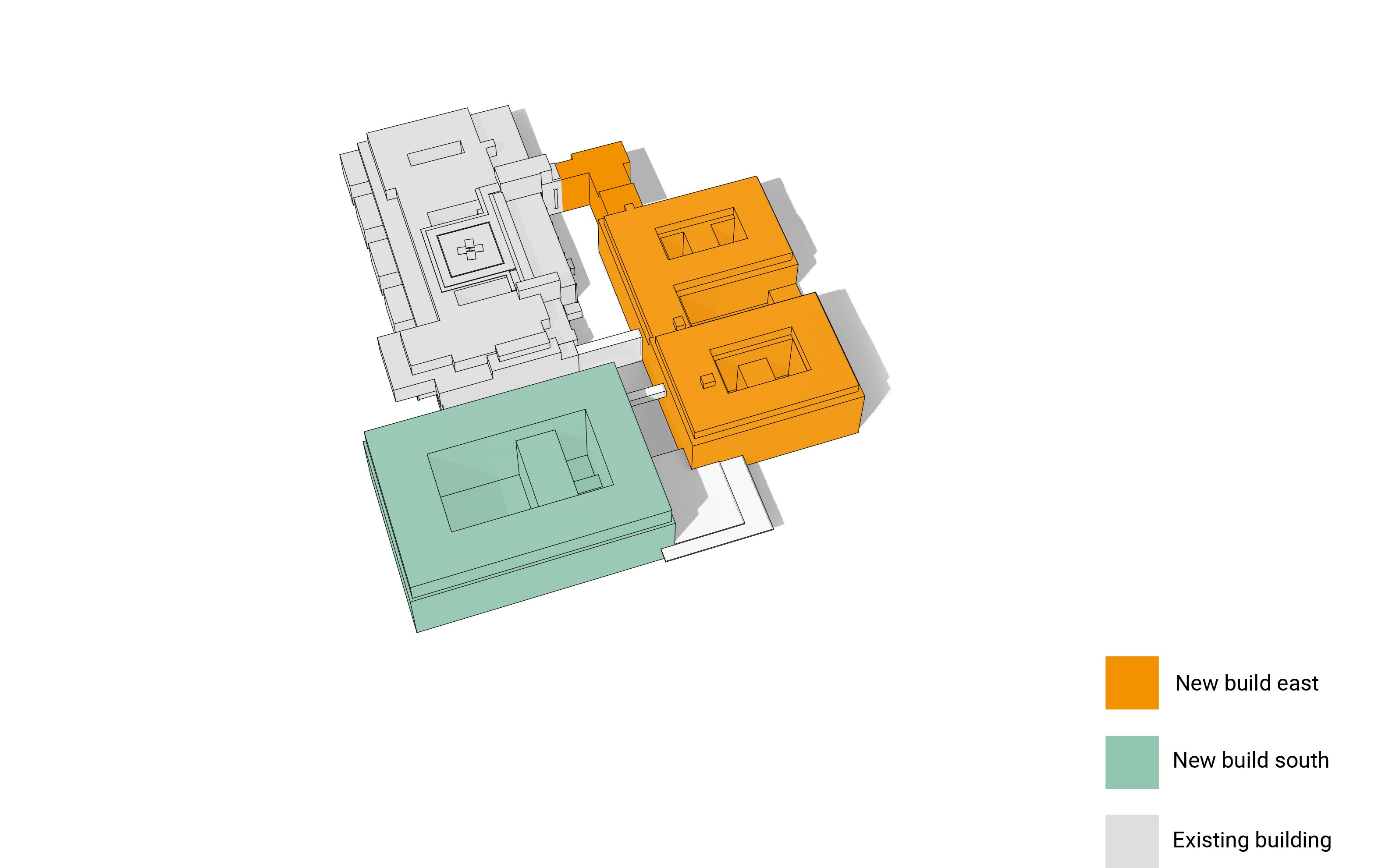 The three heterogeneous structures are arranged along a new connecting axis, which runs through the center of the complex all the way from the new entrance hall in the south to the northern end of the site, where further areas for future development are situated.