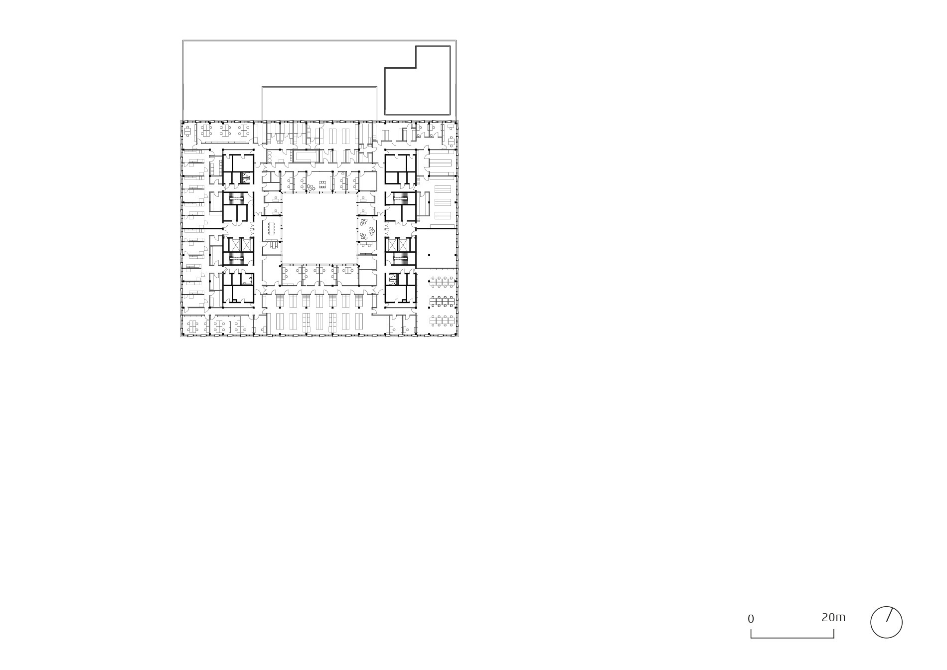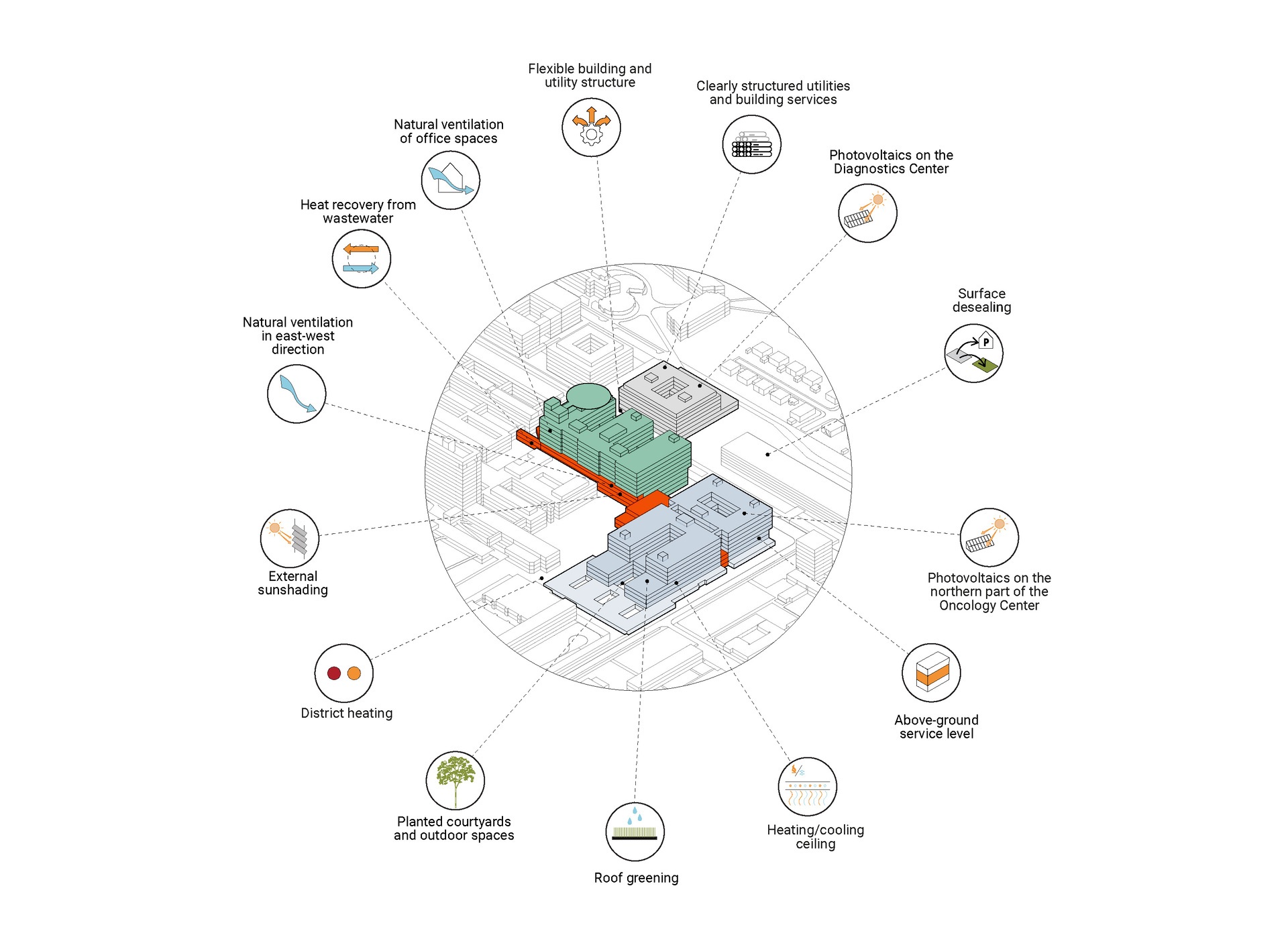 Starting from the idea of a green, open, and connected medical campus, the new design deliberately contrasts the technoid feel of the existing building. The master plan puts people first, likening the campus to a small town, including well-structured, clearly arranged buildings, short distances, and clear guidance and orientation. Plenty of daylight and direct access to nature support the recovery process for patients.