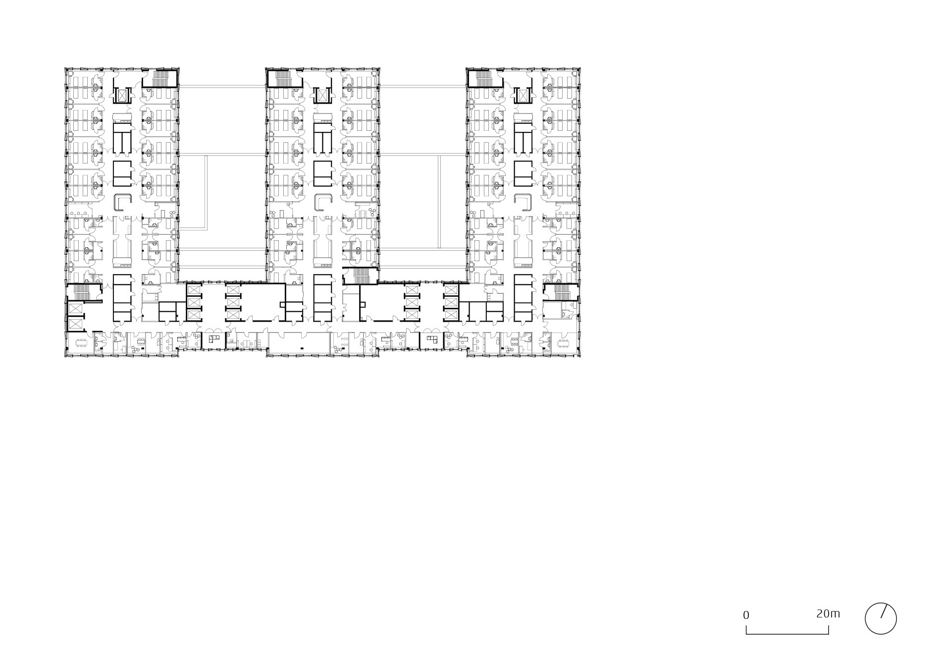 The hospital’s current appearance is dominated by the 200-meter-long, 13-story ward building, whose architecture reflects the fascination with technology of its time. In its current condition, however, it no longer meets the demanding requirements of state-of-the-art medical equipment. This is why a future-proof campus structure including six new clinical centers will be established over the course of several decades while the hospital continues to operate. As a networked organism, the new buildings will provide second-to-none medical care.
