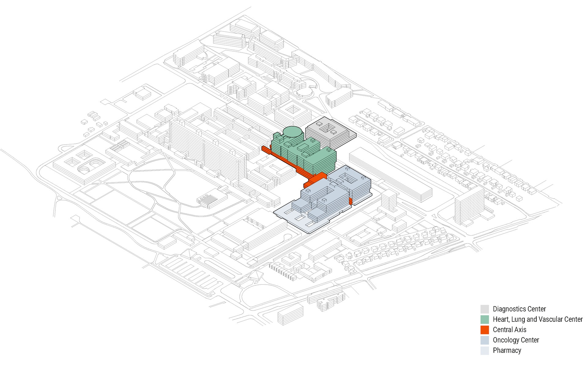 The first project phase includes the new Heart, Lung and Vascular Center, the Oncology Center, the Diagnostics Center, and a prestigious entrance building in the northeastern part of the campus. Similarly designed façades emphasize their coherence, while different shades lend a distinct expression to each building.