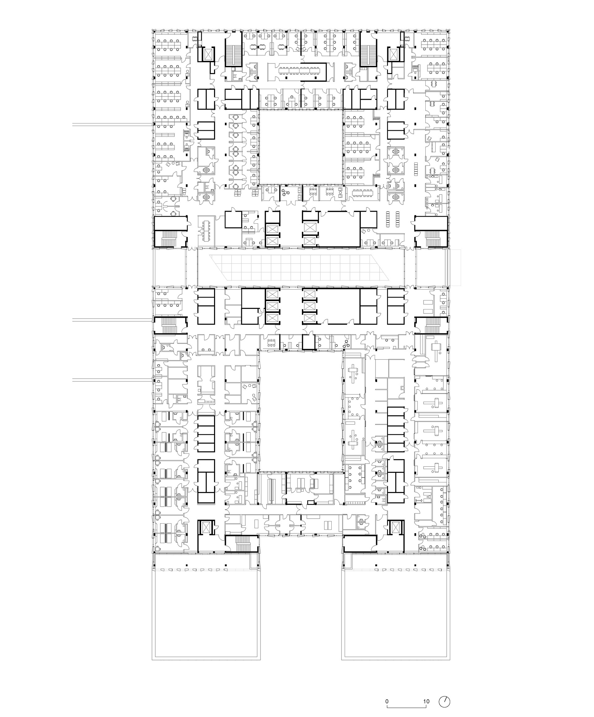 The buildings are grouped around a central axis that interlinks examination and treatment rooms as well as patients and staff while providing space for professional exchange and informal encounters. The surrounding nature – the “green lung” of the site – is omnipresent in all areas of the hospital complex thanks to interspersed green courtyards that function as spaces for retreat, rest, and relaxation.