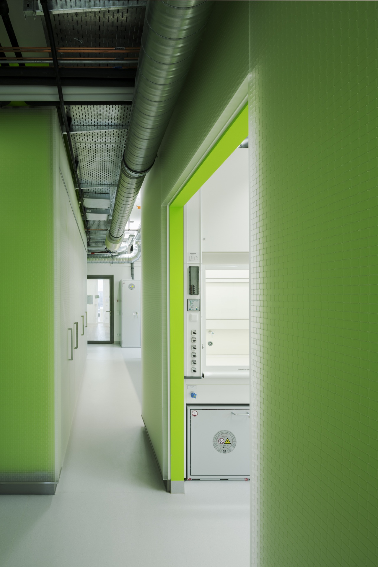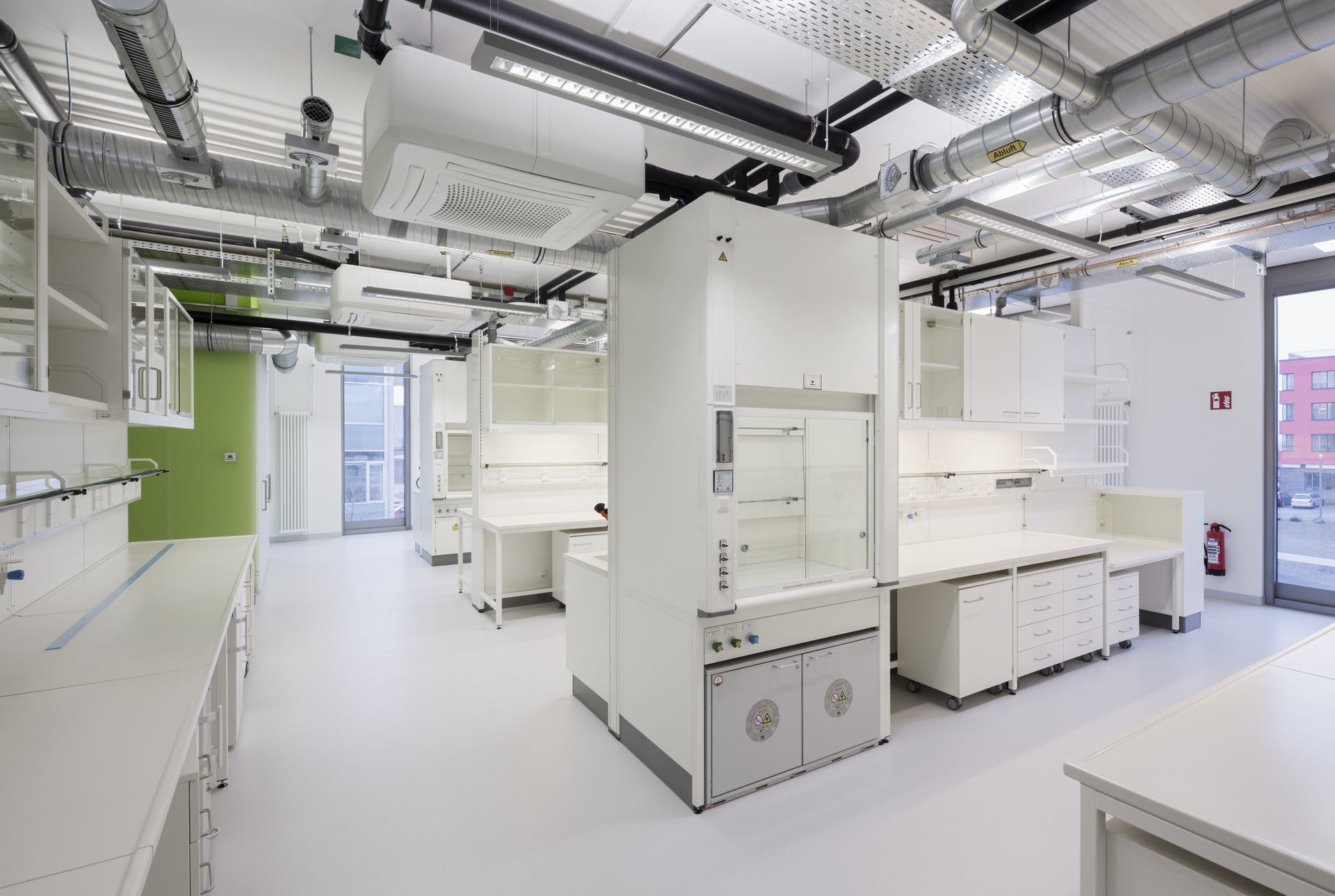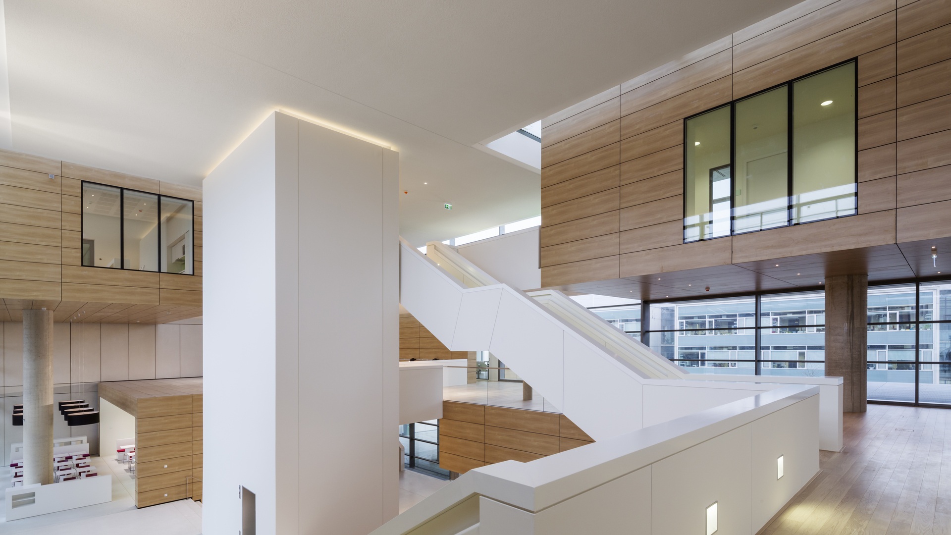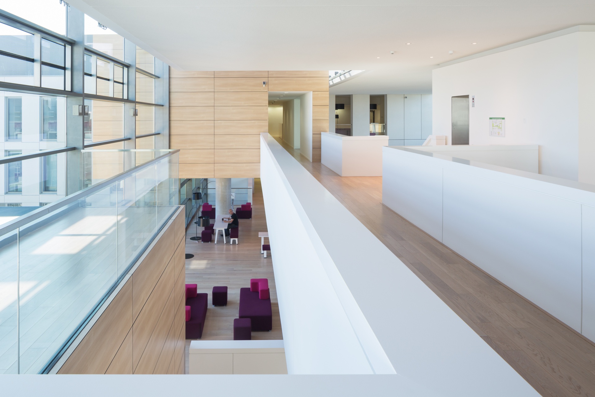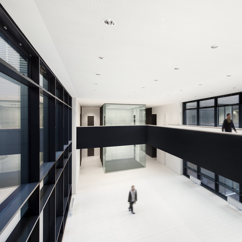 Bridges, galleries and floating boxes serve as communal space for meetings, exchanges and impromptu discussions among scientists and staff. The four-storey research building is separated into an office area and a highly equipped laboratory zone with flexible and divisible space for research. The two upper floors house the four departments. The ground floor houses the administrative offices, the central scientific facilities and the laboratories of the independent research groups.