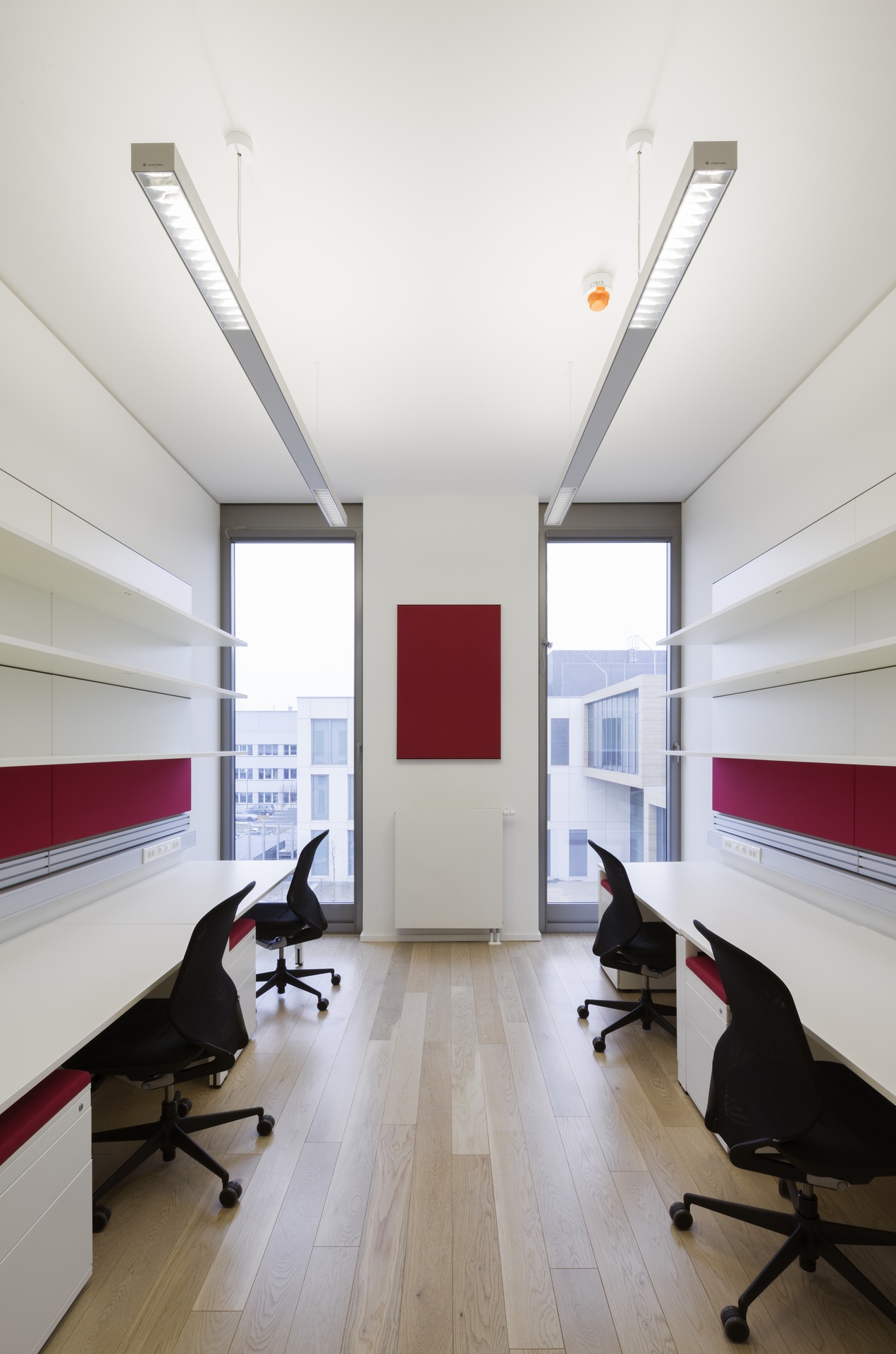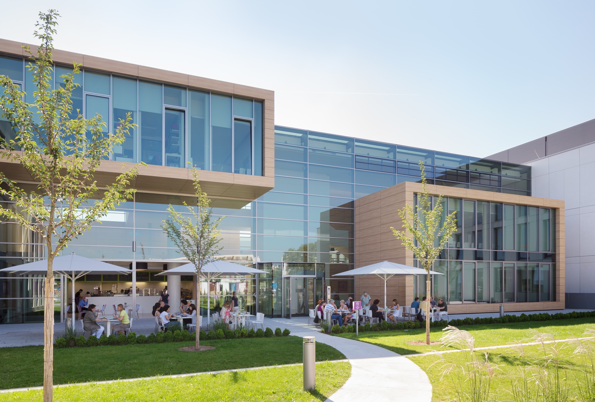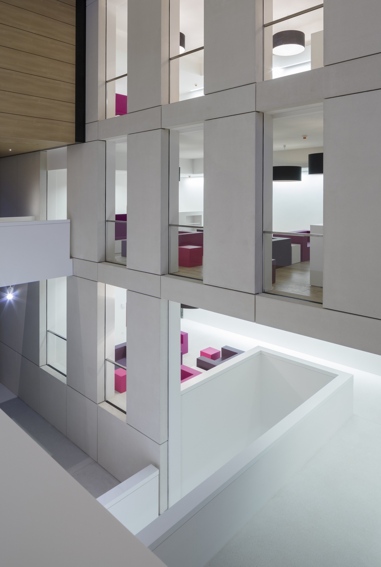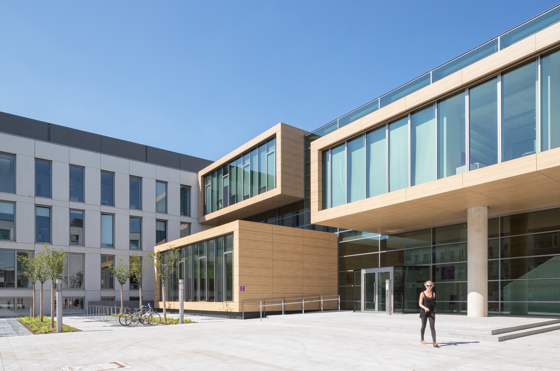 Bridges, galleries and floating boxes serve as communal space for meetings, exchanges and impromptu discussions among scientists and staff. The four-storey research building is separated into an office area and a highly equipped laboratory zone with flexible and divisible space for research. The two upper floors house the four departments. The ground floor houses the administrative offices, the central scientific facilities and the laboratories of the independent research groups.