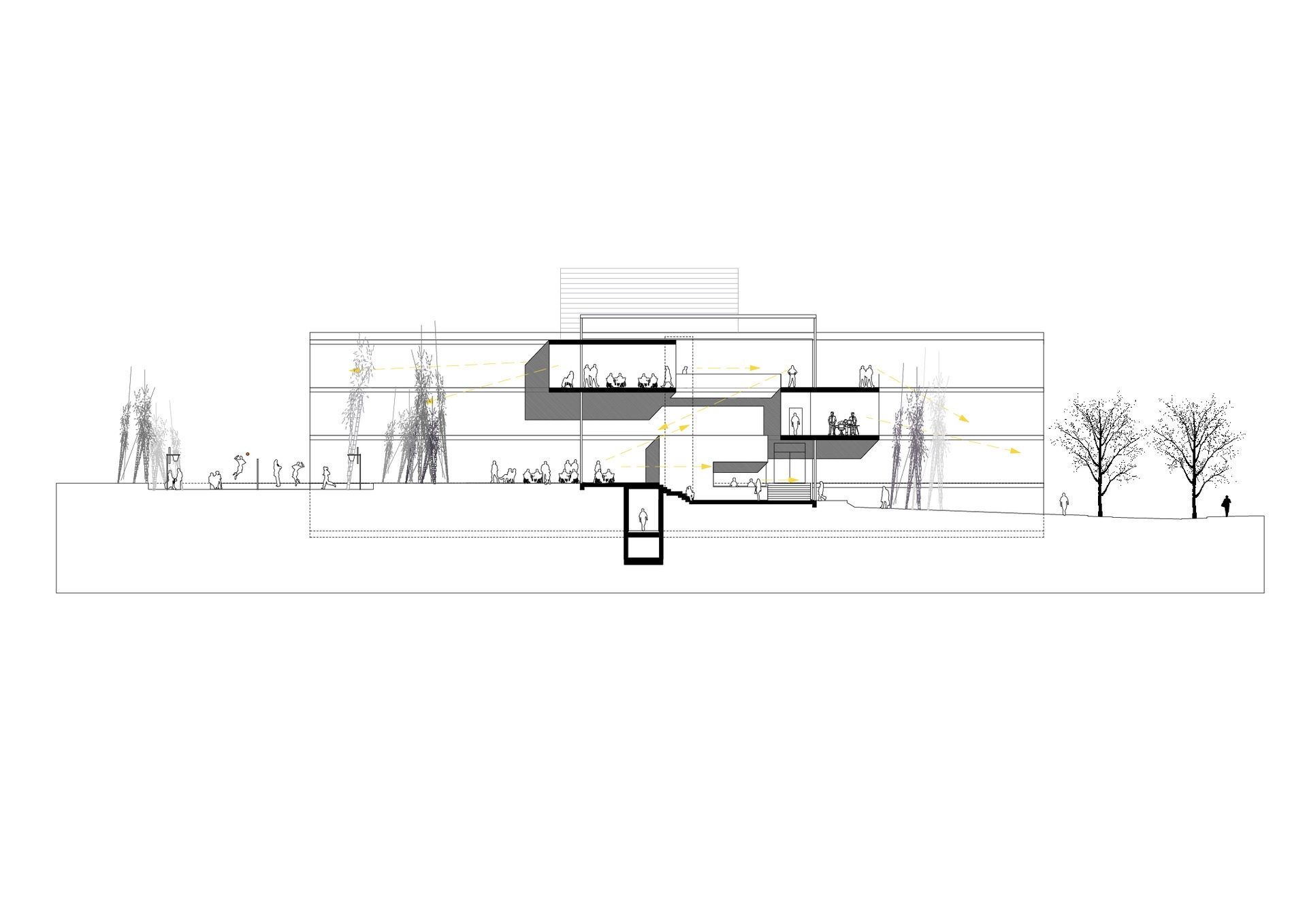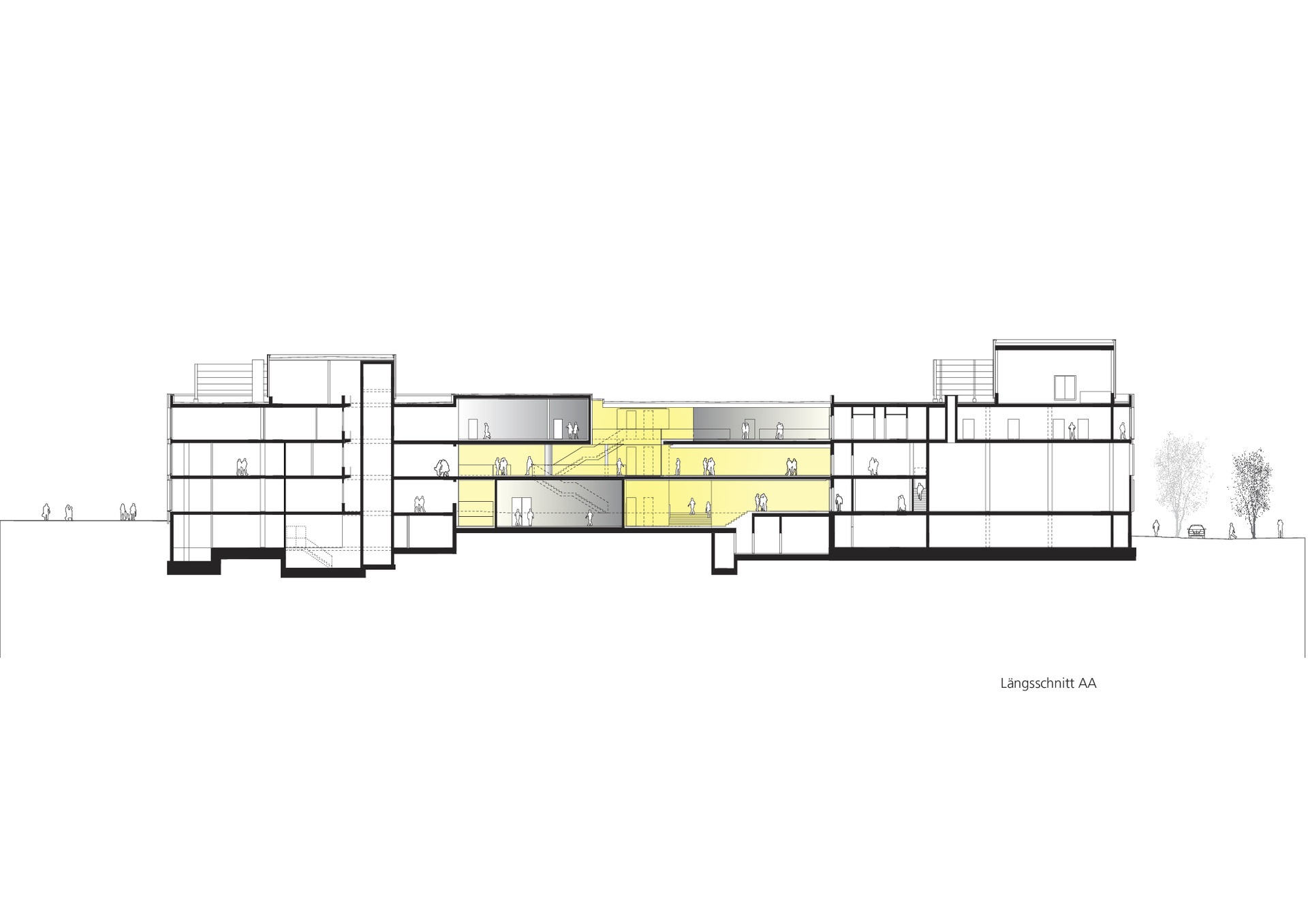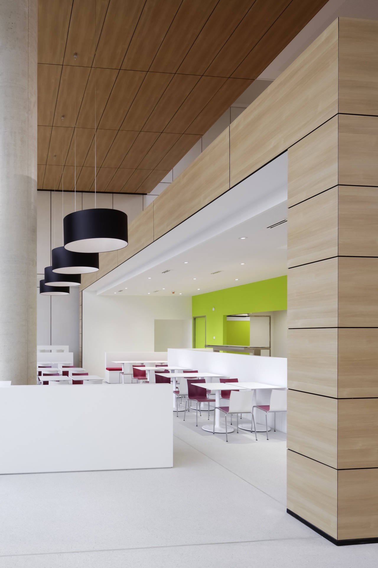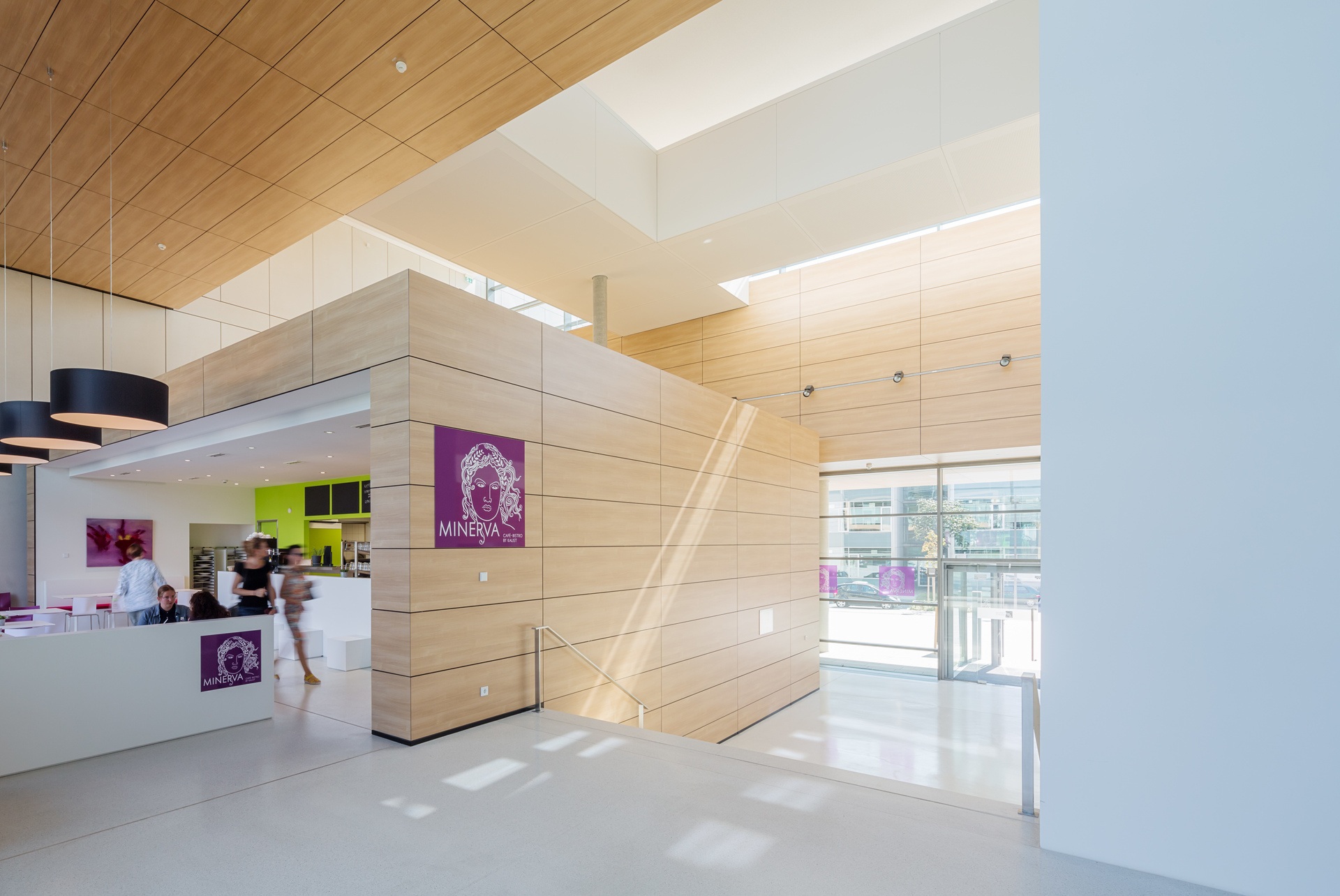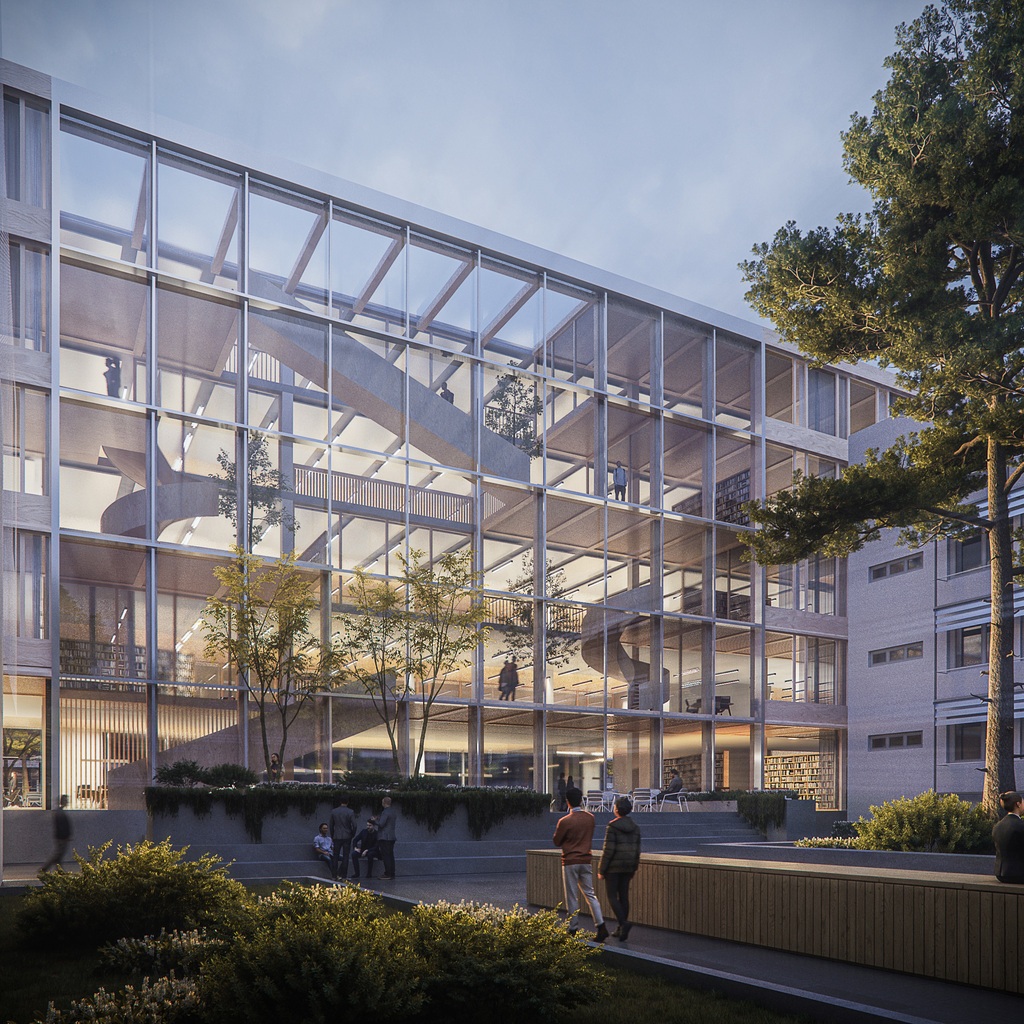 Bridges, galleries and floating boxes serve as communal space for meetings, exchanges and impromptu discussions among scientists and staff. The four-storey research building is separated into an office area and a highly equipped laboratory zone with flexible and divisible space for research. The two upper floors house the four departments. The ground floor houses the administrative offices, the central scientific facilities and the laboratories of the independent research groups.