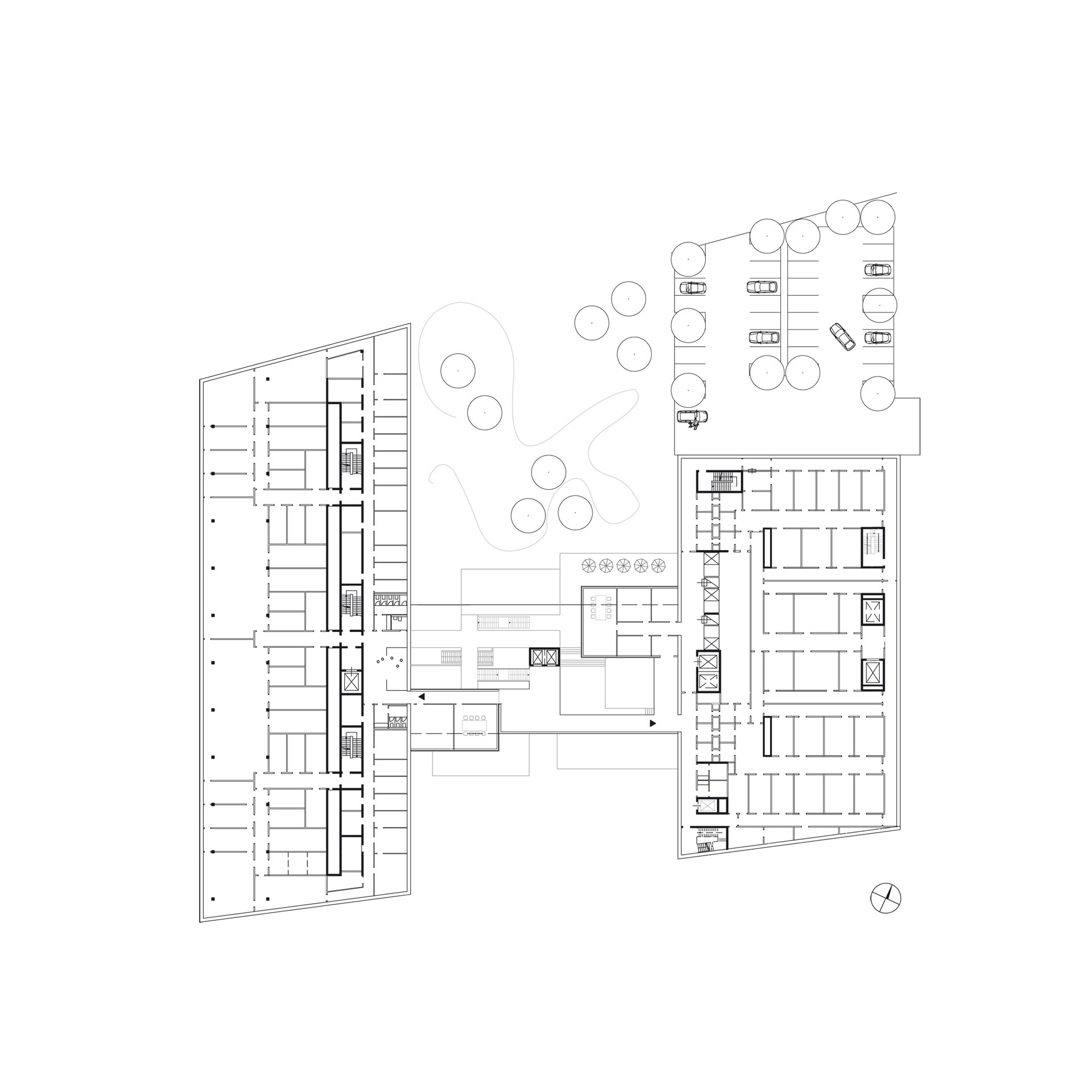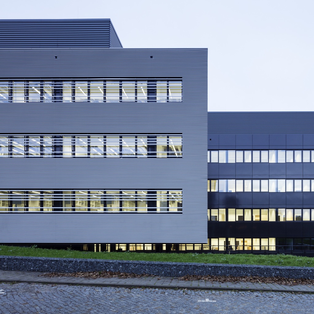 Interactive building complex for brain research: The Max Planck Institute for Brain Research is located on the Riedberg Campus in Frankfurt am Main. The design for this state-of-the-art research complex consists of two elongated and compact buildings, with long axes running approximately north to south, and short axes at an angle, aligned with the slant of the plot. A central open "foyer" links up the two buildings.